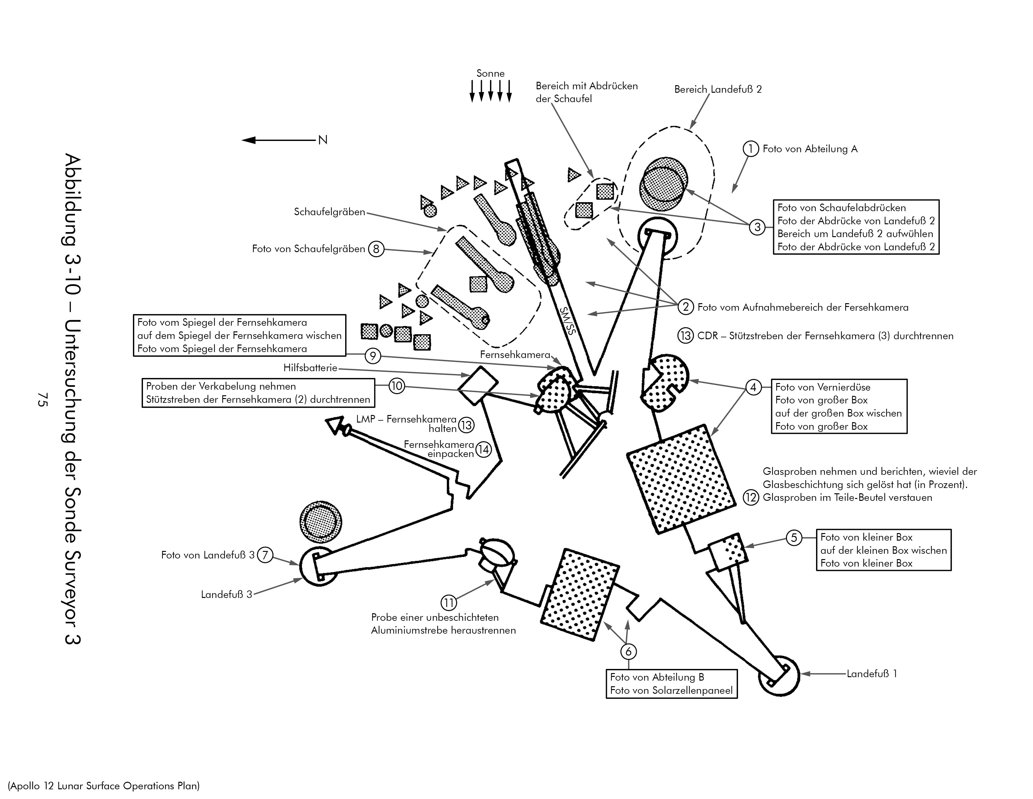 so interpretieren, als wollen sie am Kraterrand bis zu einer Stelle genau oberhalb der Sonde entlanglaufen und erst dann auf direktem Weg absteigen. Tatsächlich möchte Pete aber nur etwa die Hälfte des Weges zu Surveyor 3 oben am Rand zurücklegen, bevor sie in den Krater einsteigen. Die letzten 300 Fuß (91 m) gehen sie ebenfalls nicht direkt darauf zu, sondern bleiben fast parallel zum Rand und gestalten so den Abstieg etwas flacher. An einem Punkt noch oberhalb der Sonde, etwa auf halber Strecke bis zum Kraterrand, halten sie kurz an und machen einige Fotos, bevor sie die letzten Meter zurücklegen. AS12-48-7145 hat Al später auf dem Weg zurück zum LM