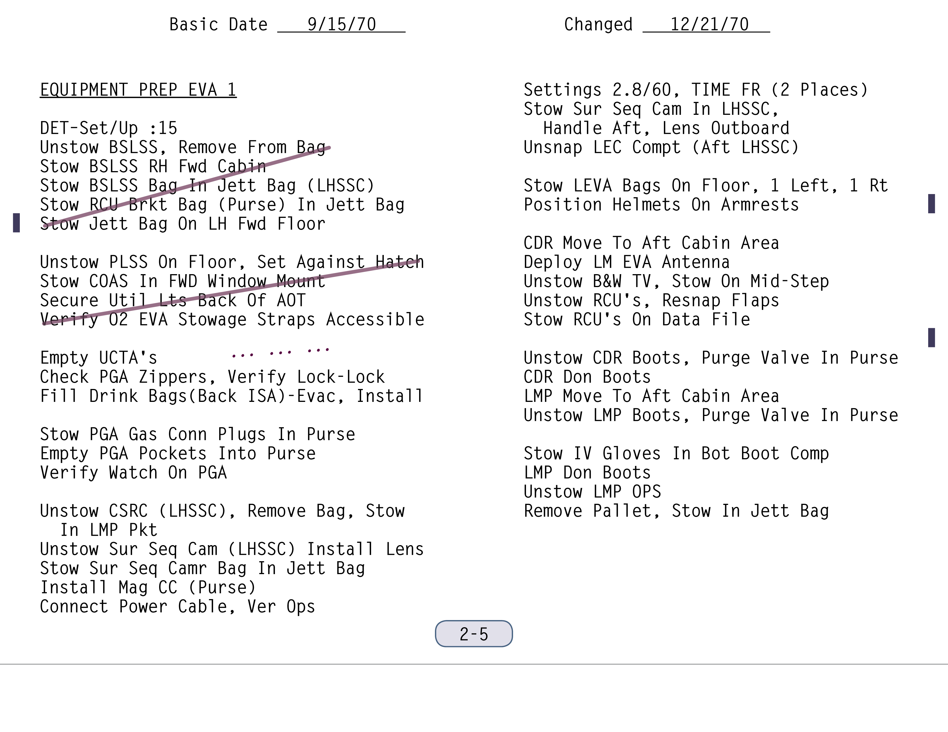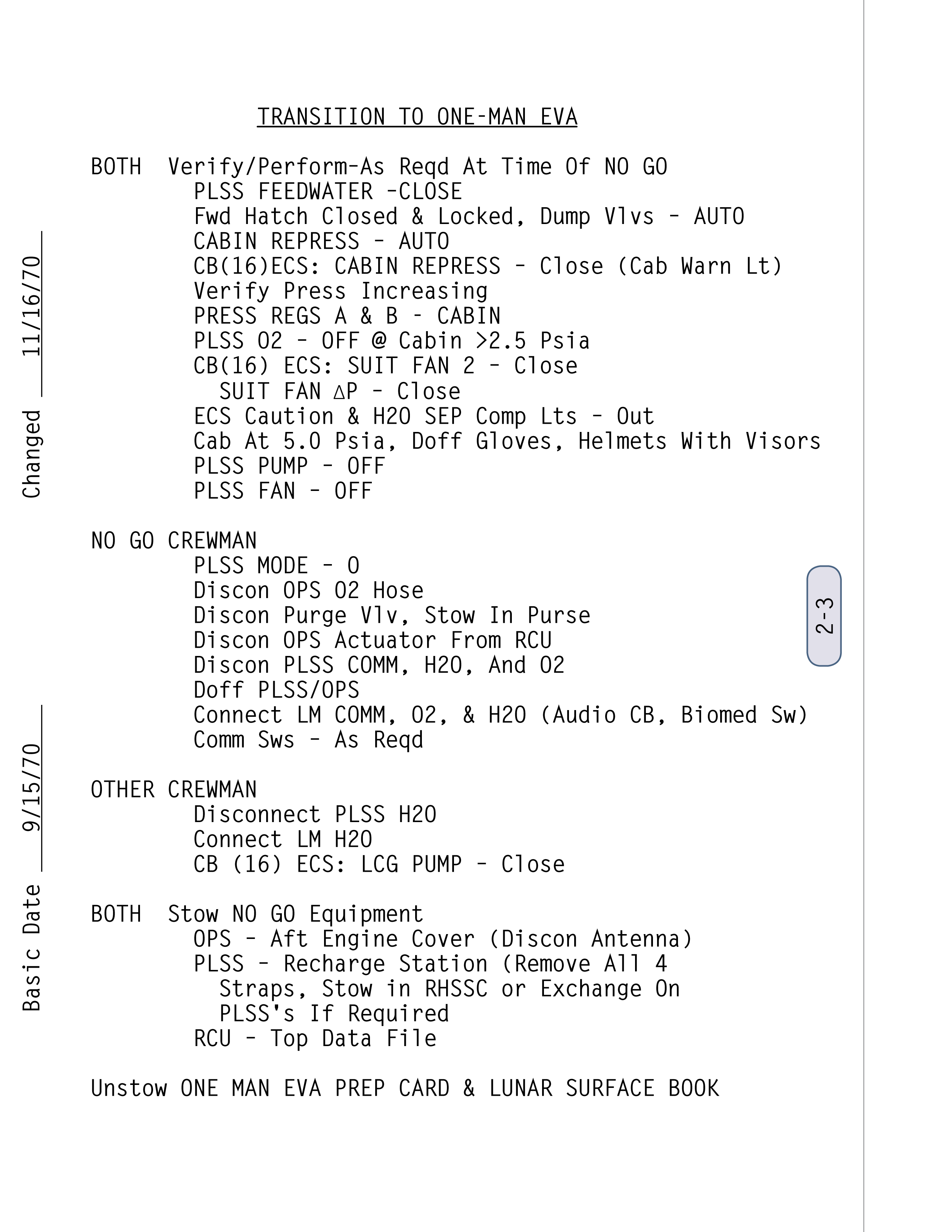 EVAExtravehicular Activity und danach war gut, weil sie sich aufhängen ließ. Sie hing genau in der Mitte vor dem Instrumentenpaneel, damit wir beide sie gut lesen und die Schritte nacheinander abarbeiten konnten. Wir hatten alles in sinnvollen Abschnitten zusammengefasst. Dadurch war es leichter, dem Ablauf zu folgen. Am Kap verbrachten wir eine Menge Zeit im Trainingsmodell (der LM