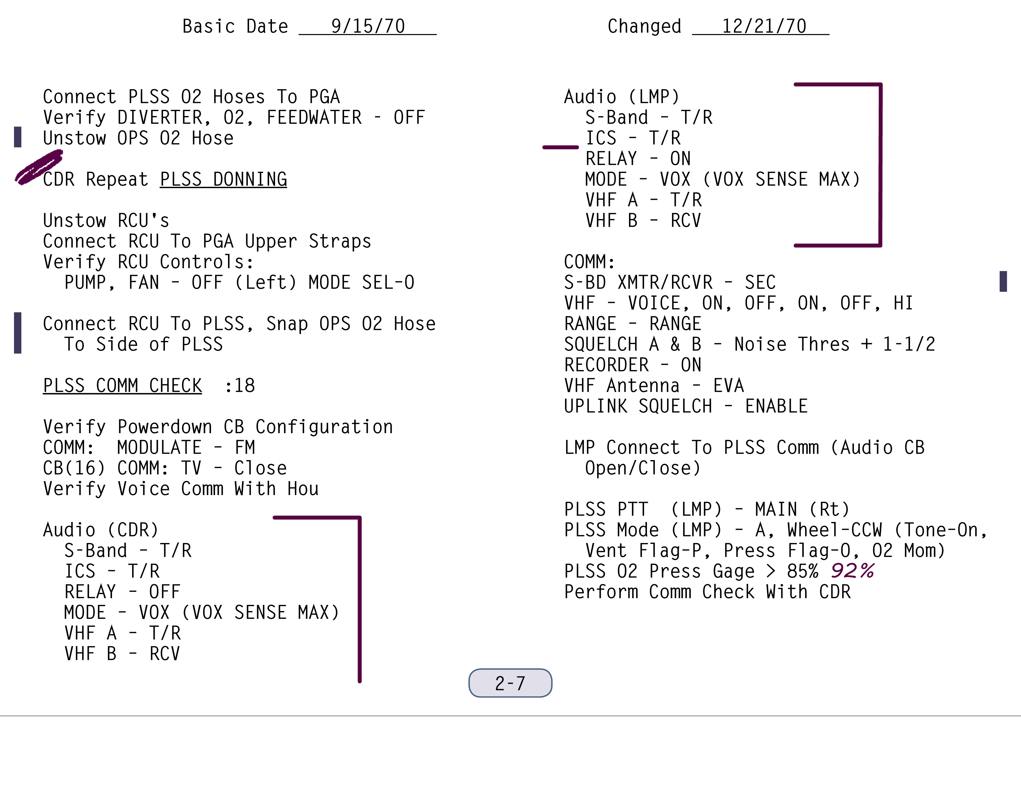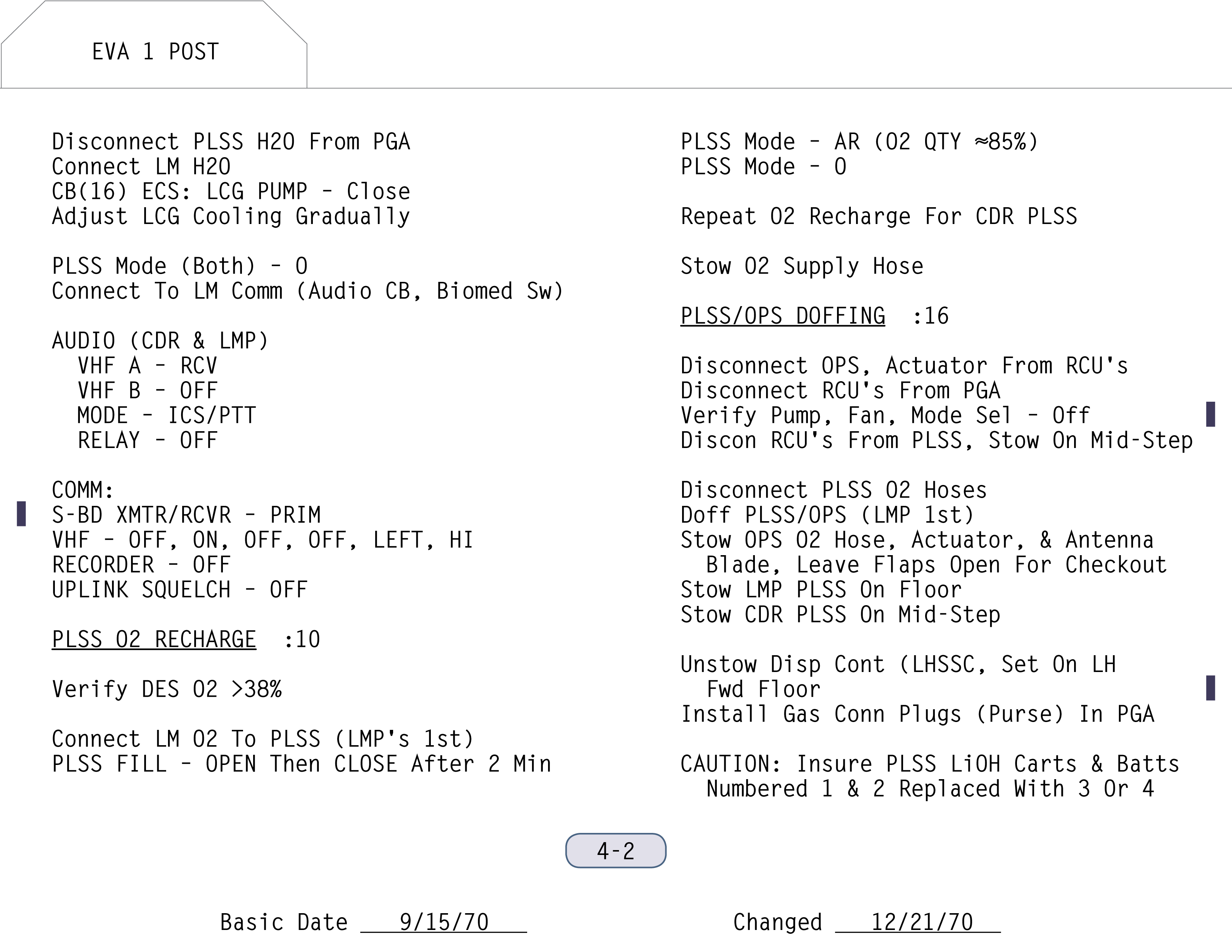 RCURemote Control Unit-Warnanzeigen für Druck (O) und O2 (O) verschwinden. Sobald im Anzug ein relativer Überdruck zwischen 3,7 und 4,0 psig (0,26 bzw. 0,28 bar) herrscht, schließen sie das Sauerstoffventil am PLSS wieder und beobachten lang den Druckverlust. Aufgrund von minimalen Undichtigkeiten, dem Auffüllen der letzten Winkel und Falten im Anzugfutter sowie durch Abatmen wird eine Verringerung von bis zu 0,3 psig (0,02 bar) toleriert. Hat der Anzug seinen Test auf Dichtigkeit bestanden, kann der Kabinendruck abgelassen und die Luke geöffnet werden.