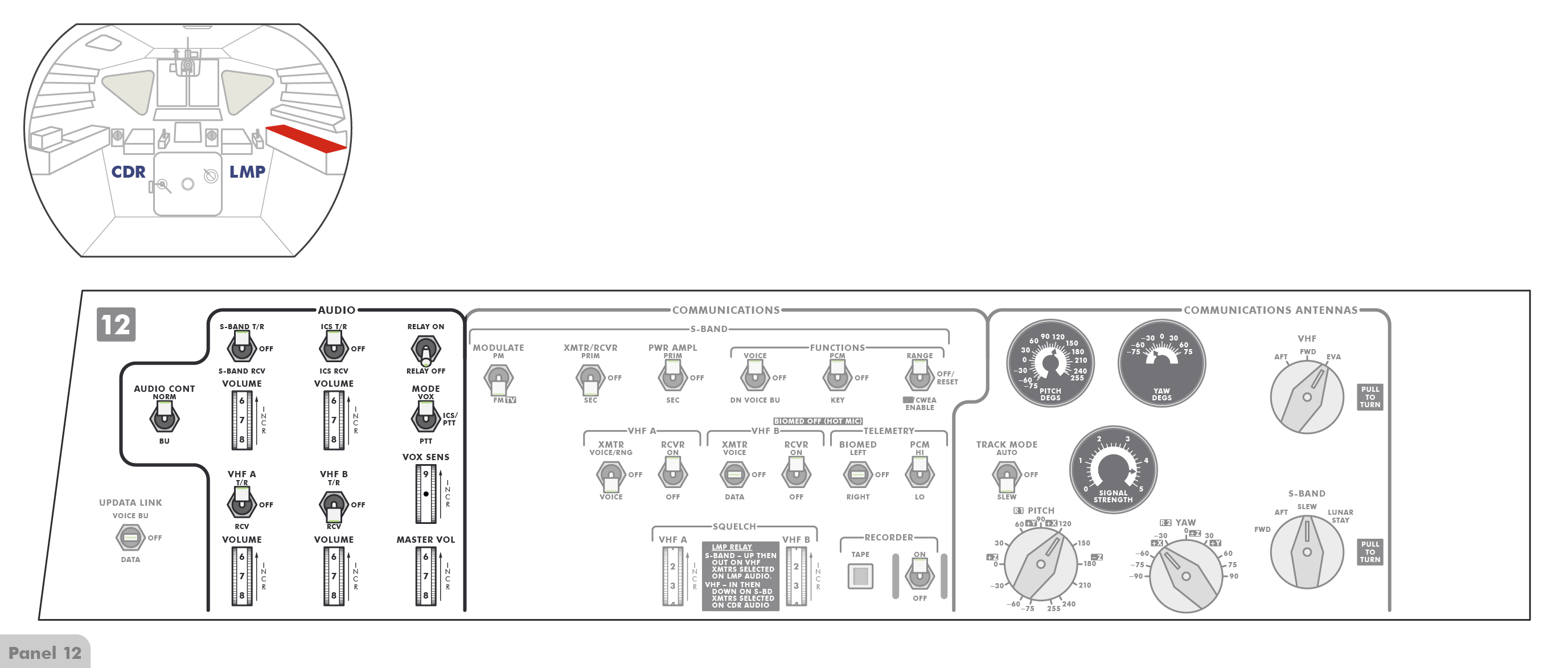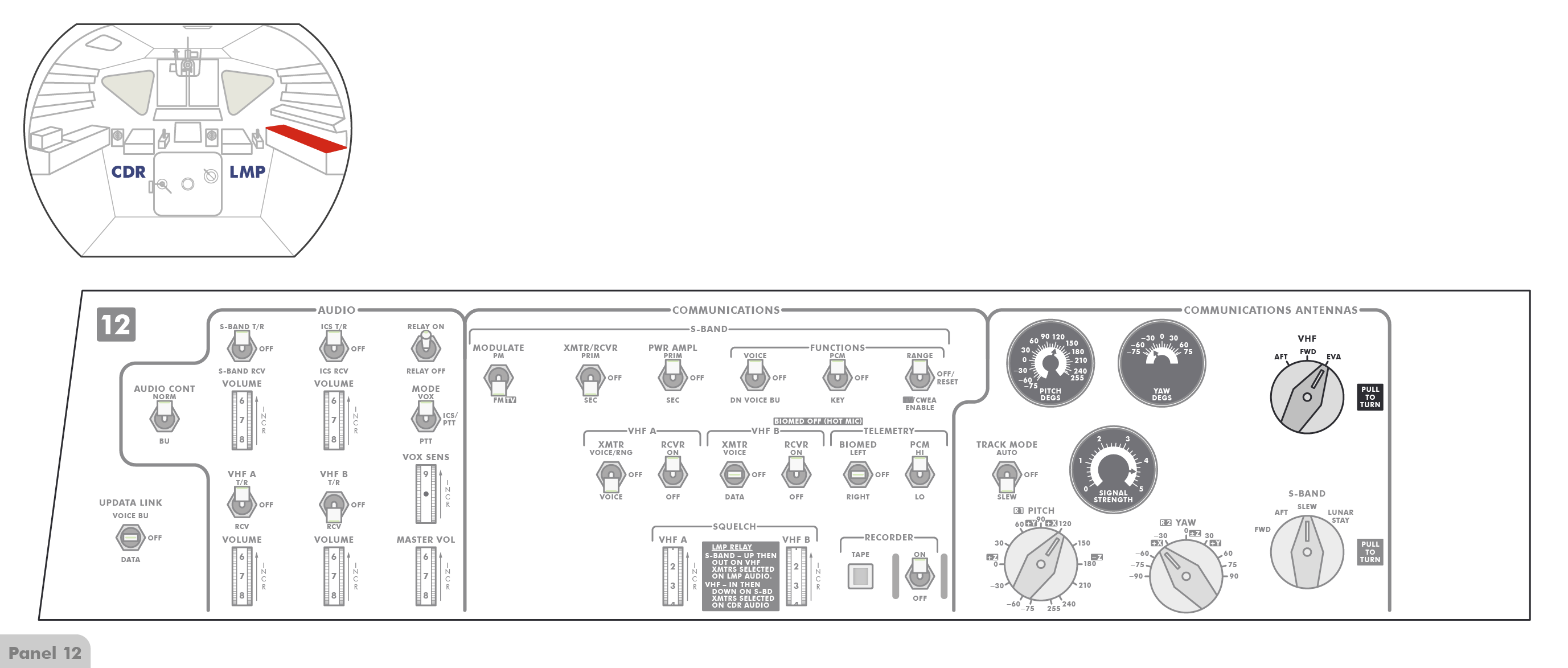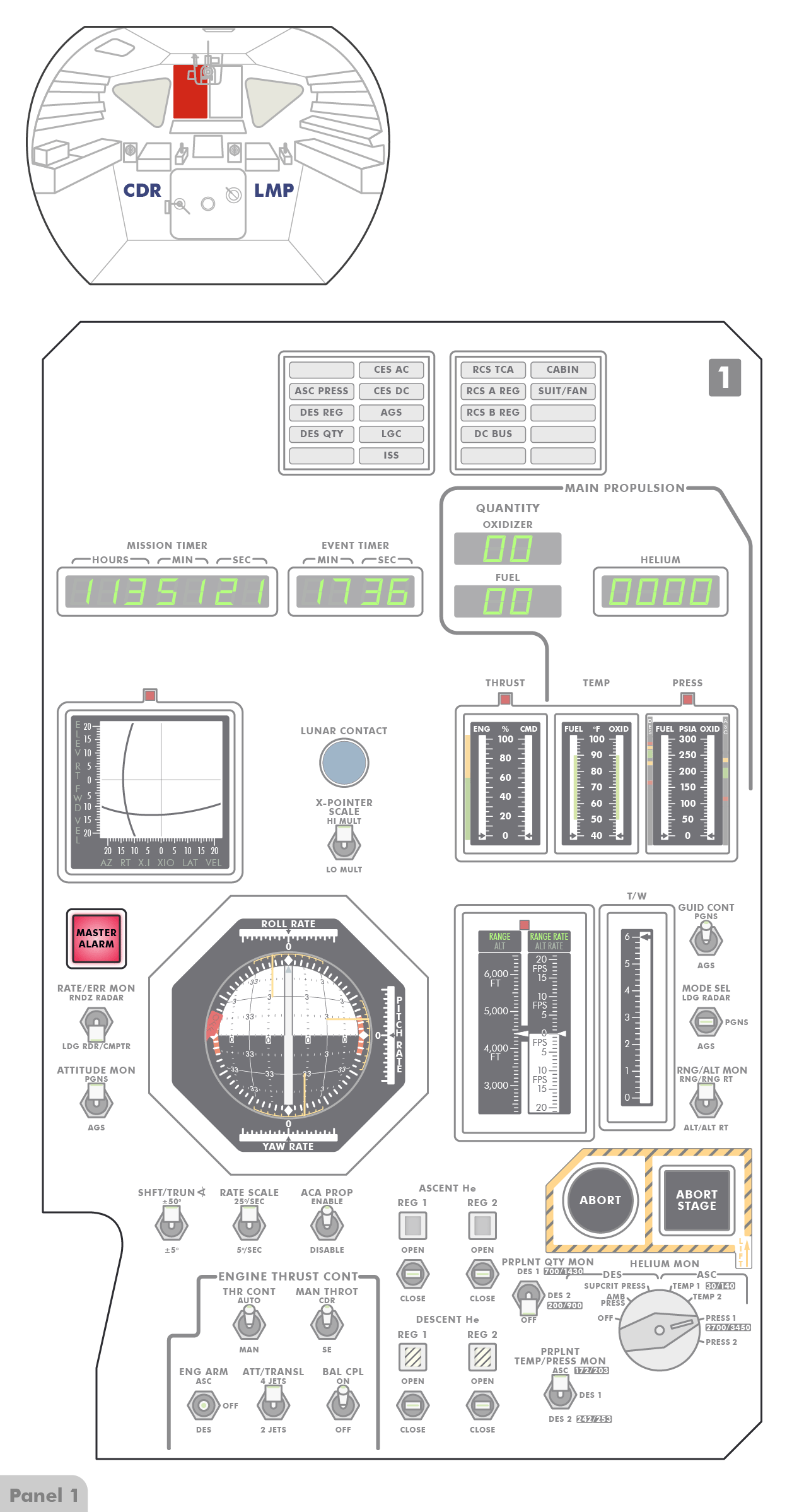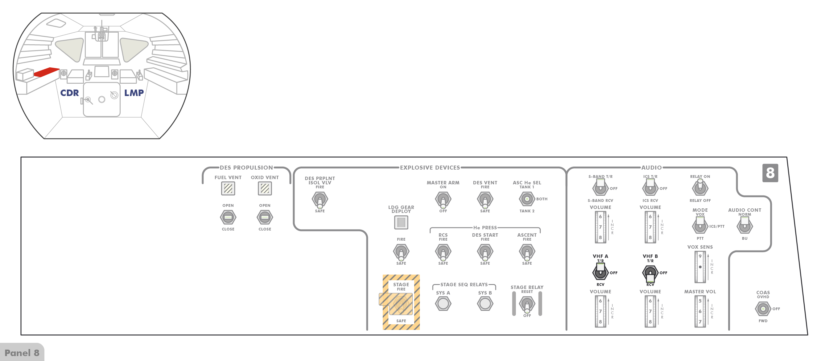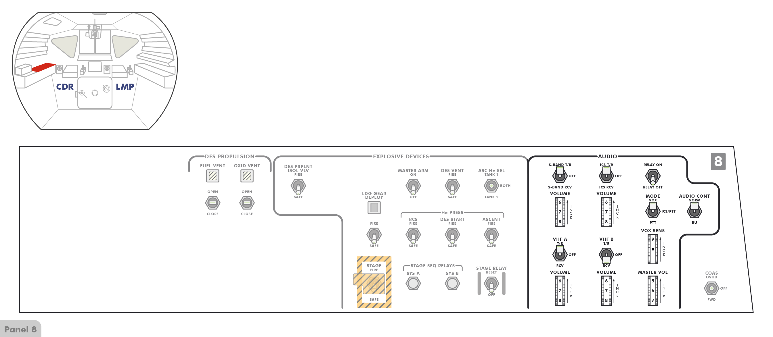PTTPush-to-Talk stehen (Paneel 8), sodass die Astronauten erst einen Knopf drücken müssen, wenn sie mit Houston sprechen wollen. Offenbar hat Al jedoch den Schalter versehentlich angestoßen und dabei nach oben