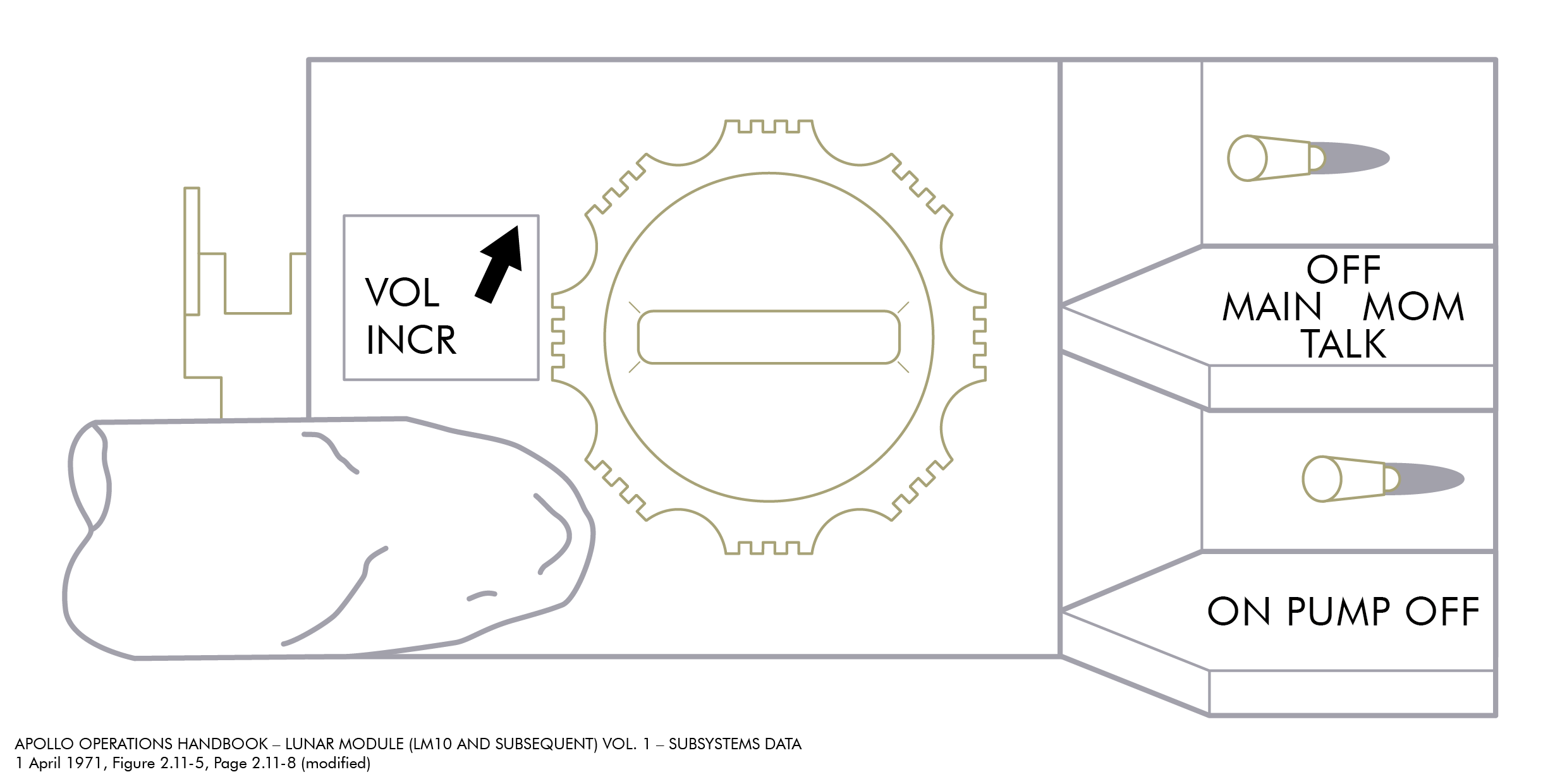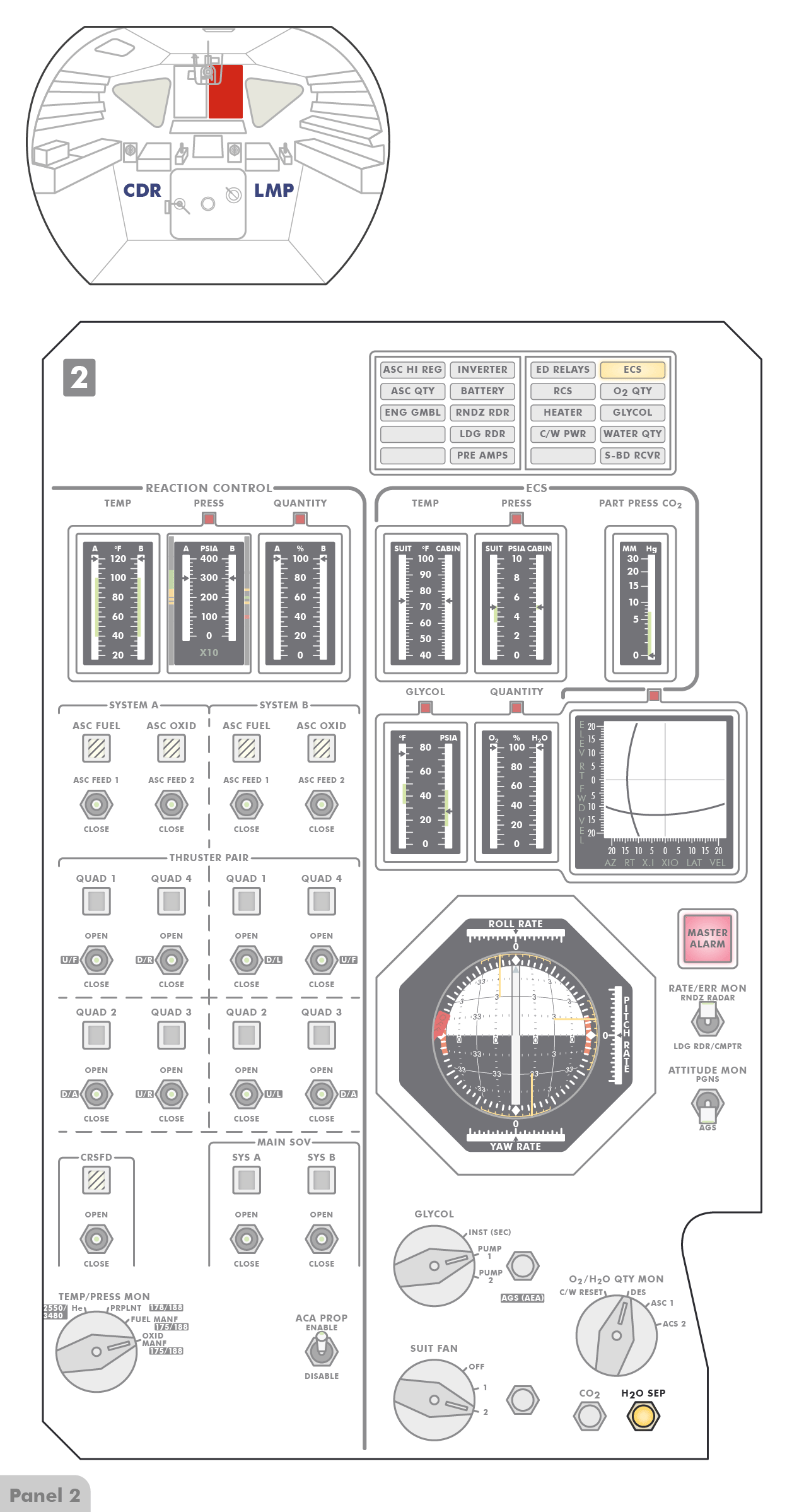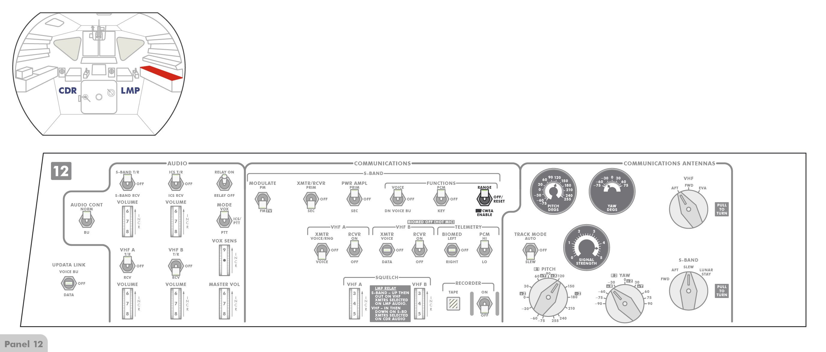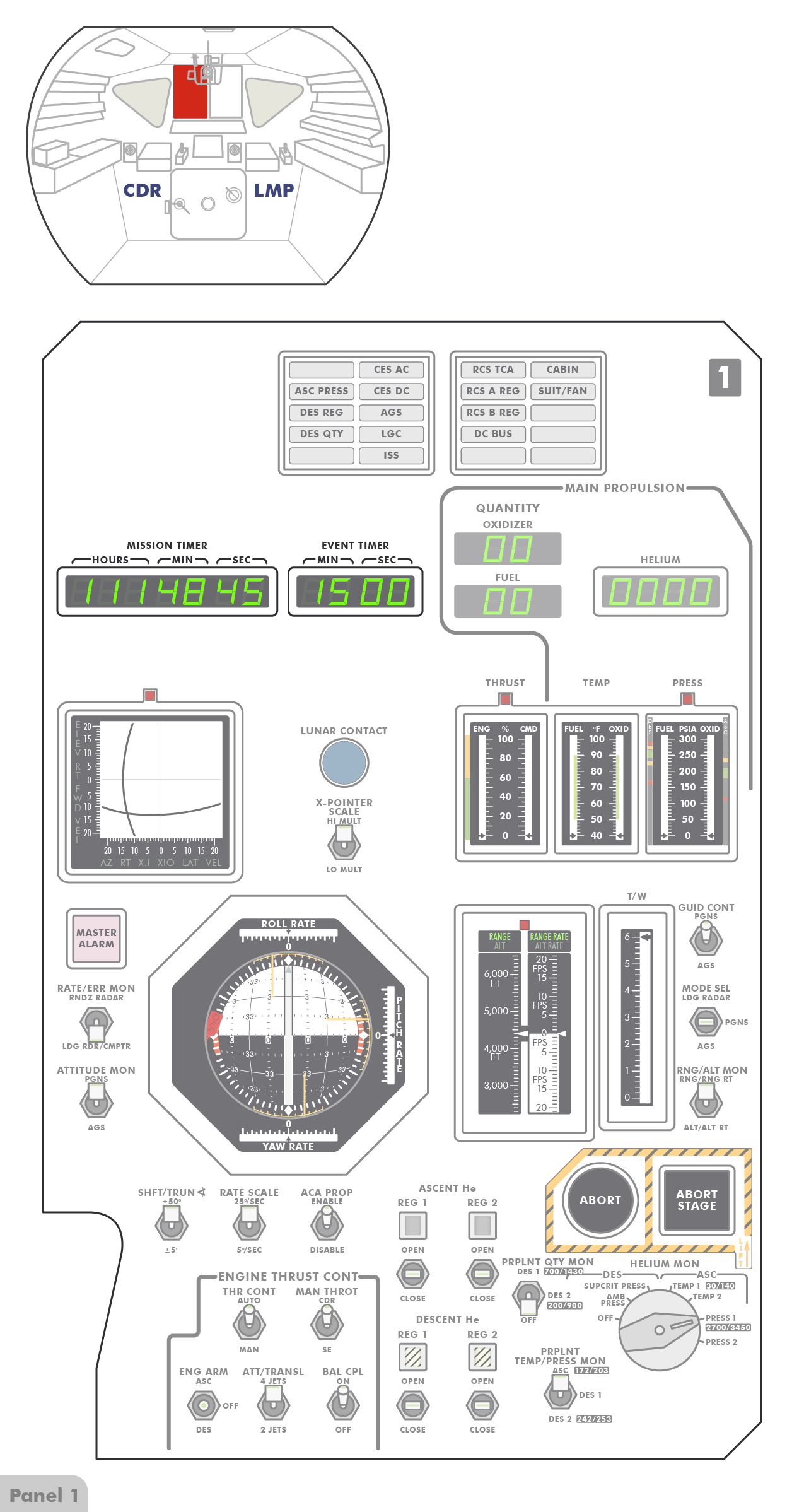 PTTPush-to-Talk stehen (Paneel 8), sodass die Astronauten erst einen Knopf drücken müssen, wenn sie mit Houston sprechen wollen. Offenbar hat Al jedoch den Schalter versehentlich angestoßen und dabei nach oben