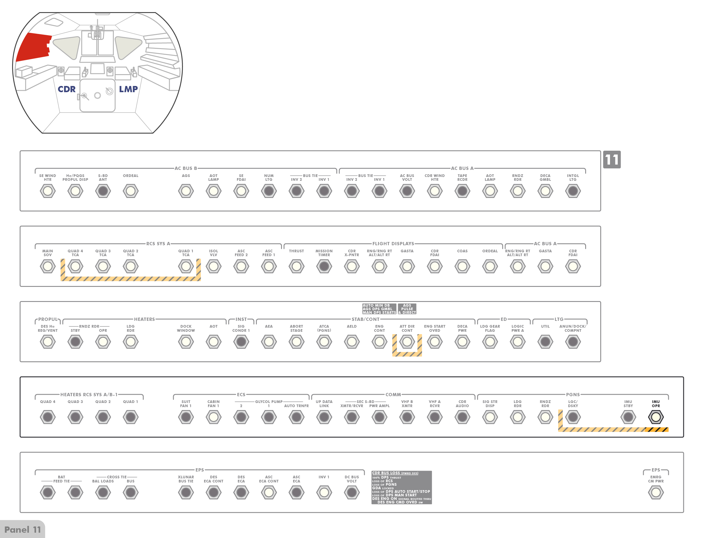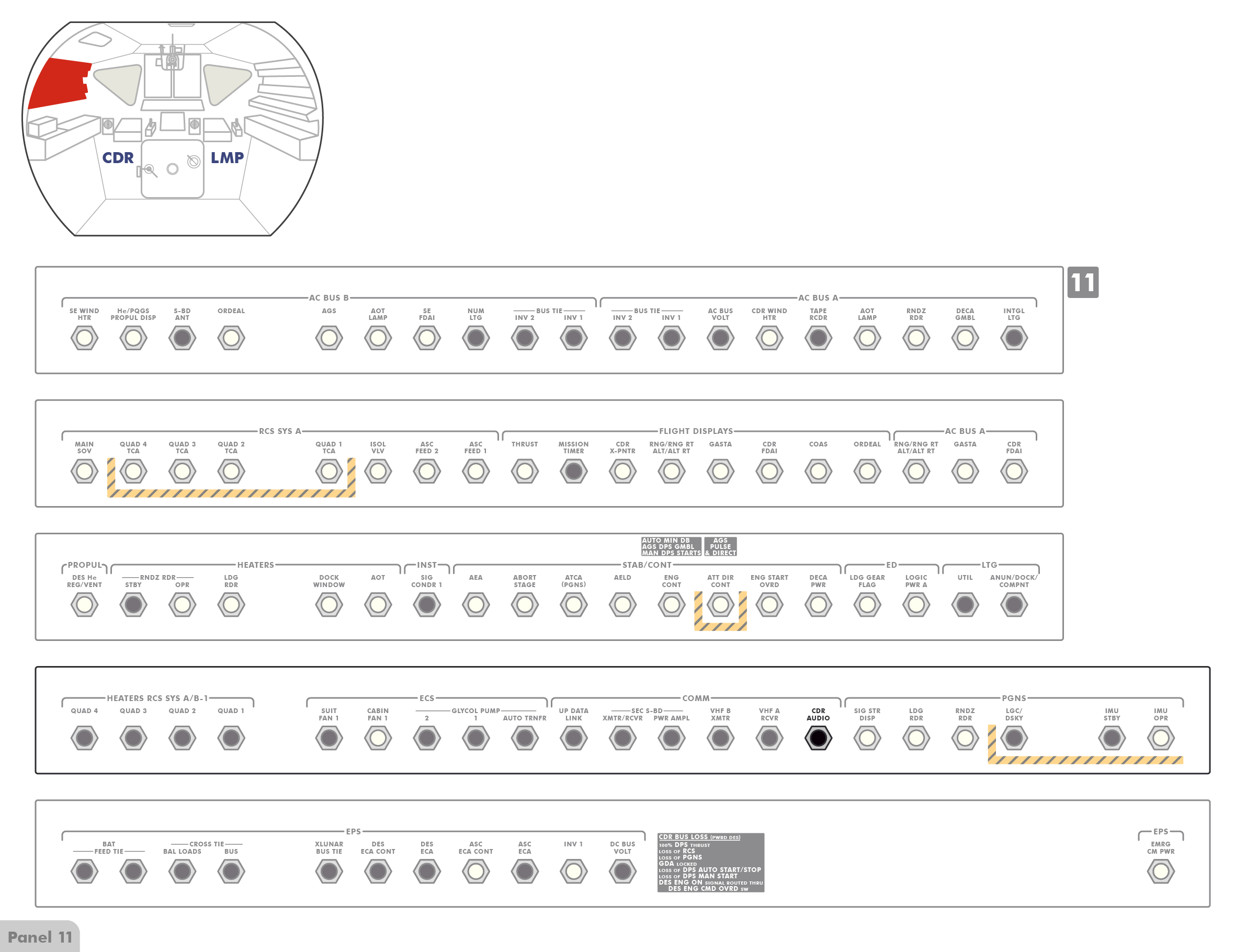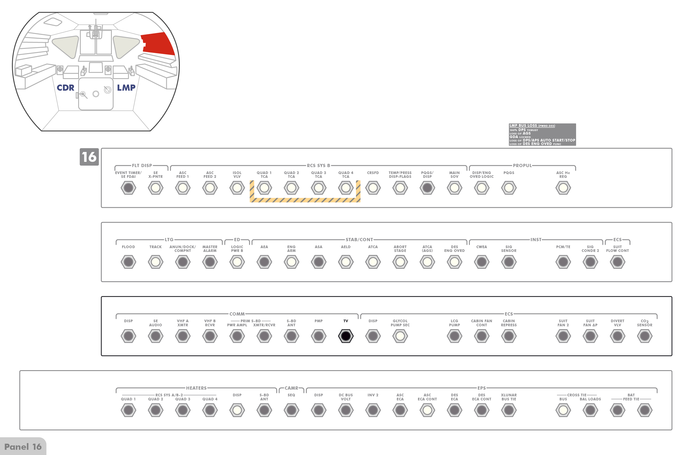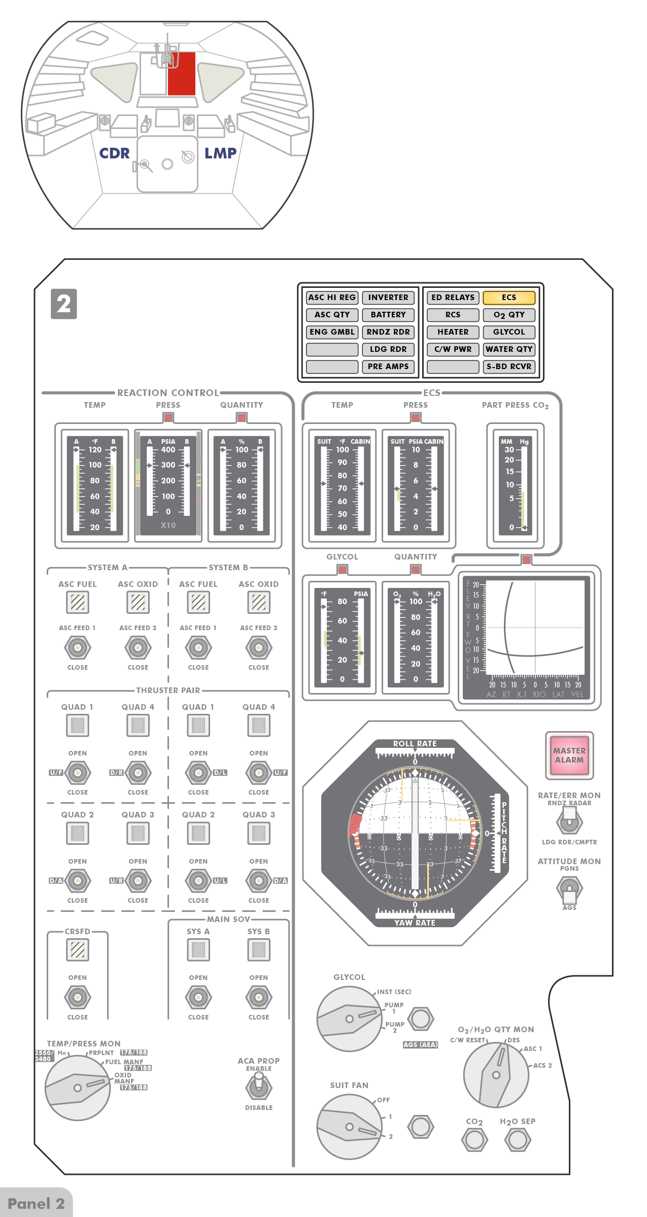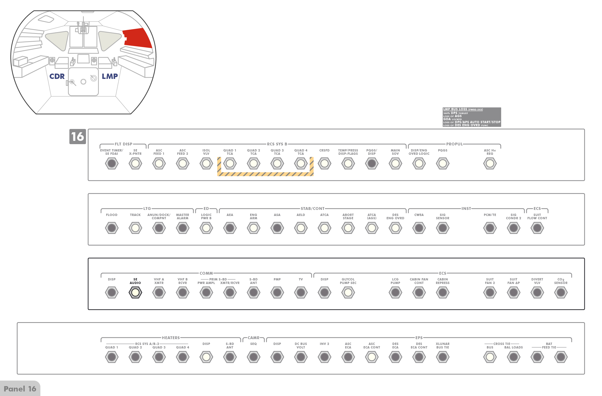 PTTPush-to-Talk stehen (Paneel 8), sodass die Astronauten erst einen Knopf drücken müssen, wenn sie mit Houston sprechen wollen. Offenbar hat Al jedoch den Schalter versehentlich angestoßen und dabei nach oben