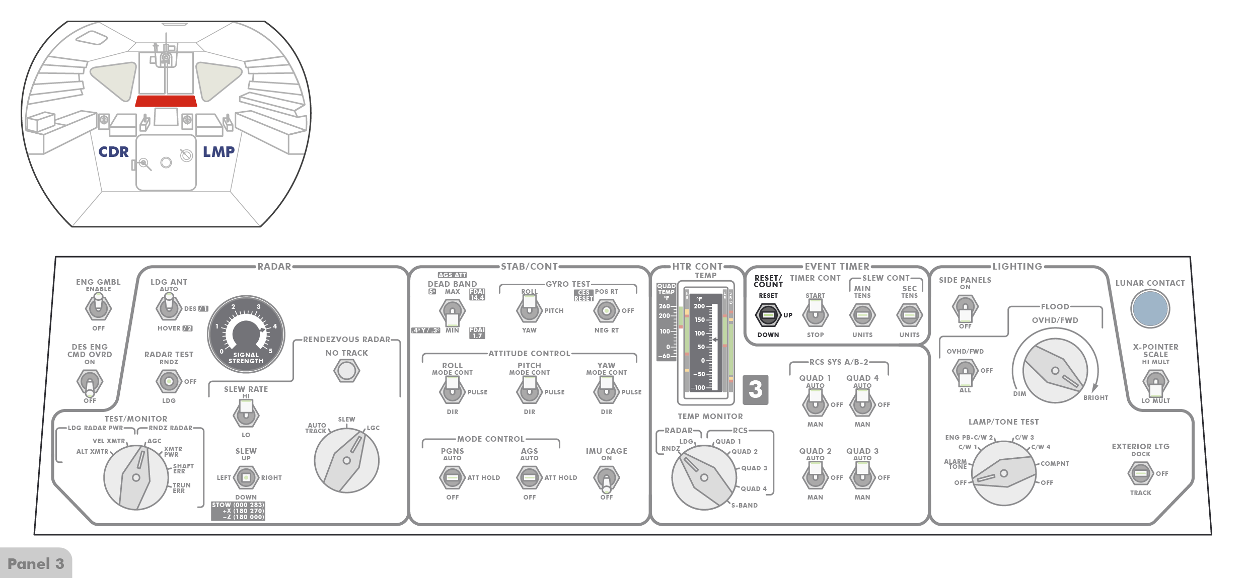 PrepPreparation & Post Card vor das Instrumentenpaneel gehängt. So können sie alle Schritte nacheinander ablesen, ohne ständig die Checkliste für die Mondoberfläche (Apollo 14 LM Lunar Surface Checklist) umblättern zu müssen.