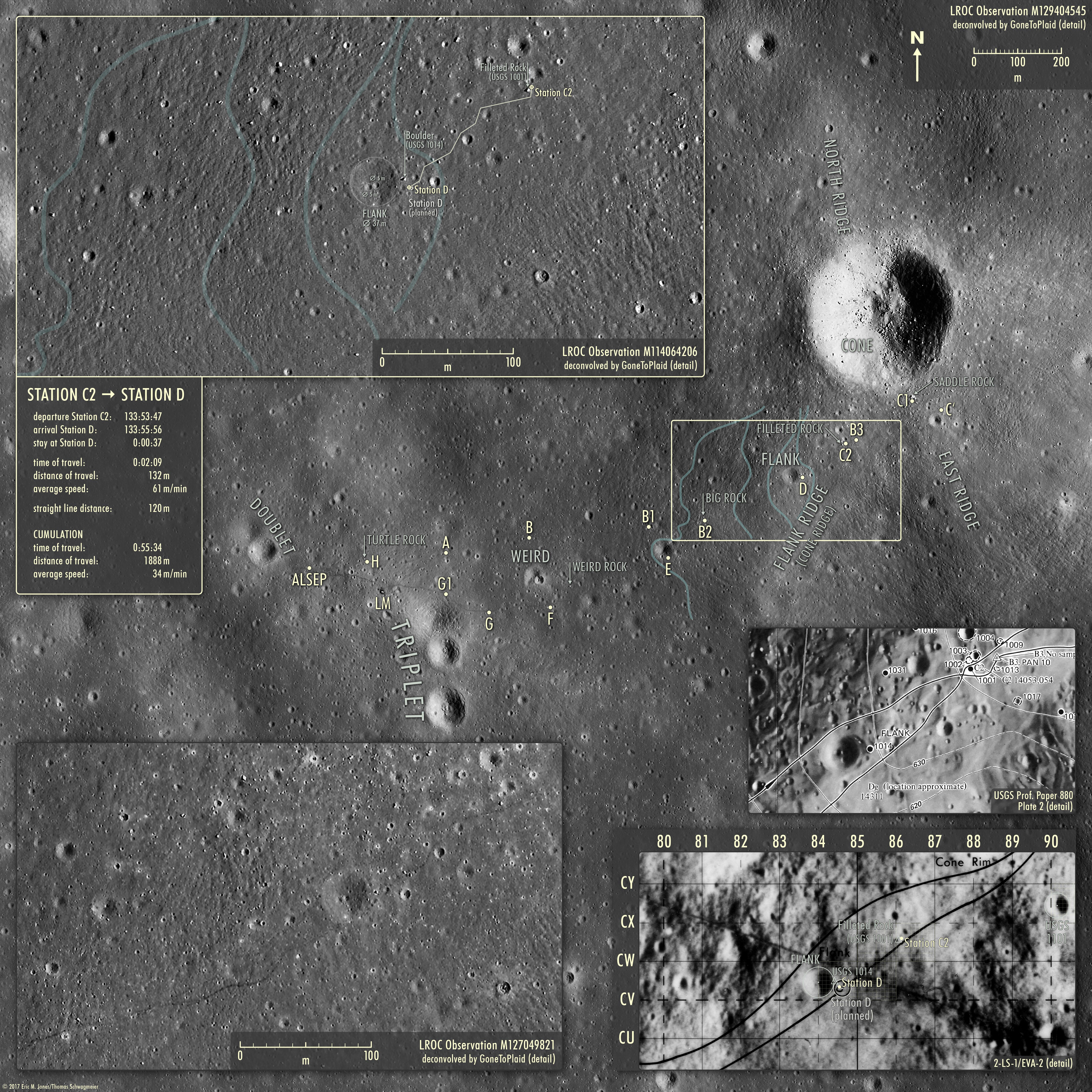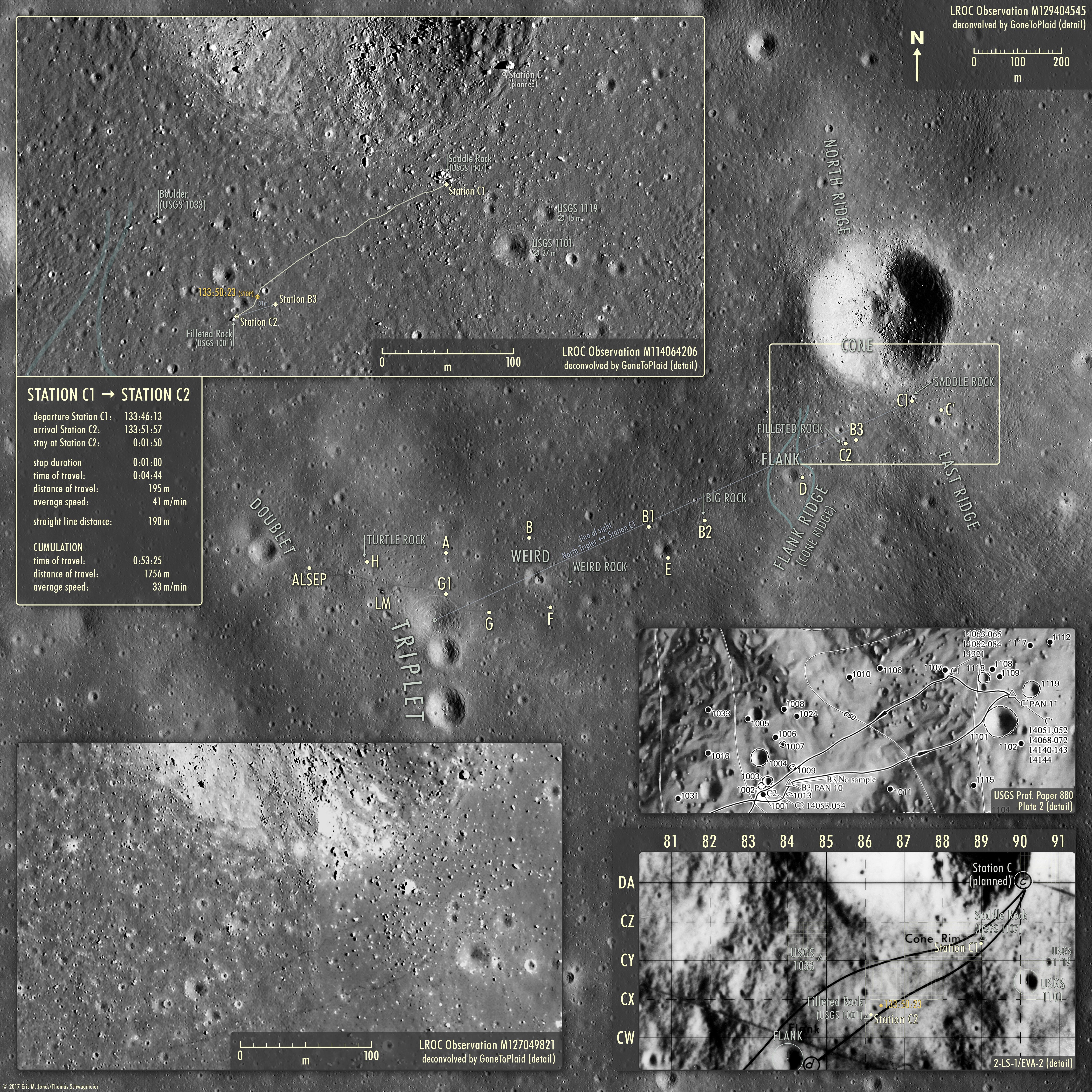Das ist Station C2, ungefähr bei den Koordinaten CW,6/86,1 auf Karte 2-LS-1/EVA-2 (Ausschnitt des östlichen Teils). Siehe auch die Karte der Strecke von Station C1 bis Station C2 (Jones/Schwagmeier). Sie befinden sich etwa 30 Meter westlich von Station B3. Saddle Rock haben sie bei verlassen, unterwegs und somit 195 Meter in und geschafft. Das ergibt einen Schnitt von 41 m/min.