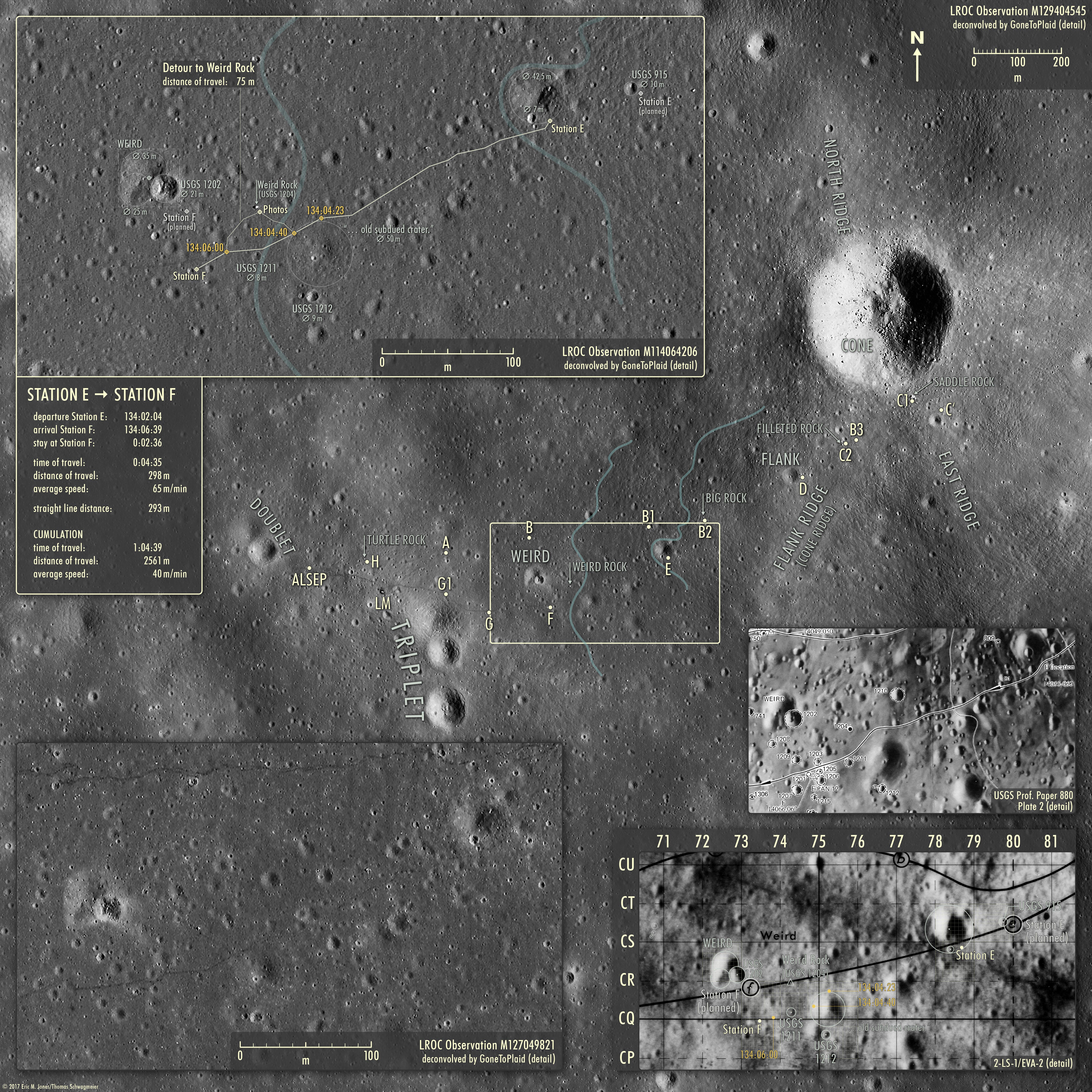 Von Station D bis hier waren Al und Ed knapp unterwegs und haben 290 Meter zurückgelegt, im Schnitt also 83 m/min (siehe Karte der Strecke von Station D bis Station E [Jones/Schwagmeier]). Sie sind jetzt ca. 35 Meter nördlich des Kraters 915 auf der USGS