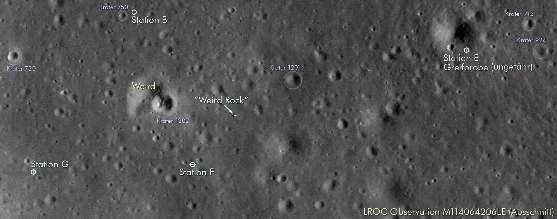 USGSUnited States Geological Survey-Karte (Ausschnitt) und auf Karte 2-LS-1/EVA-2 (Ausschnitt des westlichen Teils) bei den Koordinaten CR,0/74,3 zu finden. Von dem Felsbrocken macht Al drei Aufnahmen: AS14-64-9134, AS14-64-9135 und AS14-64-9136. Die Bilder hat David Harland für ein Portrait von Weird Rock verwendet. Siehe auch die Karte der Strecke von Station E bis Station F (Jones/Schwagmeier).