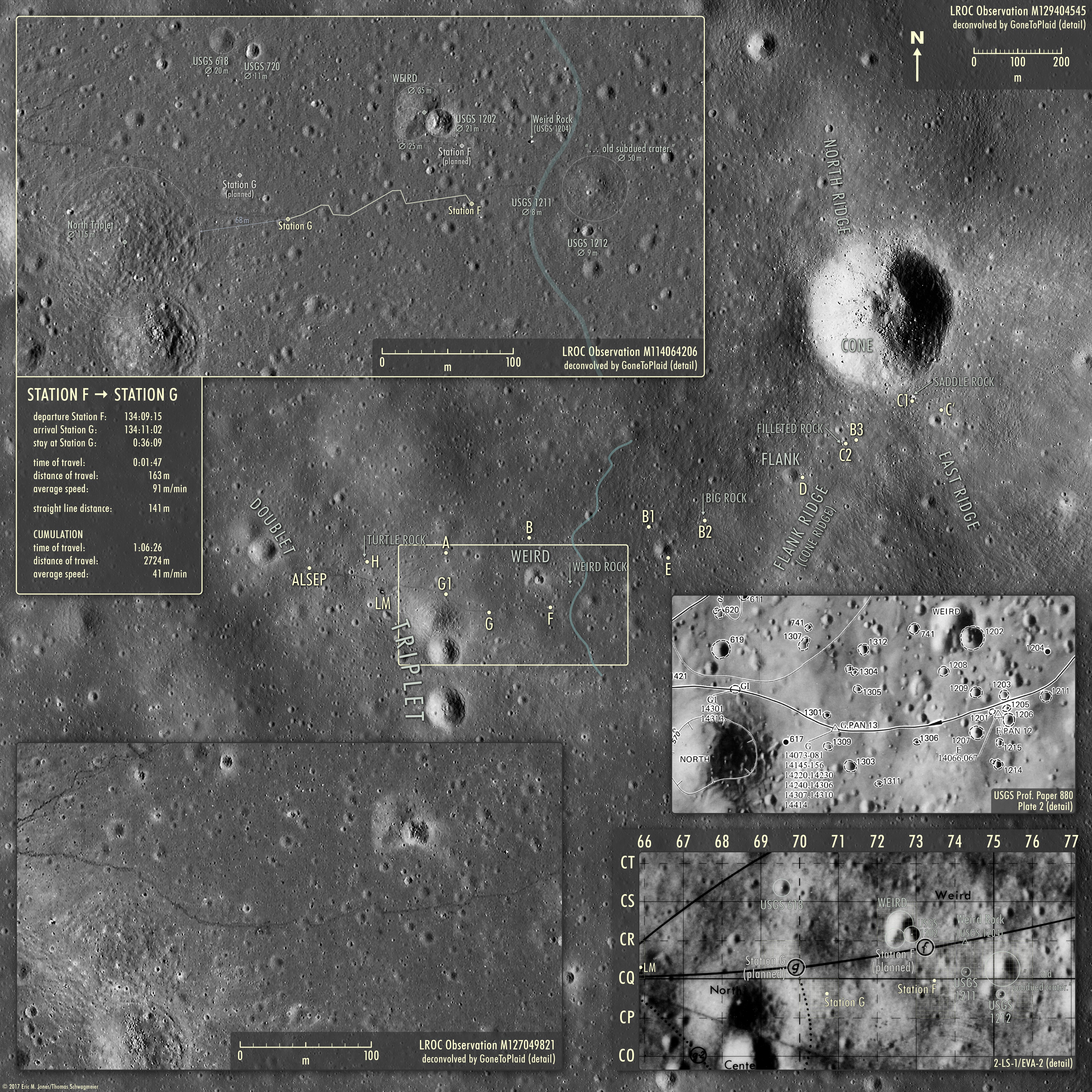 Al und Ed haben Station G erreicht. Die Auswertung nach dem Flug ergab die Koordinaten CP,6/70,7 auf Karte 2-LS-1/EVA-2 (Ausschnitt des westlichen Teils). Siehe auch die Karte der Strecke von Station F bis Station G (Jones/Schwagmeier). Dort befinden sie sich allerdings nur etwas mehr als einen halben Kraterdurchmesser östlich von Krater Nord-Triplet. Eine Methode zur Bestimmung des Abstands wäre, den Winkel zu schätzen, über den sich der Krater von einer Seite zur anderen im Sichtfeld erstreckt. Im Abstand vom 1,5-fachen Kraterdurchmesser zur Kratermitte – somit einen Kraterdurchmesser bis zum Rand – sind es circa 40 Grad, beim 2,5-fachen Durchmesser etwa 23 Grad.