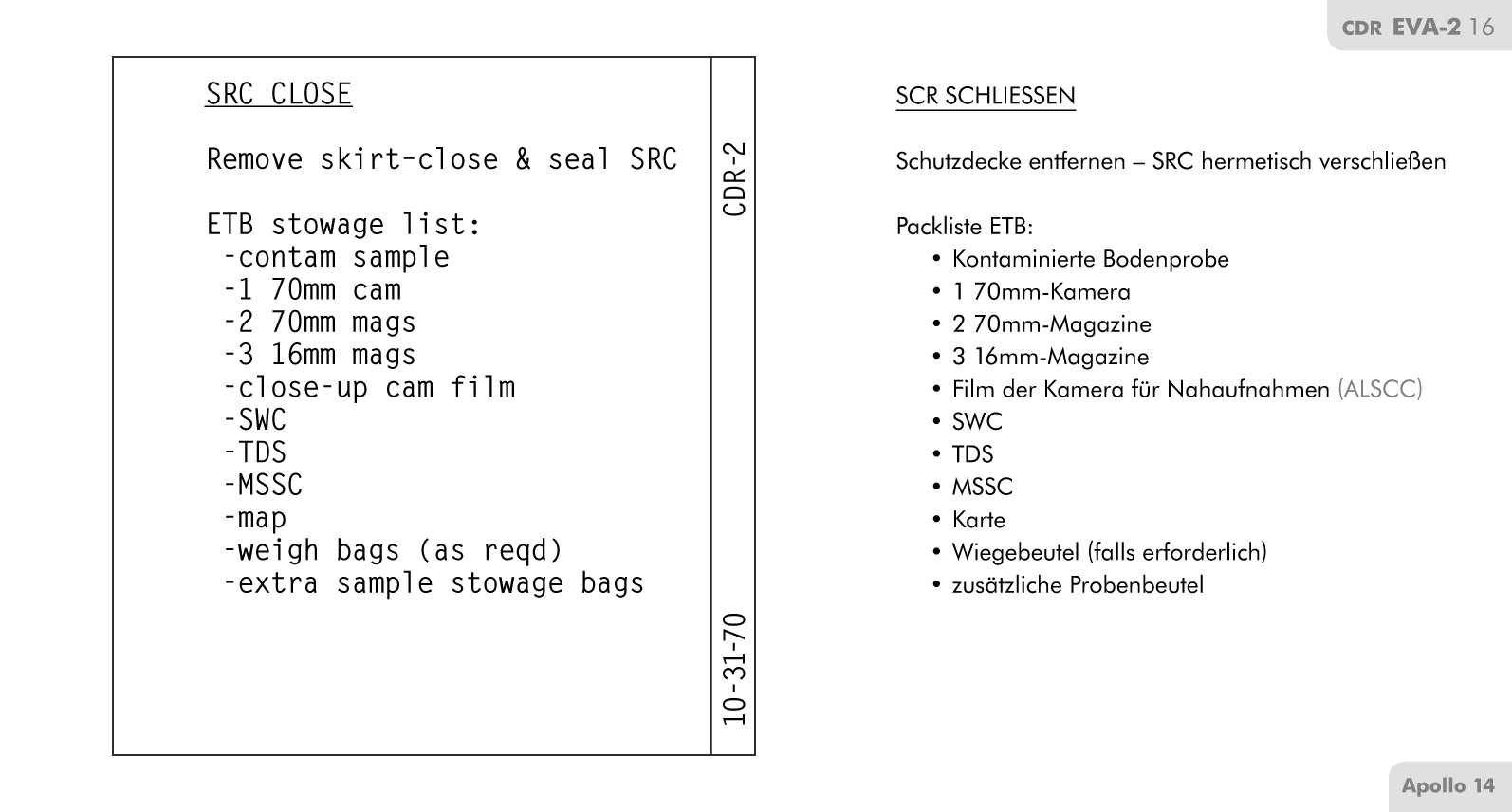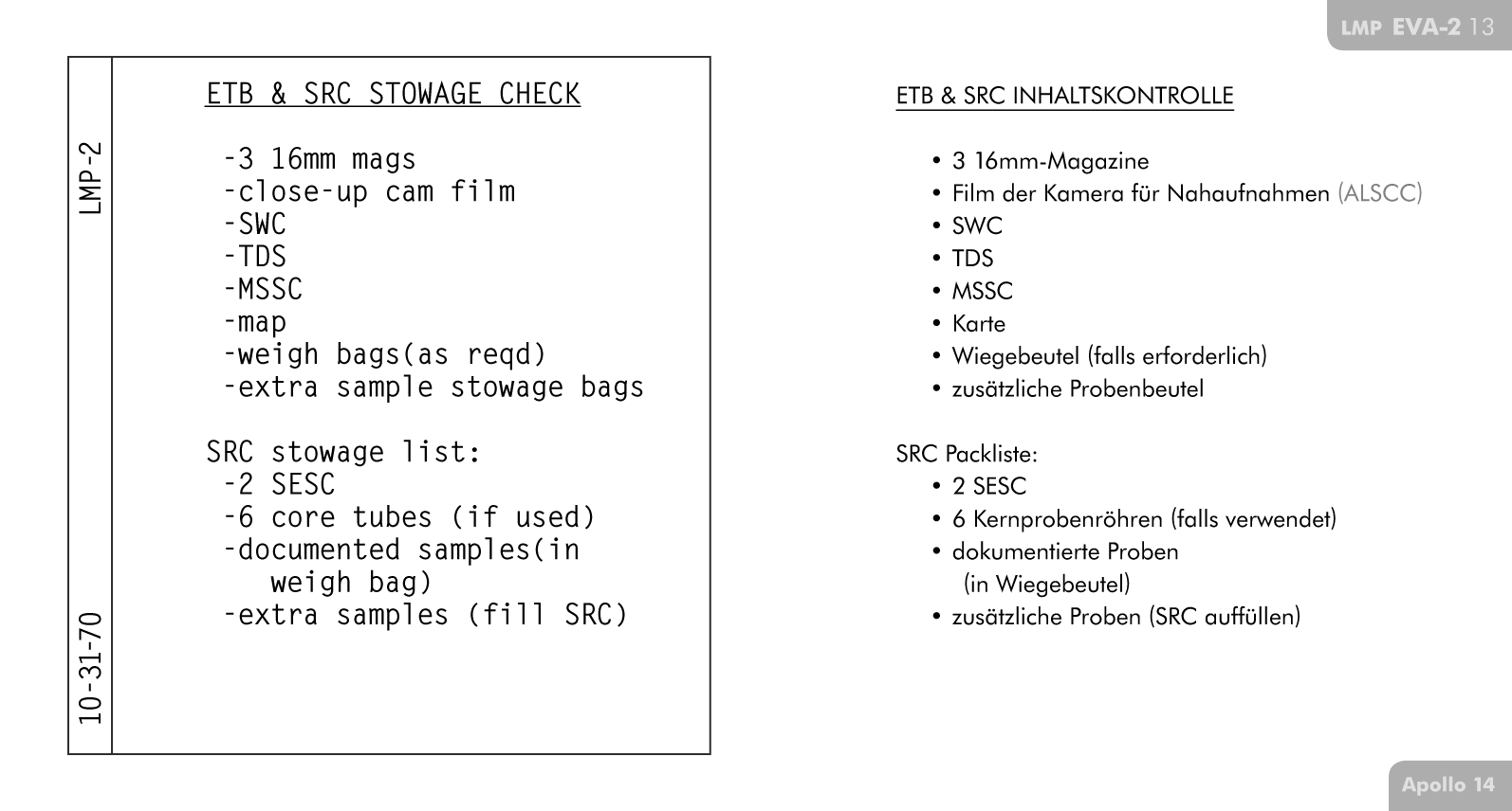 EVAExtravehicular Activity. Die Anweisungen stehen ebenfalls in der Checkliste für den Aufenthalt auf der Mondoberfläche bei Apollo 14 (Apollo 14 LM Lunar Surface Checklist) ab Seite SUR 7-1.