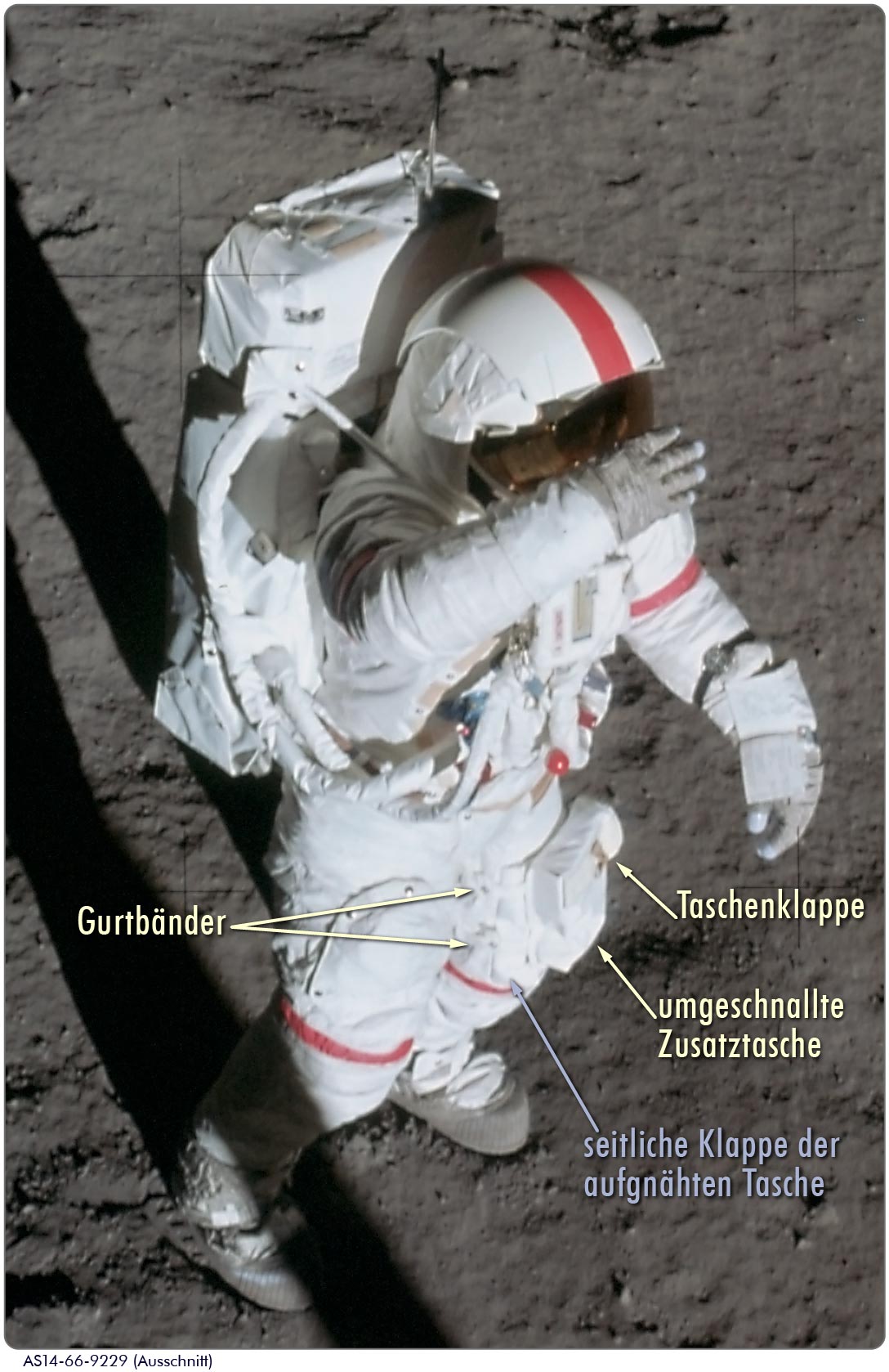 Mitchell: … Gurtband. Okay. Schieb es wieder in die Vertiefung. Das Halteband für den Helmbeutel. Okay. Ah, noch etwas, Al. Ich glaube, da liegt ein Stück Velcro in der Tür. Kannst du es wegnehmen, bevor ich die Tür schließe? Das ist es. Eins von den Stücken, die sich vom MET