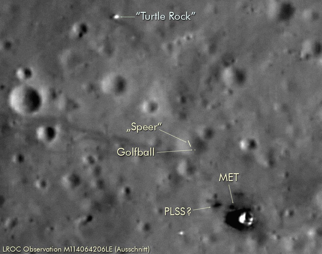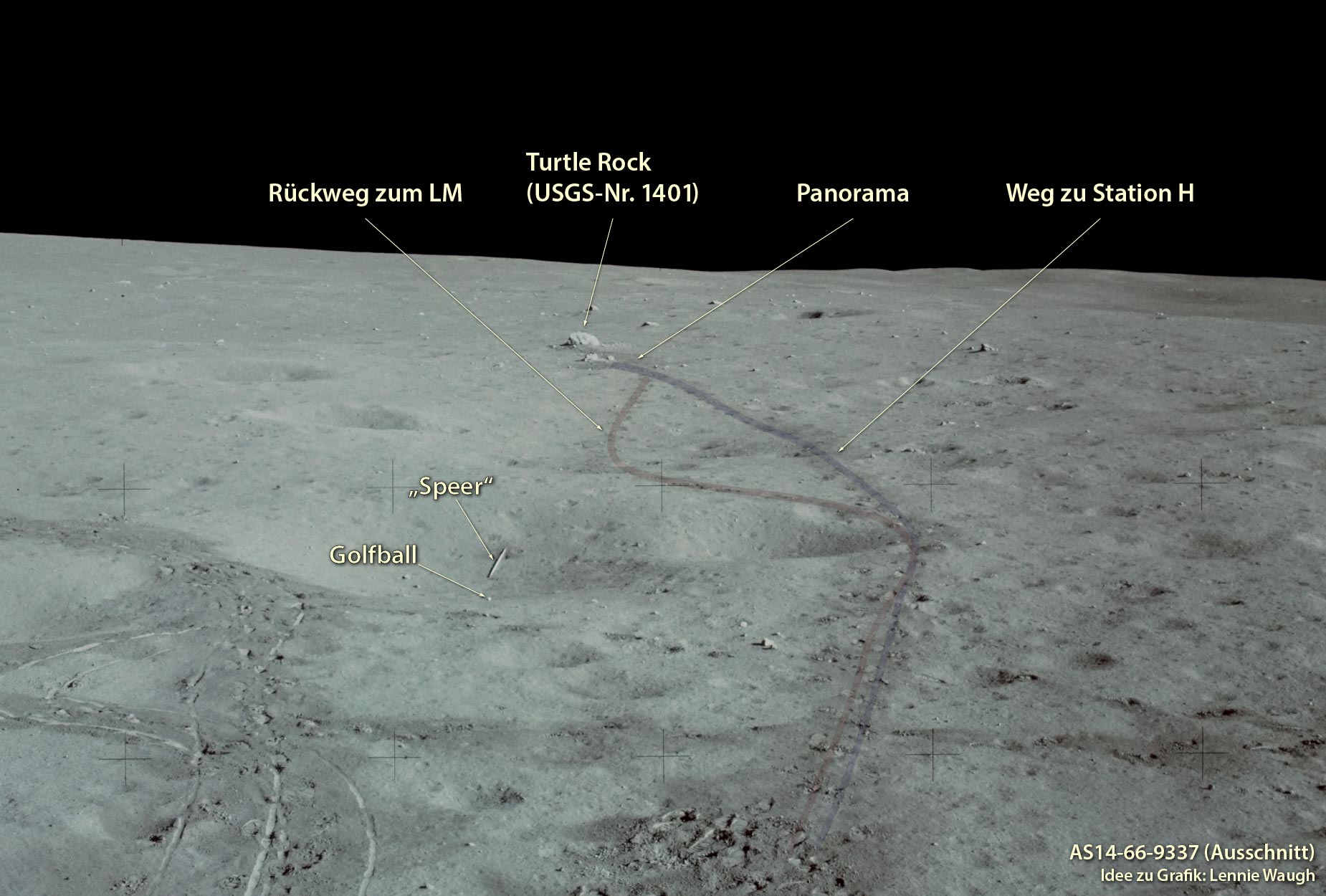 LMLunar Module. Siehe auch den vergrößerten Ausschnitt einer LROC-Aufnahme vom sowie die Karte der Strecke vom LM zu Station H (Jones/Schwagmeier). Im Ausschnitt von AS14-66-9337 wurde der Weg zu Station H und wieder zurück markiert. Das Bild fotografiert Ed nach der EVA