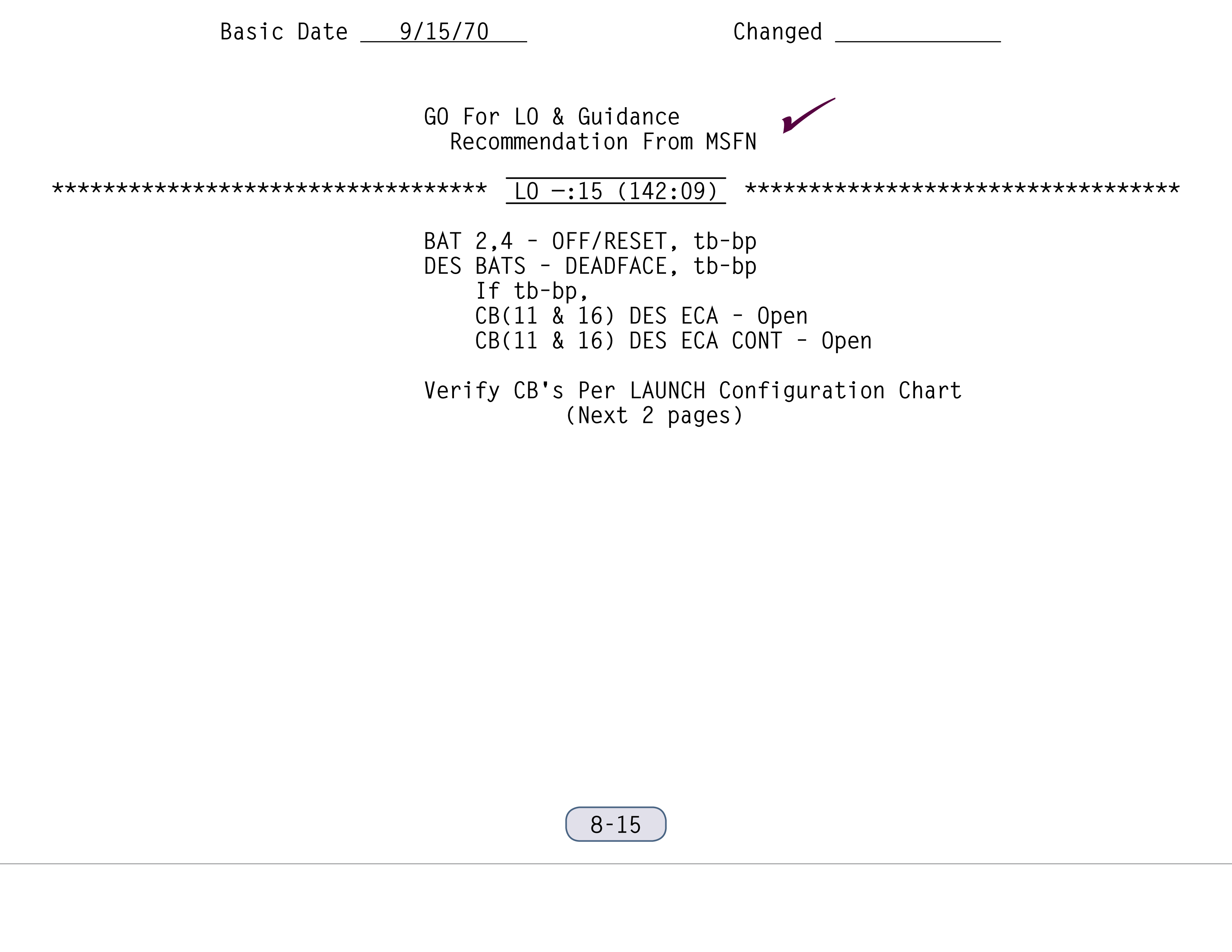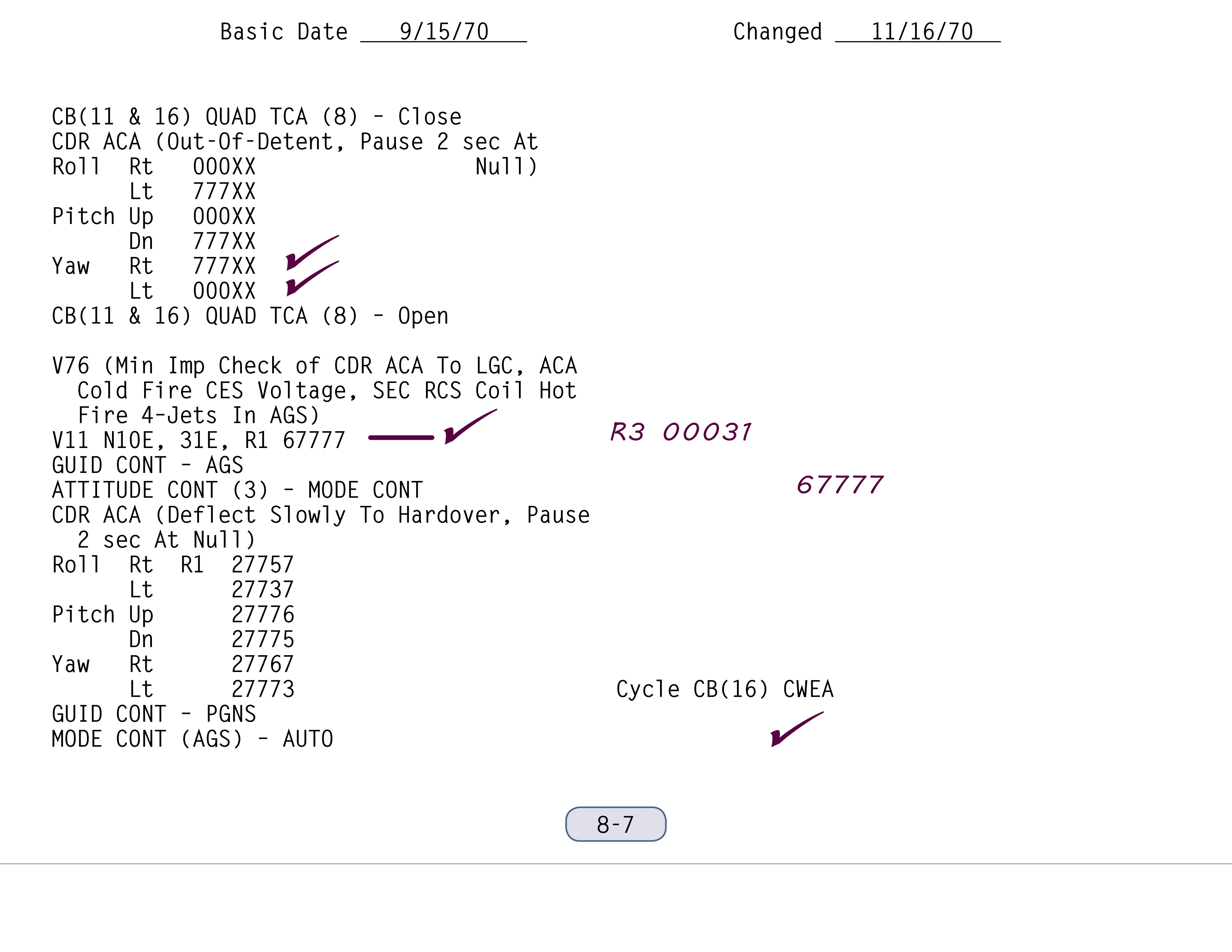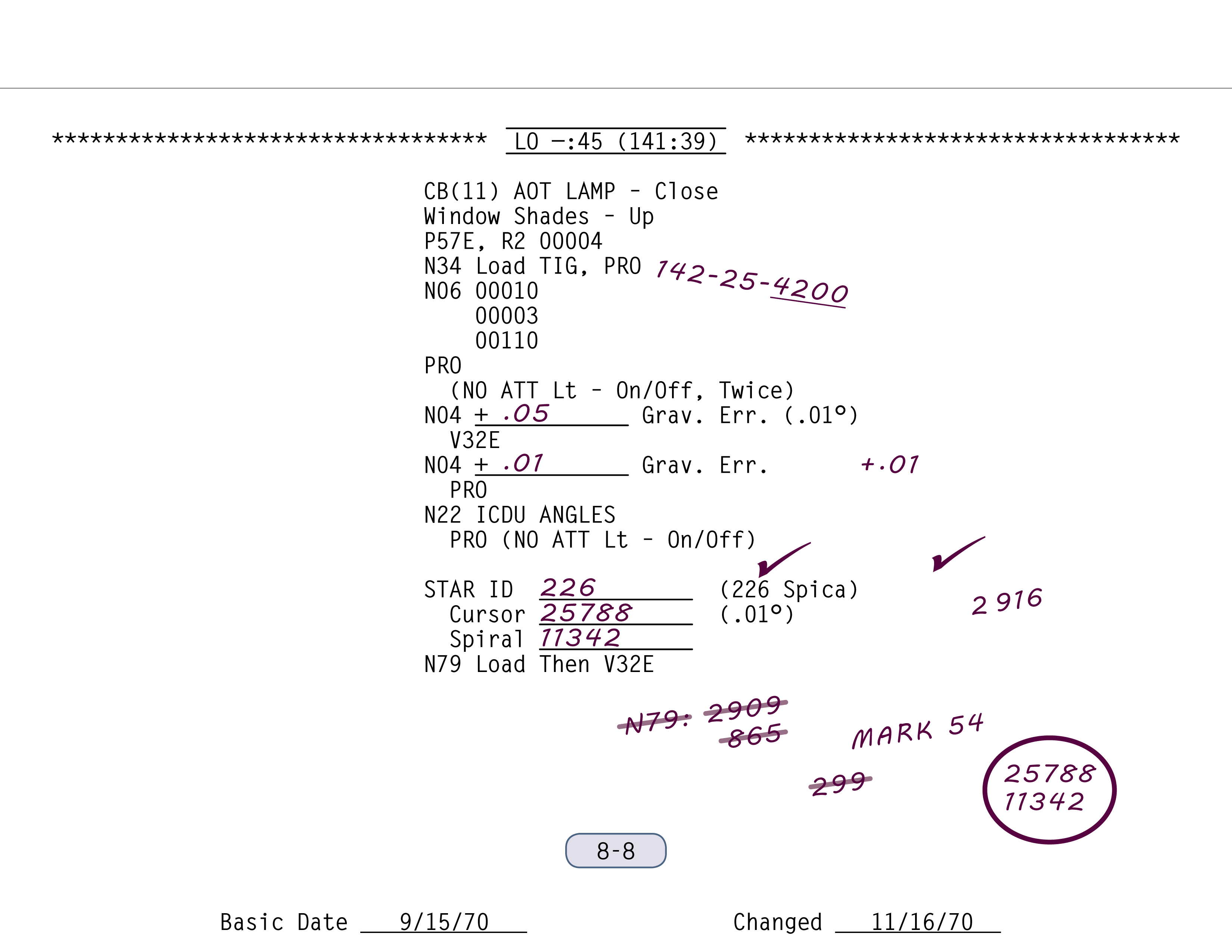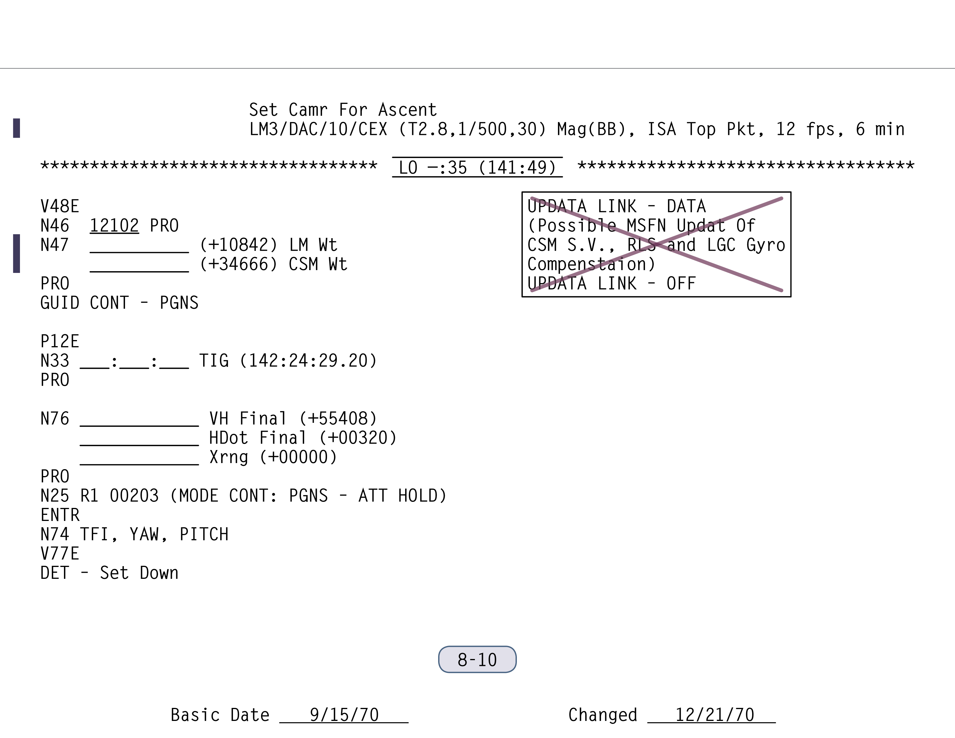 PAD oder PadPreliminary Advisory Data für den Aufstieg, direktes Rendezvous: | 5542,9 | 0031,3 | minus 000,3 | Adresse 47: plus 37741 | plus 01757 | plus 58843 | plus 56968 | plus 0031,3 | plus 0190,9 | Noun 37: | LM