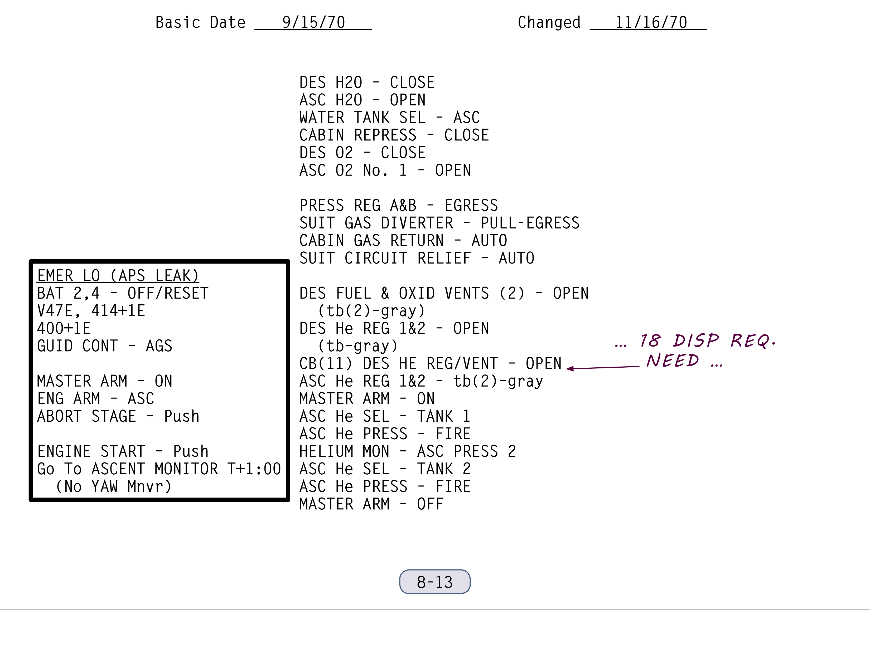 APSAscent Propulsion System. Sobald die benötigte Steigerung der Geschwindigkeit nur noch 500 Fuß/Sekunde (152 m/s) beträgt, öffnet Ed die Ventile der RCS