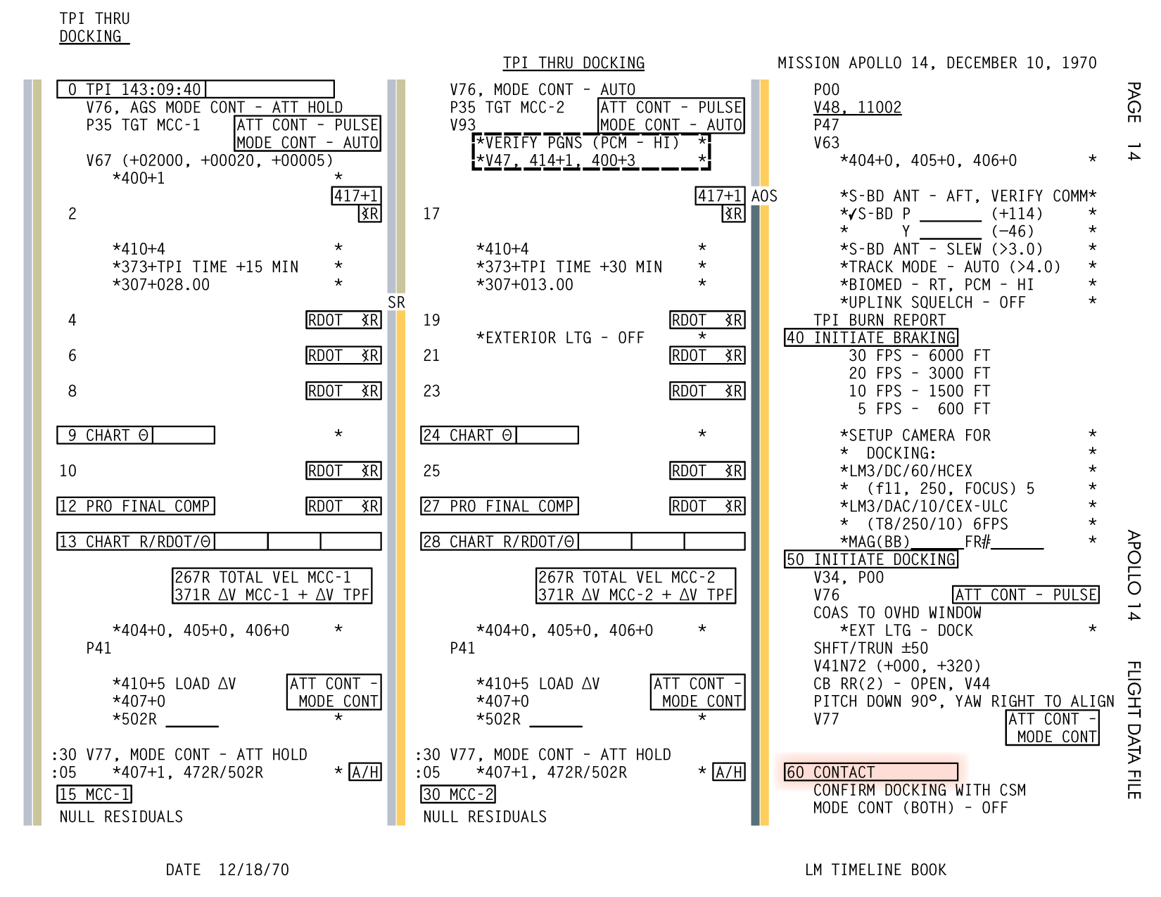 Wegen der Verschiebung des Starts von der Erde müssen von den folgenden Zeitangaben und subtrahiert werden, um den zur Transkription passenden Zeitpunkt zu ermitteln. Erläuterungen sind am Anfang des Journals von Apollo 14 zu lesen.