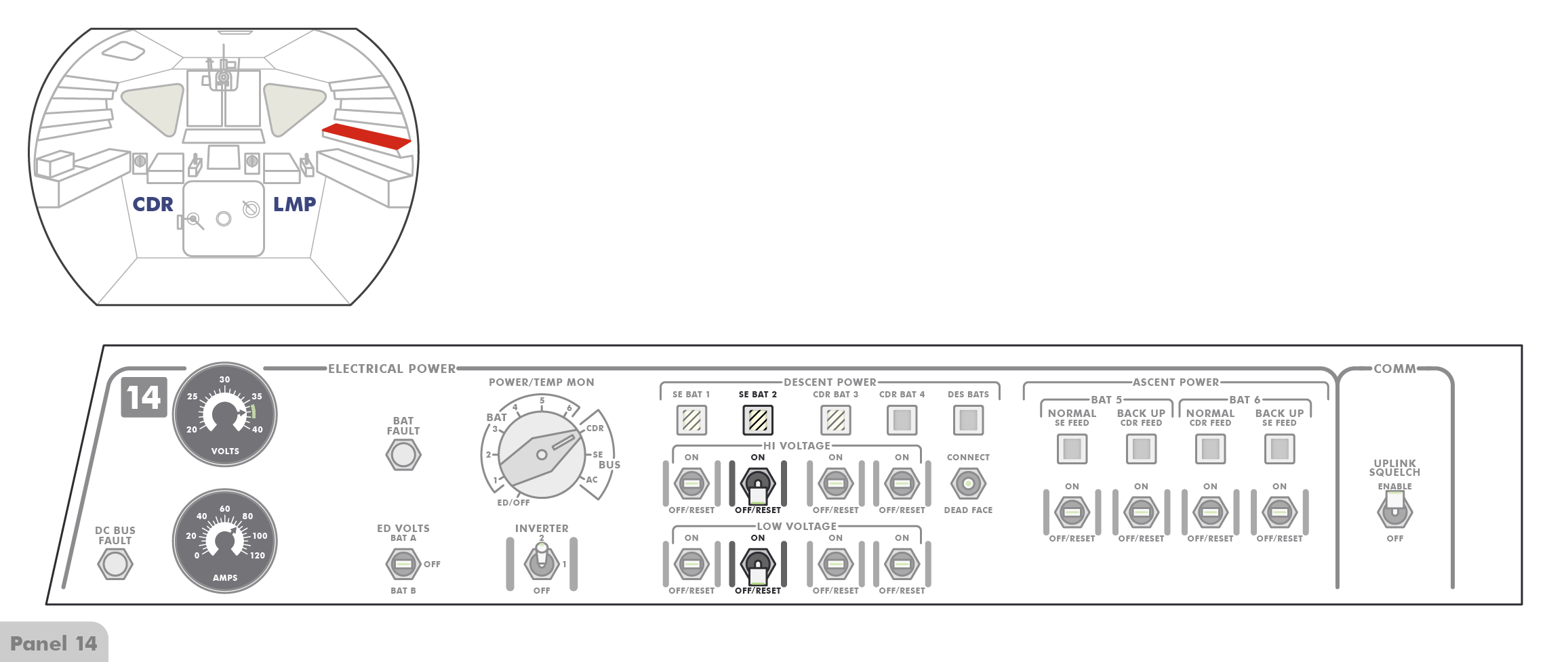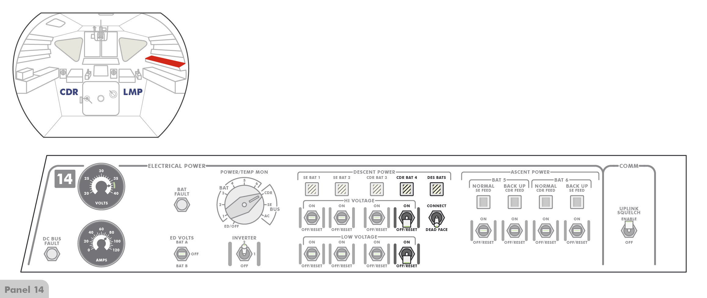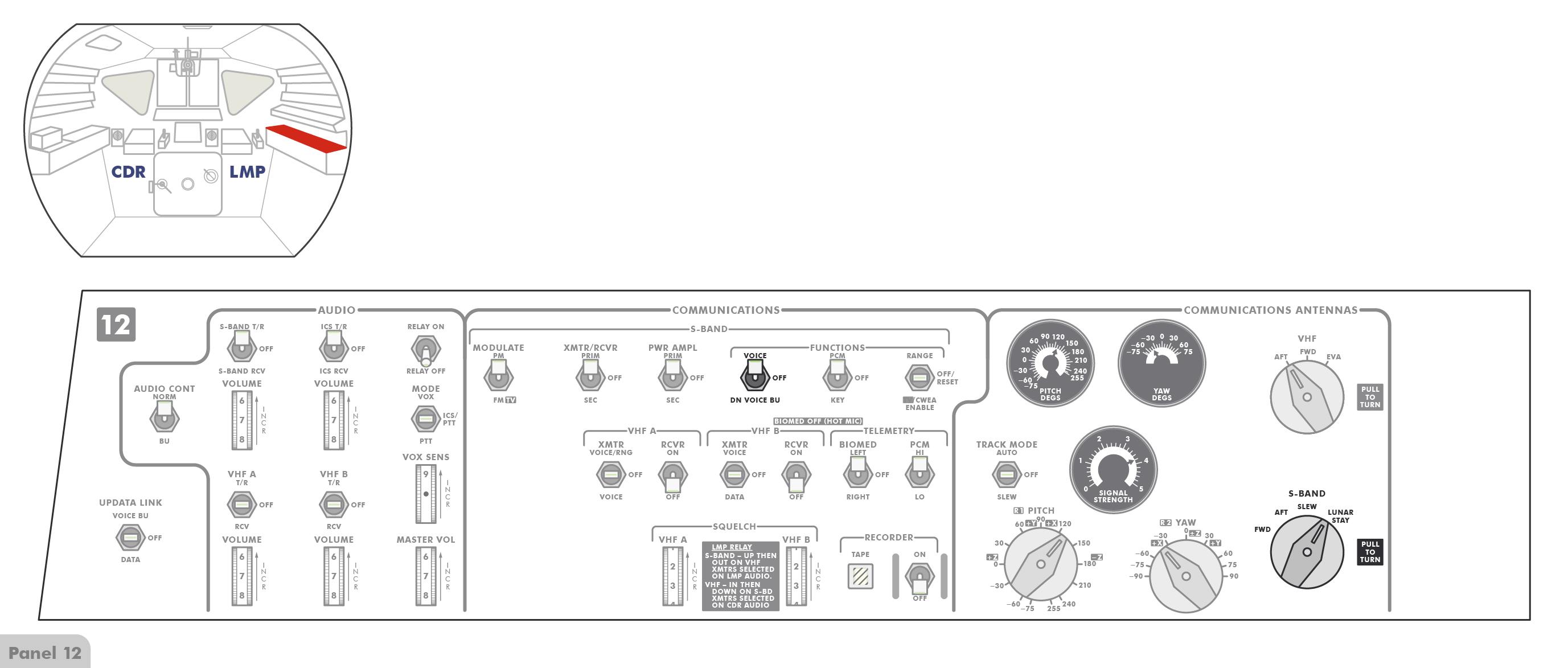 Haise: Okay, Antares, hier ist Houston. Sie möchten, dass ihr wieder zurück auf (S-Band – )Mondaufenthalt schaltet – die große Antenne.