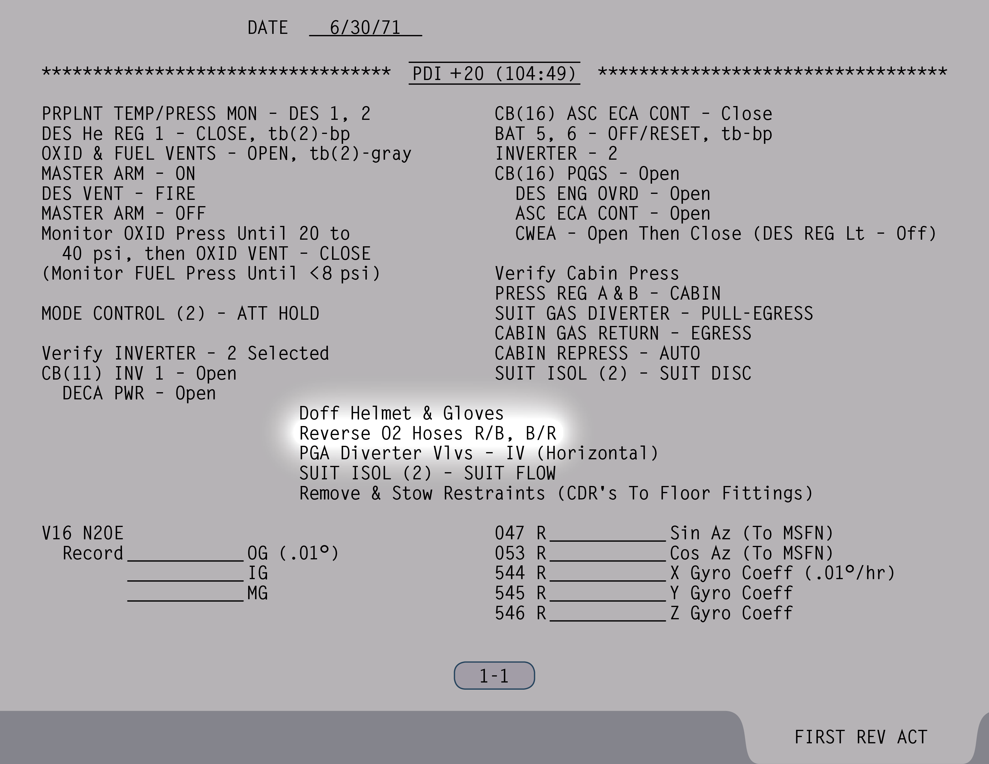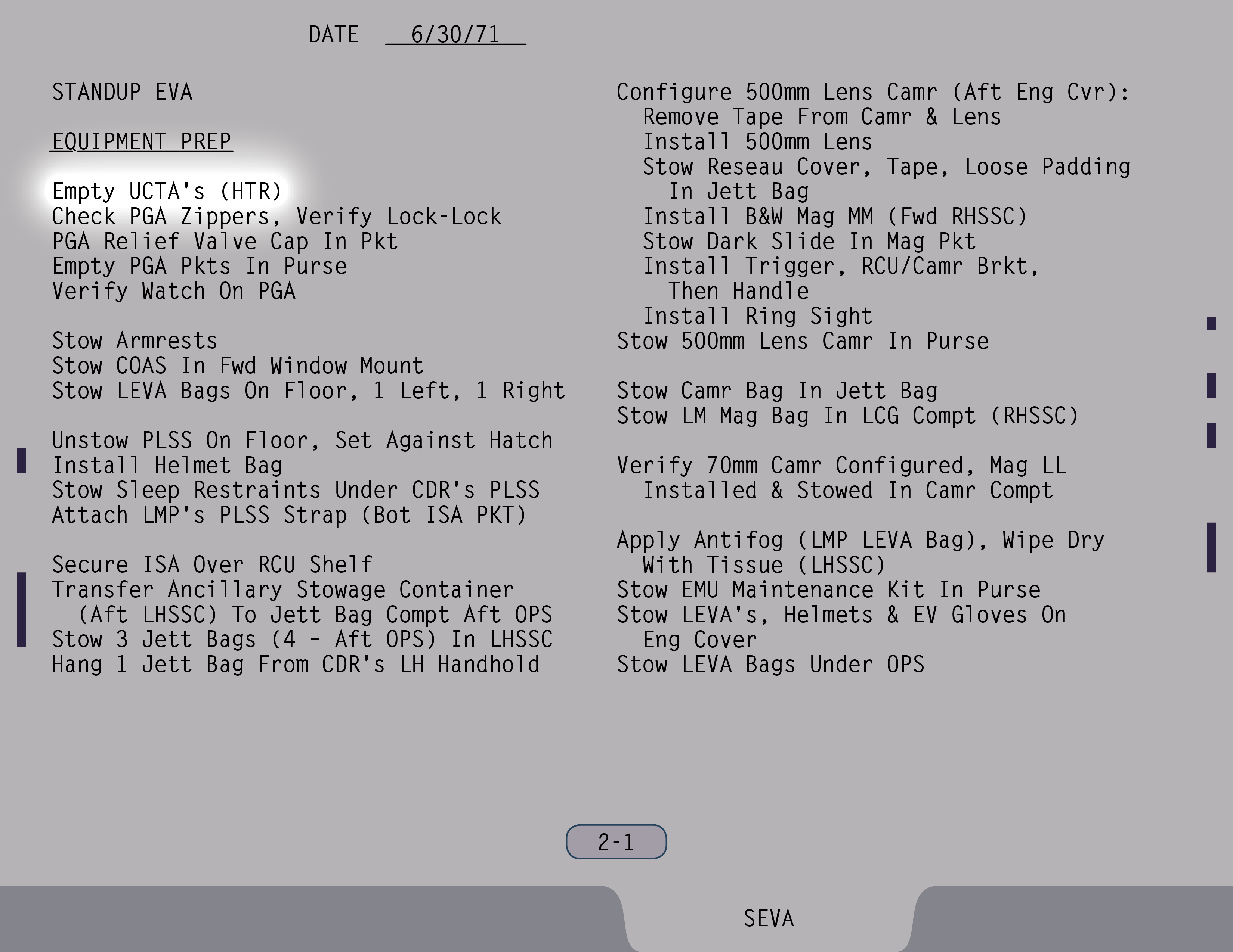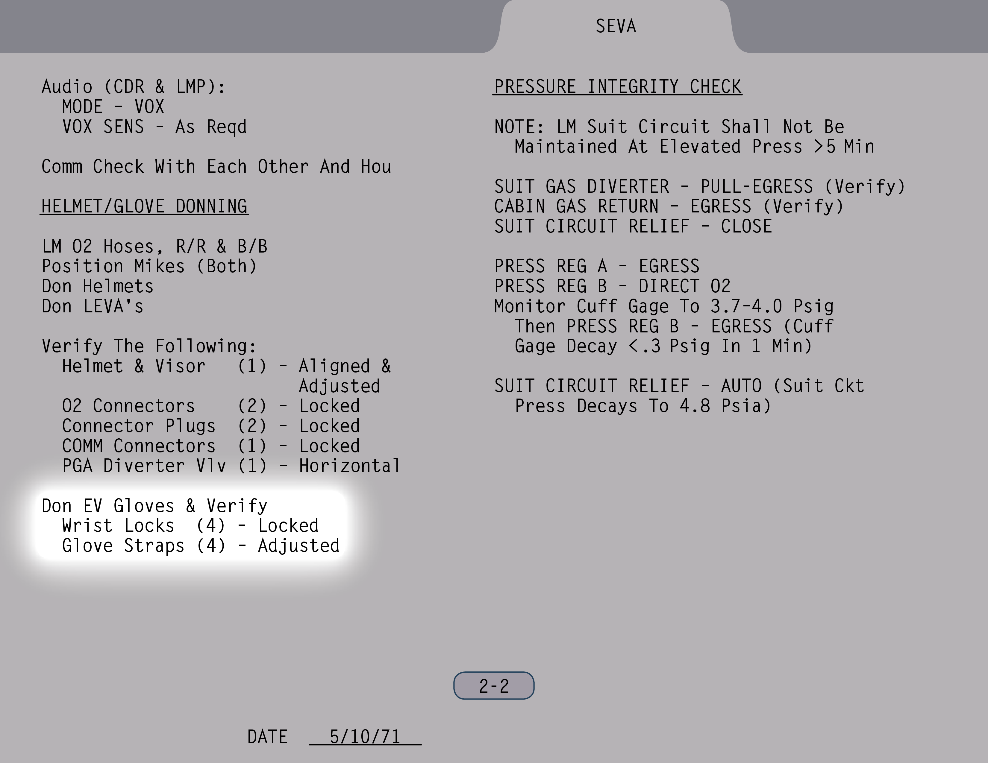 LEVALunar Extravehicular Visor Assembly-Befestigung gemeint. Jedem Astronauten standen drei Anzüge zur Verfügung. Einer für das Training, der über die lange Zeit der Vorbereitung auf die Mission ziemlich ramponiert wurde, ein Anzug für die Mission und einer als Ersatz. Zu diesem Zeitpunkt sind ihre Anzüge praktisch noch nagelneu.