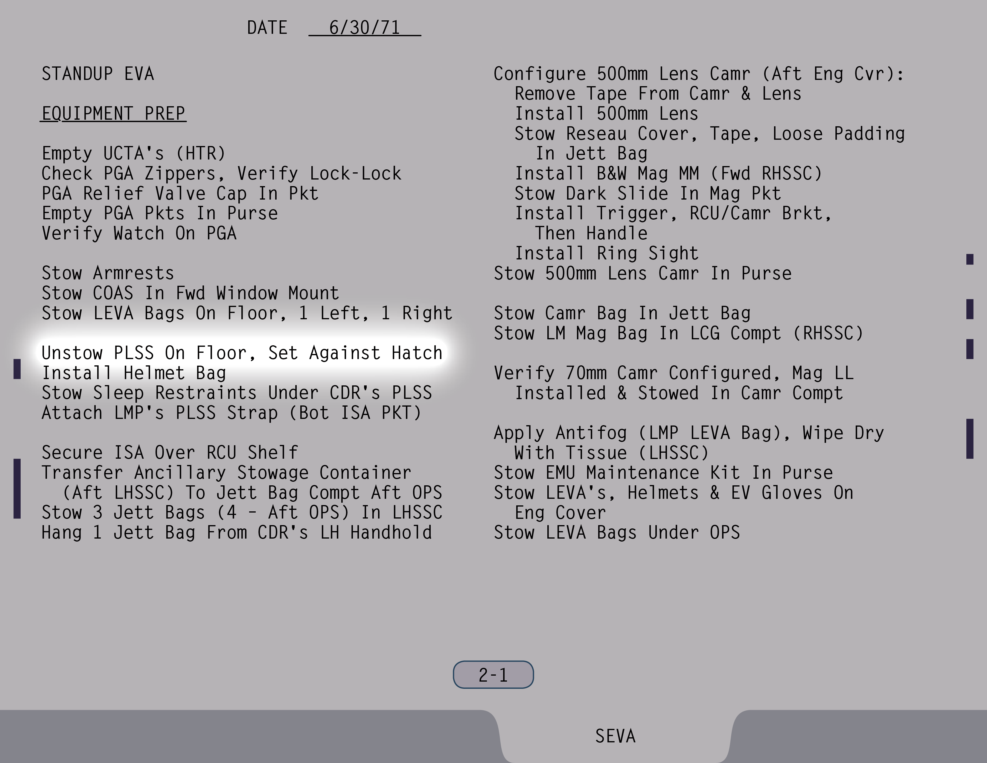 PLSSPortable Life Support System hängt links hinter ihm an der Kabinenwand. Sie sind auf SUR 2-1 und bereiten sich auf die EVA