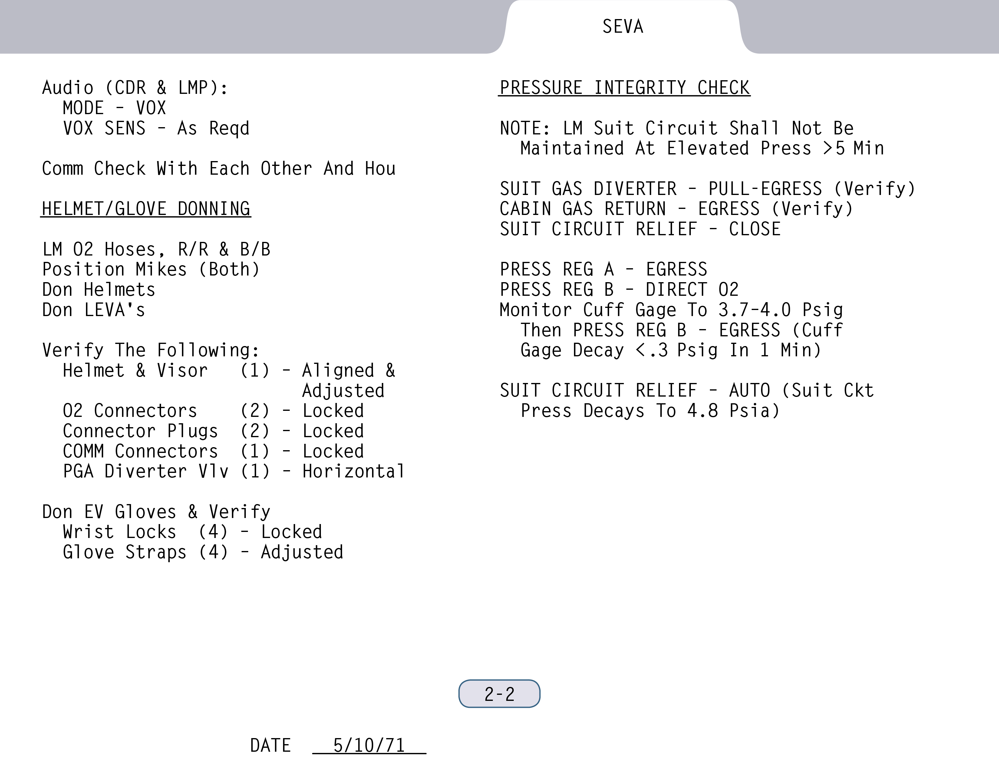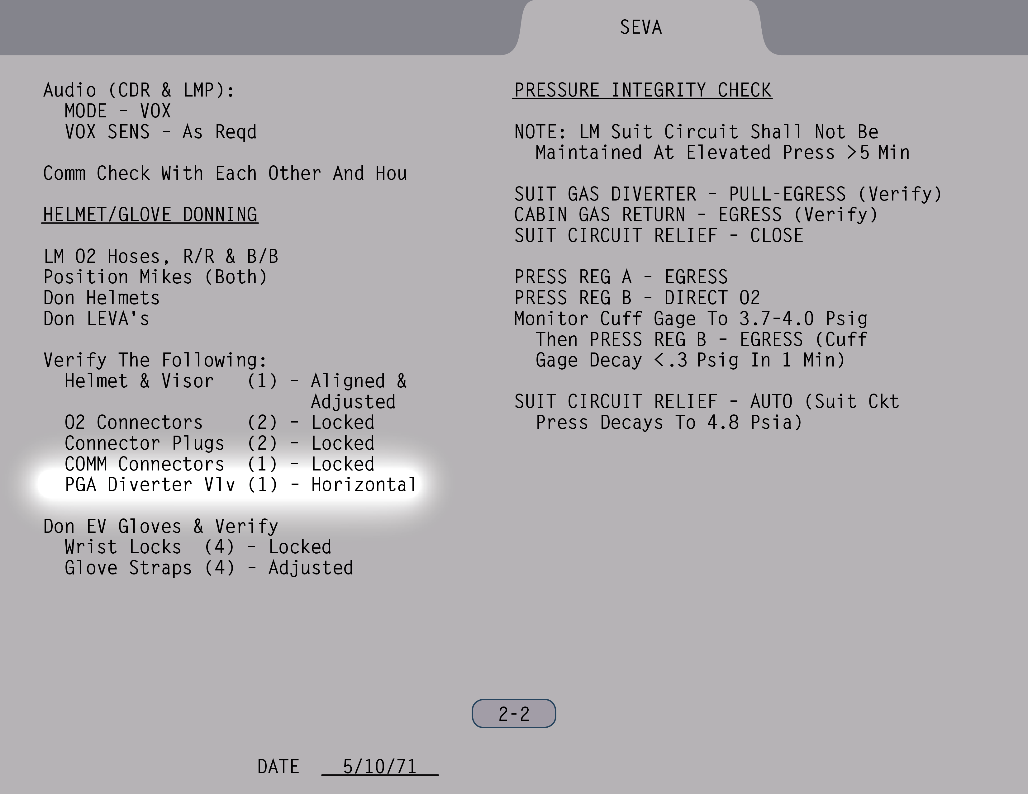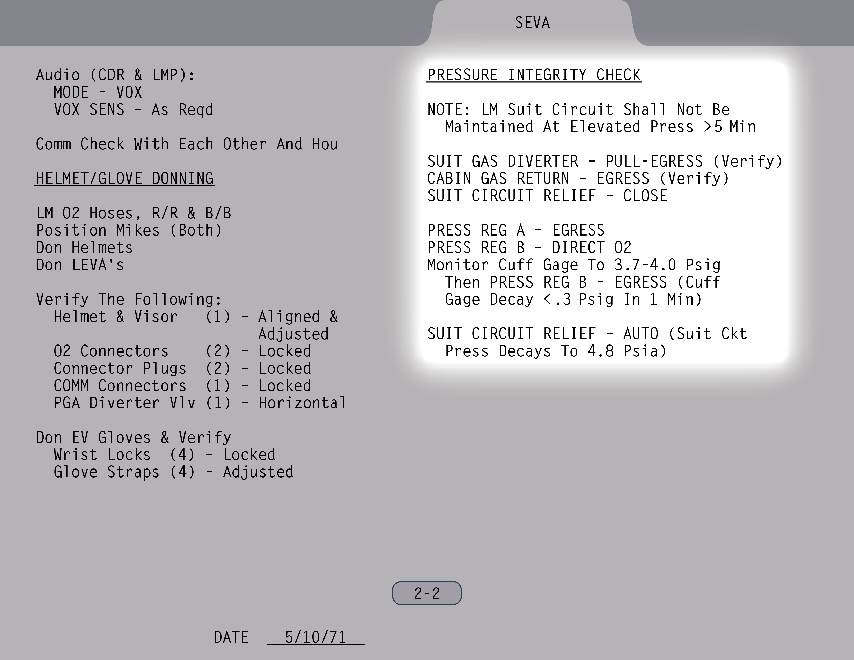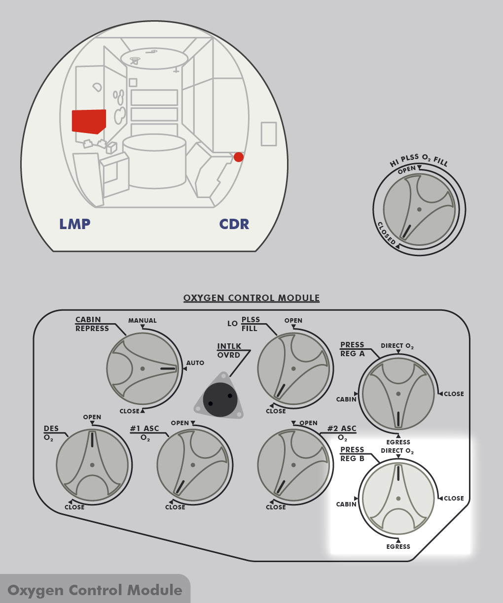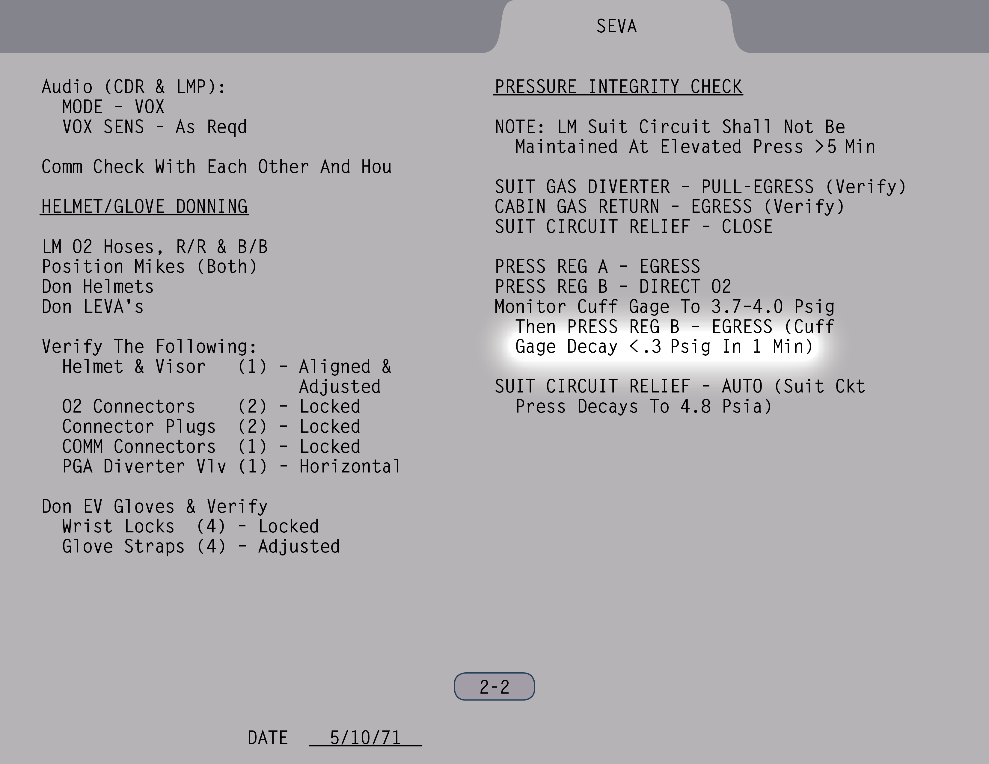 Die Stellung Direkt O2 bedeutet, der Sauerstoff wird nicht reguliert in den Anzug geleitet, wenn auch mit mäßigen 7 lb/h (3,2 kg/h). Das reicht, um in den bis jetzt nicht unter Druck stehenden Anzügen einen Überdruck zu erzeugen. Dann schließen sie das Ventil (Regulator B auf Aussteigen [ECS-Paneel]) und kontrollieren auf ihrem Druckmesser, dass der Anzugdruck sich nur um weniger als 0,3 psig/min (0,02 bar/min) verringert und somit keine Lecks vorhanden sind. Wenn der Anzug den Test bestanden hat, können sie den Druck aus der Kabine ablassen.