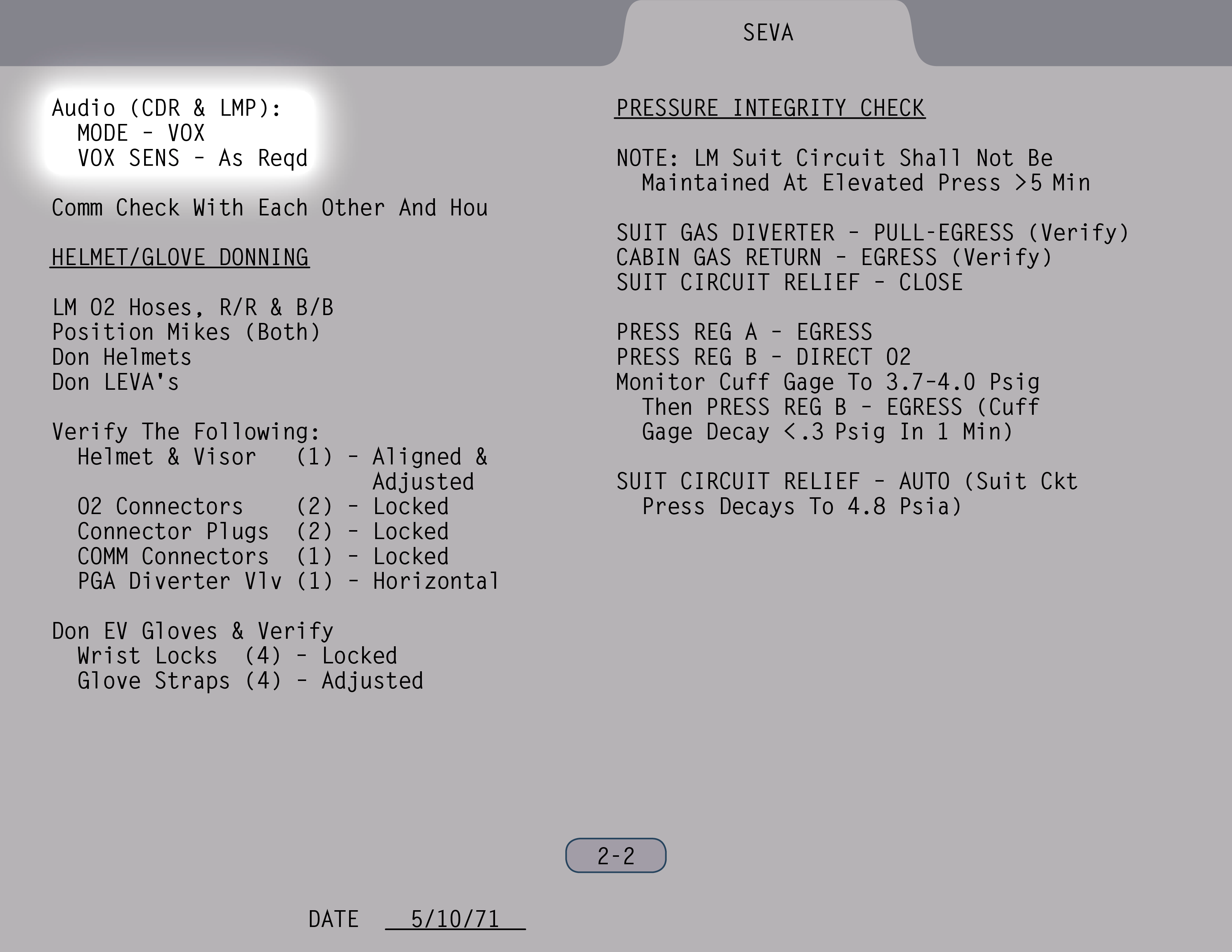 LEVALunar Extravehicular Visor Assembly ausgepackt, die Helme innen mit einem Antibeschlagmittel ausgewischt usw. Der nächste Funkspruch von Dave deutet an, sie sind jetzt auf SUR 2-2. Hier stellen sie ihre jeweiligen Schalter für den Audio Modus auf VOX
