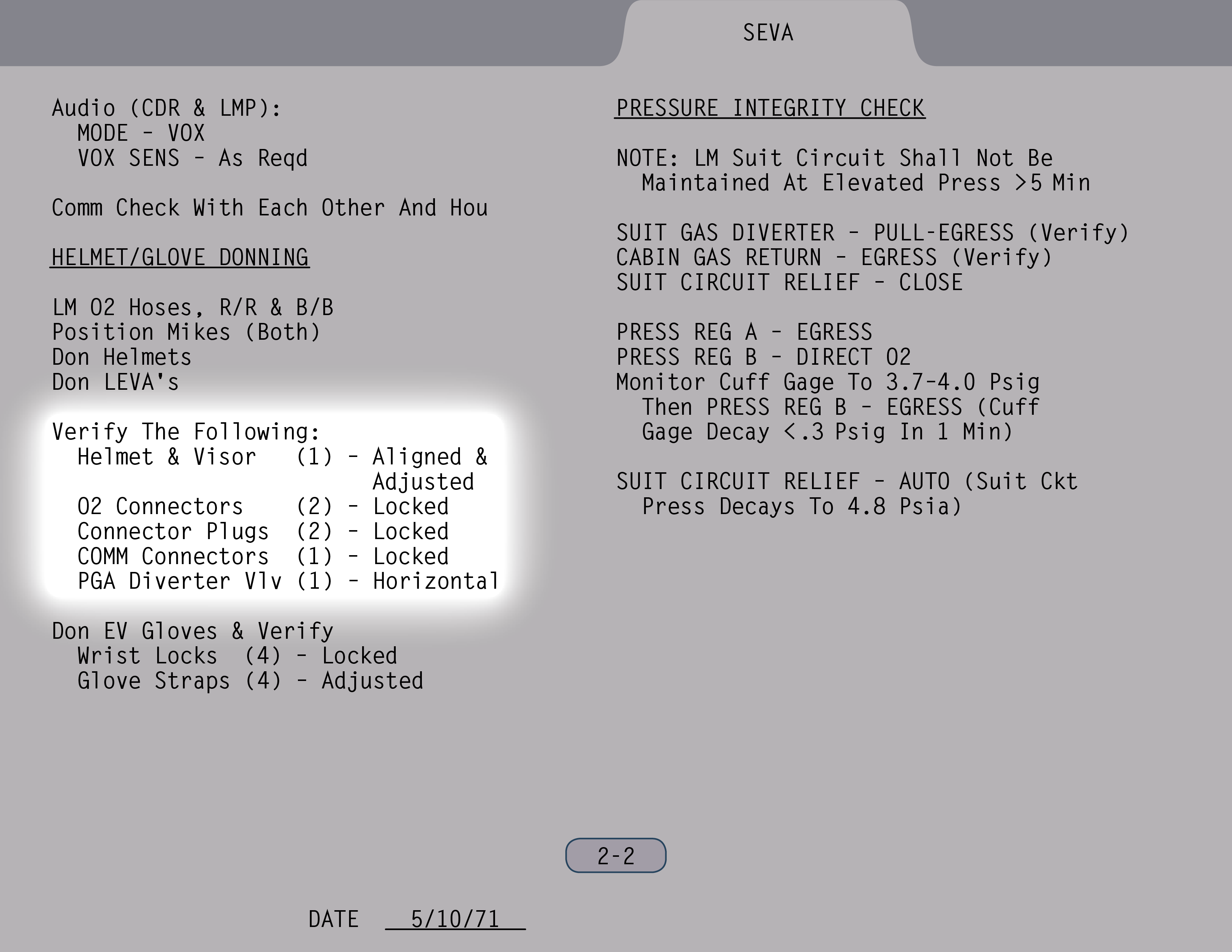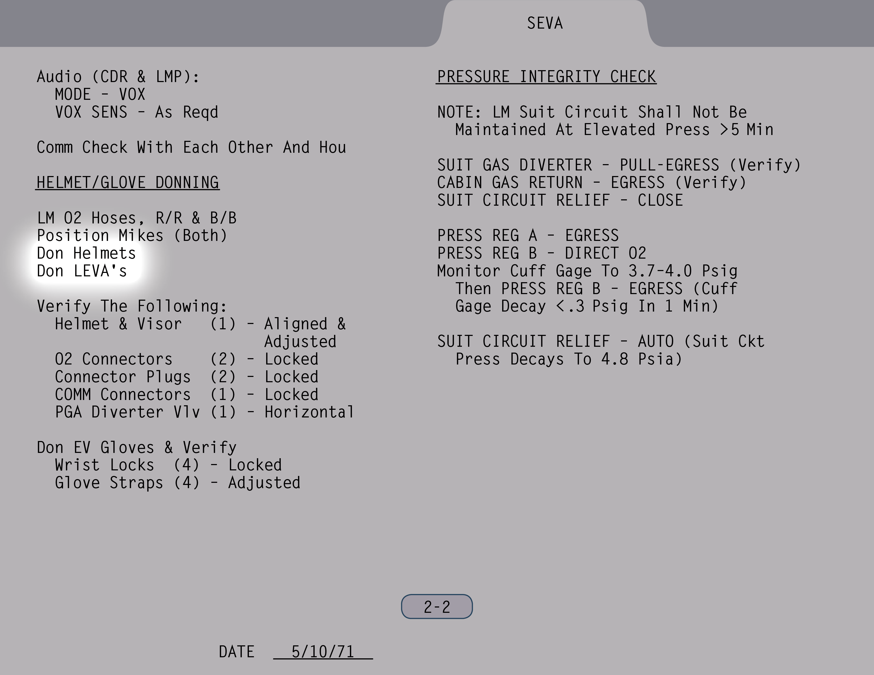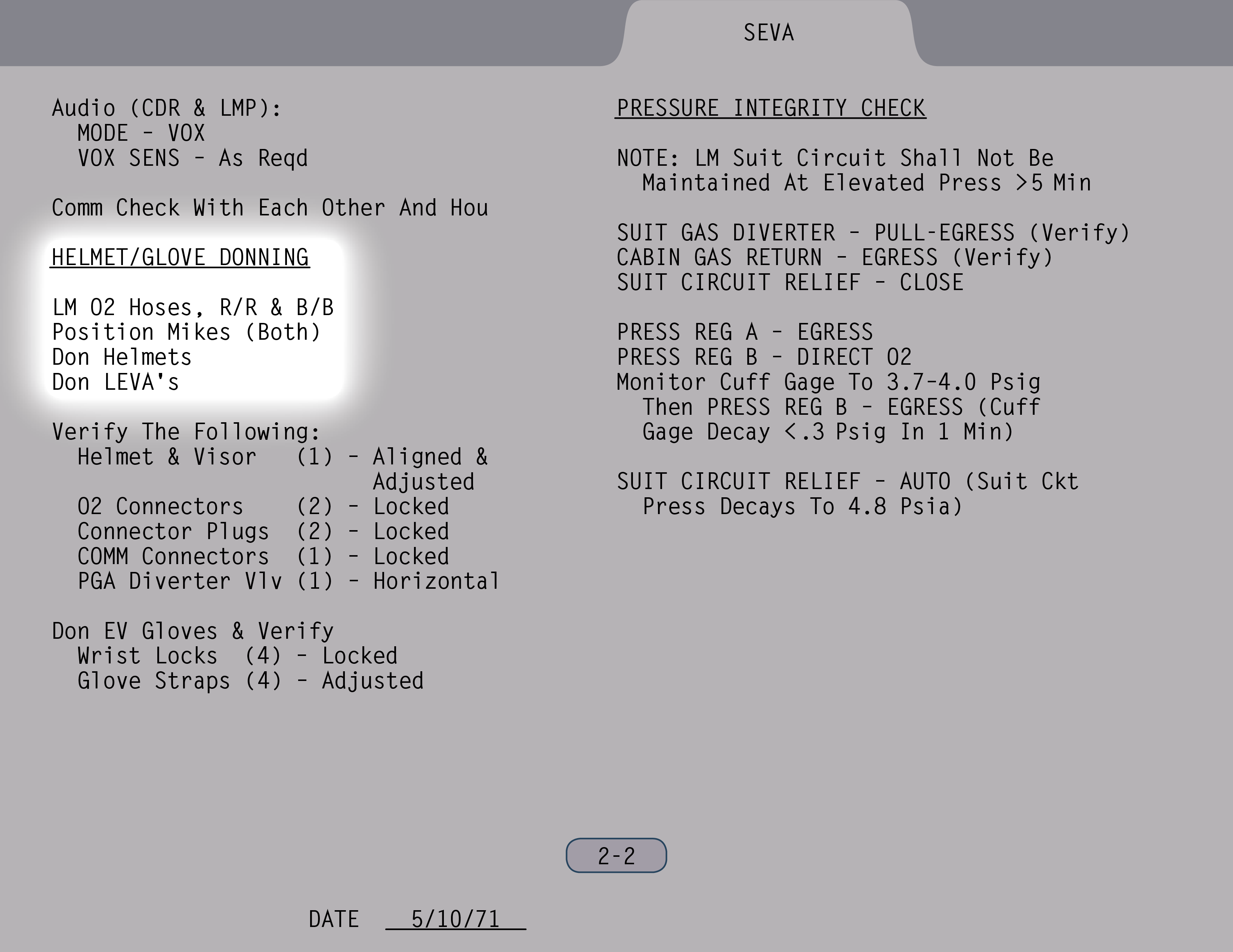 LEVALunar Extravehicular Visor Assembly aufsetzen (SUR 2-2). Bei dir zuerst, wie üblich.