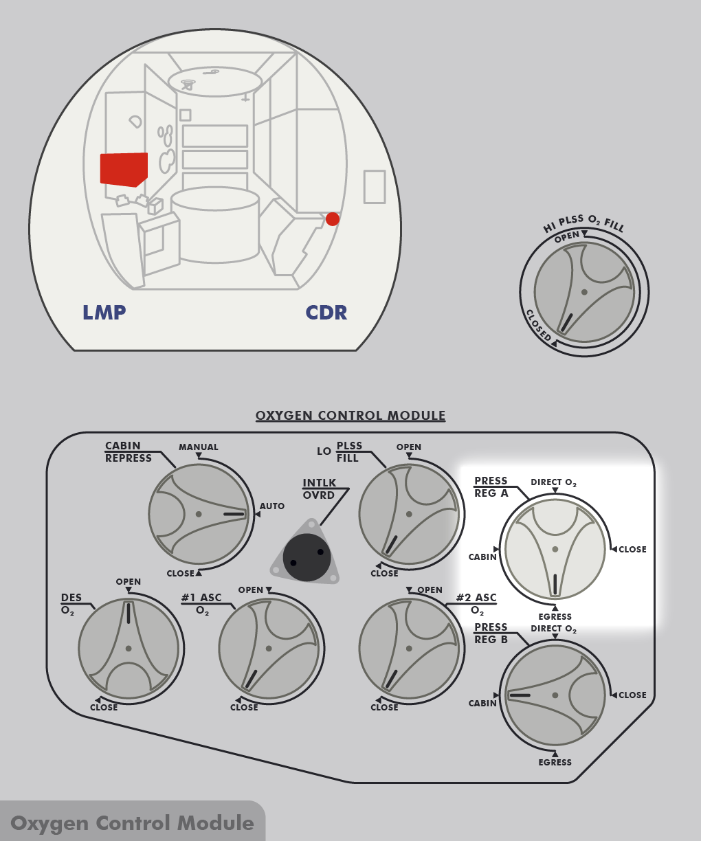 Auf Kabine gestellt, wird von einem oder beiden Druckregulatoren der Kabinendruck zwischen 4,6 und 5,0 psi (0,32 bzw. 0,34 bar) gehalten. In der Stellung Aussteigen wird genügend Sauerstoff in den Anzugkreislauf geleitet, um einen Druck von 3,6 bis 4,0 psi (0,25 bzw. 0,28 bar) zu gewährleisten.