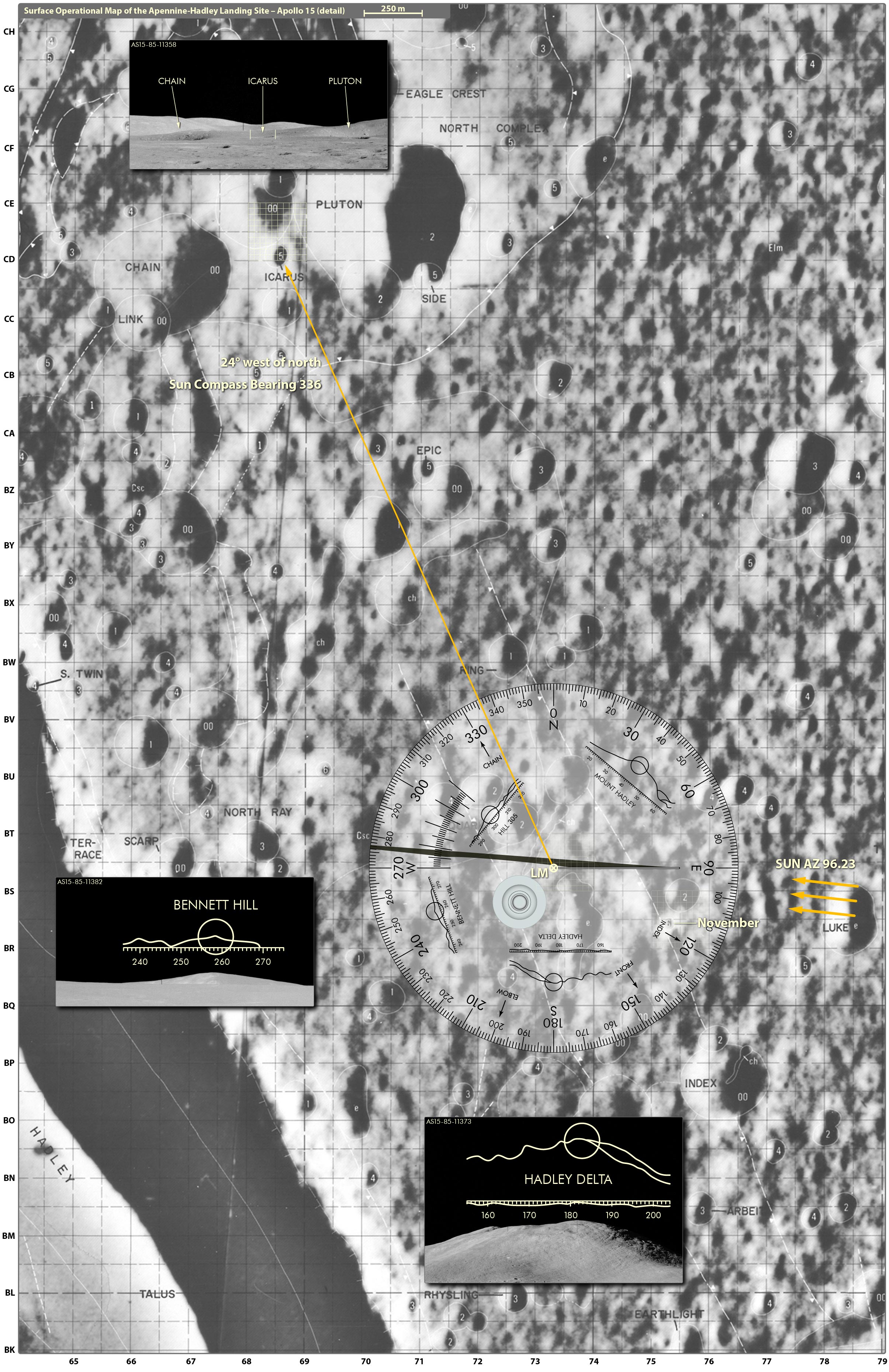 SEVAStand-Up Extravehicular Activity viel gebracht. Wir waren danach ziemlich sicher, dass wir die Apennin-Front mit dem Fahrzeug erreichen können, genauso wie die Rille und die Nord-Gruppe. Ich hatte das Gefühl, alle drei Ziele befinden sich gut in Reichweite, obwohl wir offensichtlich nicht präzise an der geplanten Stelle gelandet sind. Zu dem Zeitpunkt war ich nicht sicher, wo genau wir standen. Ich konnte mich zwar an einigen Landschaftsmerkmalen orientieren, musste mich aber trotzdem auf den Sonnenkompass verlassen und Winkel für eine Triangulation ermitteln. In der Nähe gab es nichts, das mir bekannt vorkam. So war es die ganze Zeit, auch während der EVAs