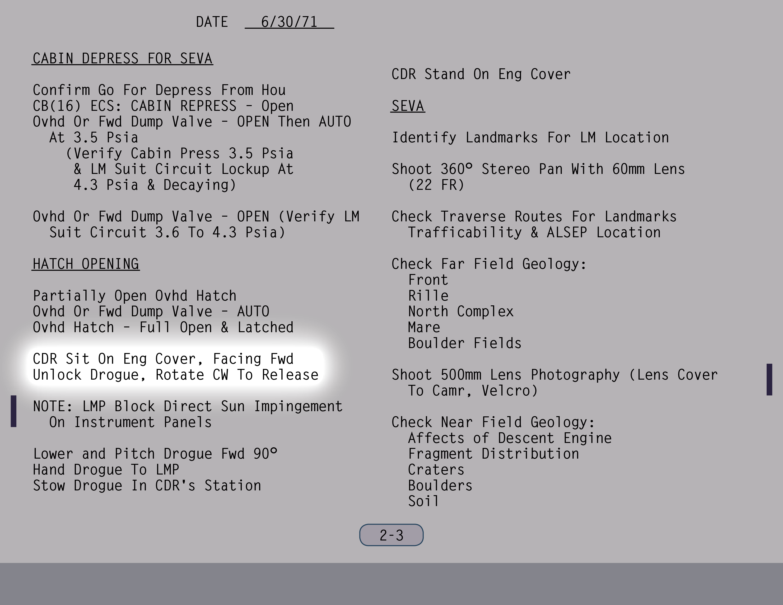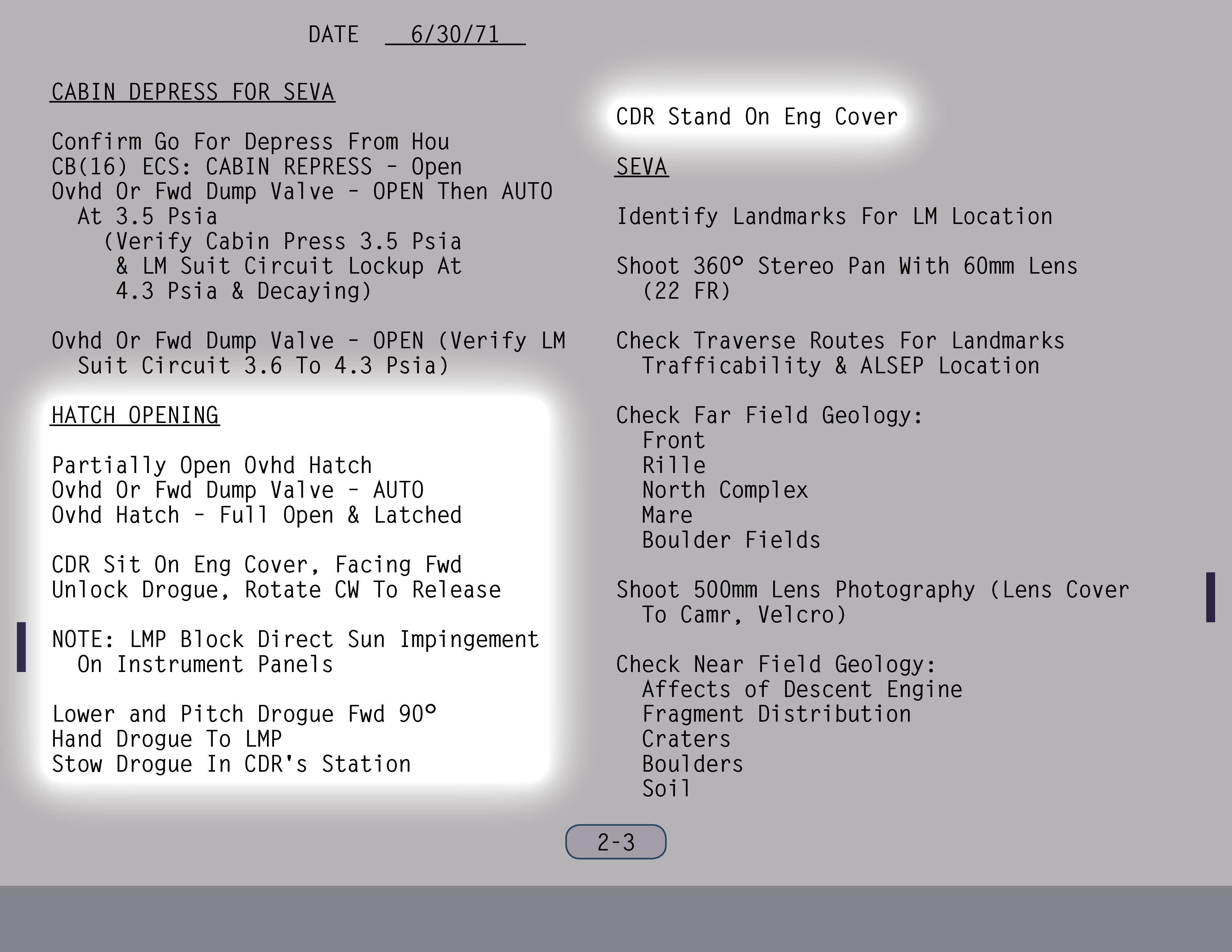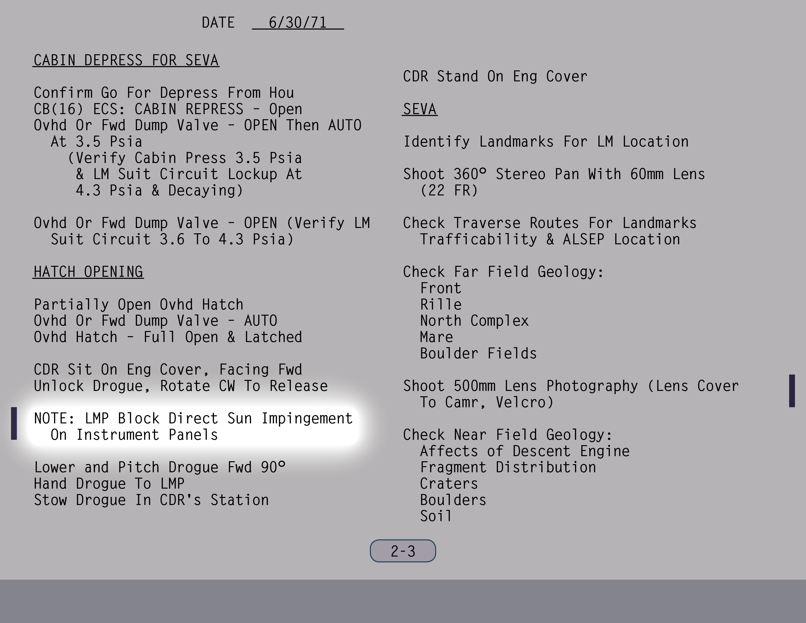 Anstelle der als Ringbuch zusammengefassten Checkliste für den Aufenthalt auf der Mondoberfläche bei Apollo 15 (Apollo 15 LM Lunar Surface Checklist) benutzen sie eine Stichwortkarte, auf der nur die Schritte für diesen Abschnitt der Mission stehen. Die Karte hängt vor ihnen am Instrumentenpaneel.