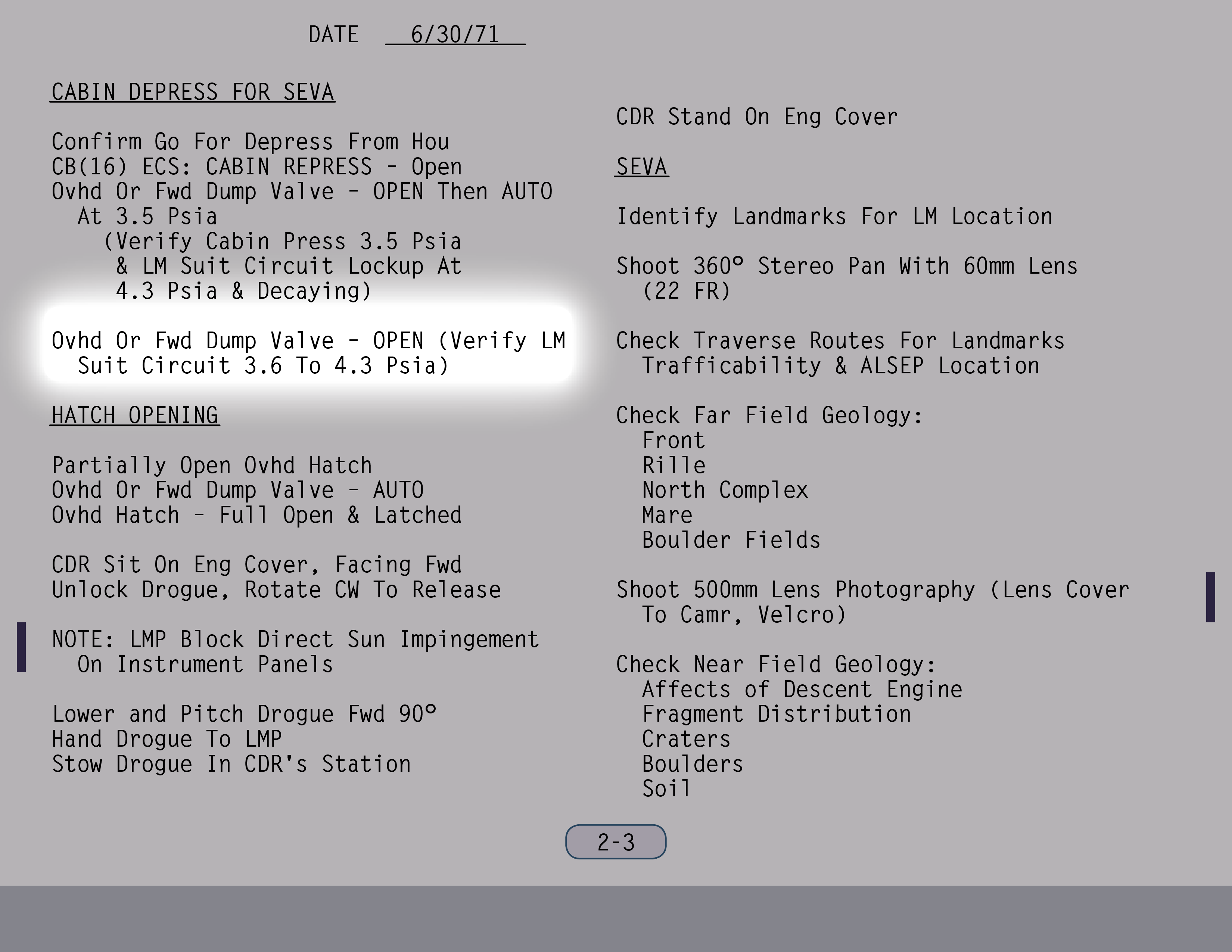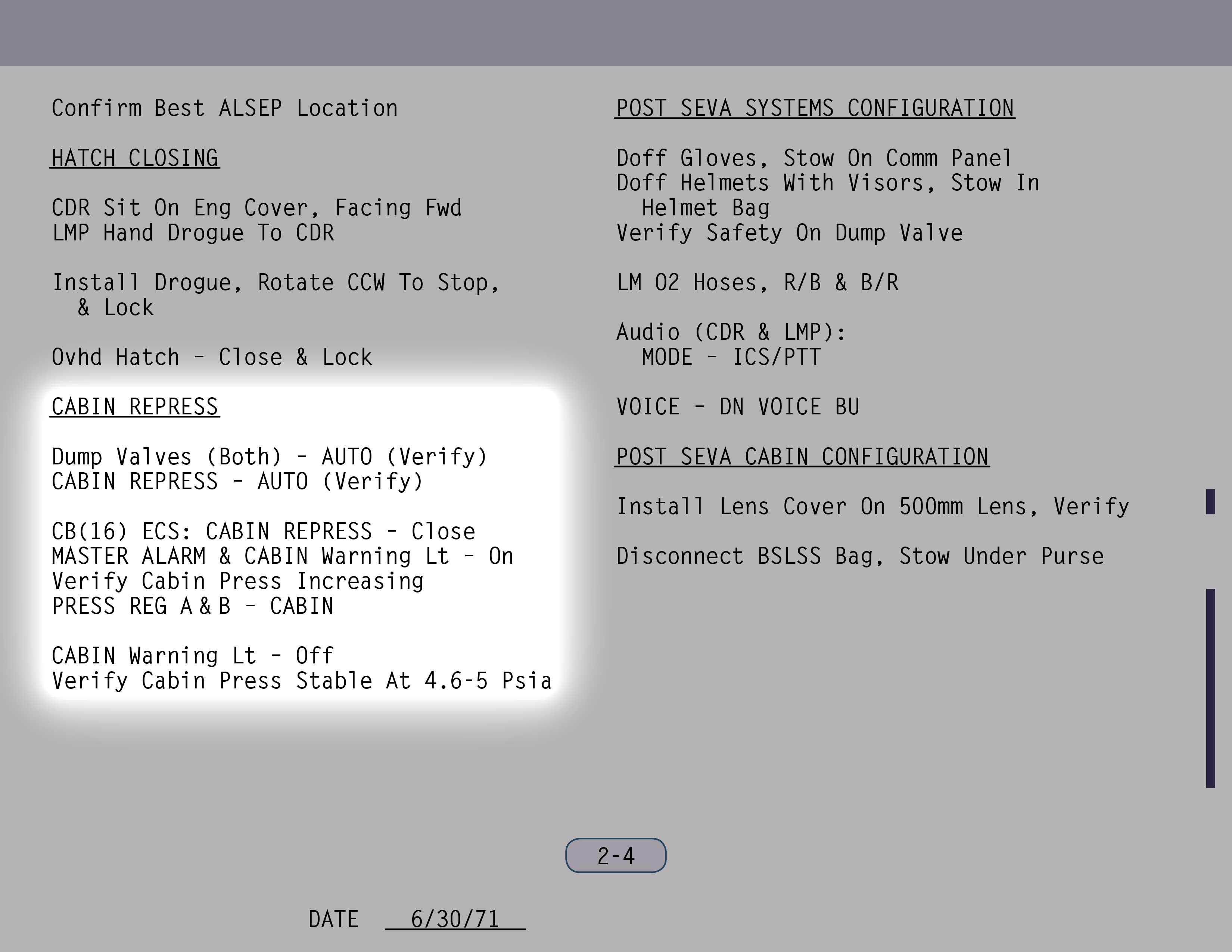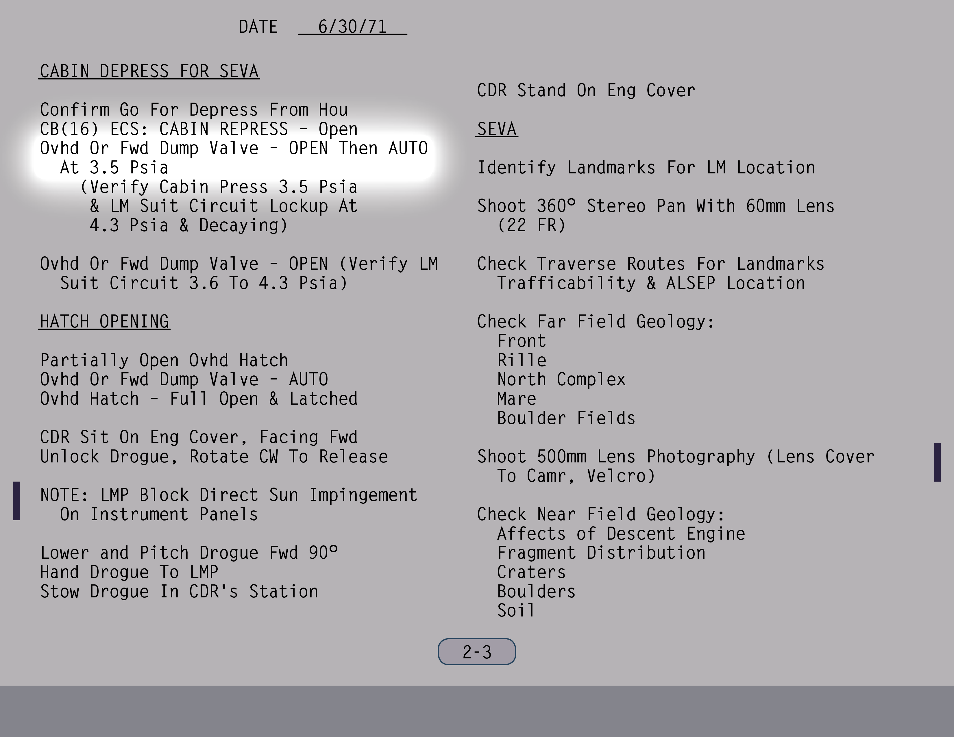 Anstelle der als Ringbuch zusammengefassten Checkliste für den Aufenthalt auf der Mondoberfläche bei Apollo 15 (Apollo 15 LM Lunar Surface Checklist) benutzen sie eine Stichwortkarte, auf der nur die Schritte für diesen Abschnitt der Mission stehen. Die Karte hängt vor ihnen am Instrumentenpaneel.