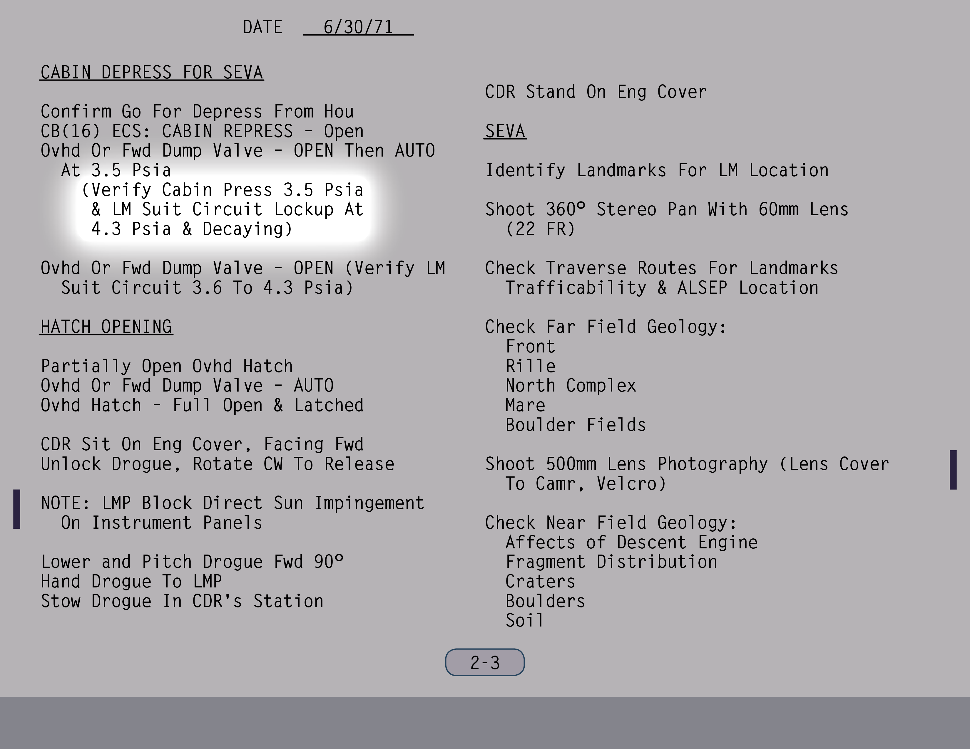 LMLunar Module-Anzugkreislauf hält bei 4,3 psia (0,30 bar) (& fallend) (SUR 2-3). Okay, LM