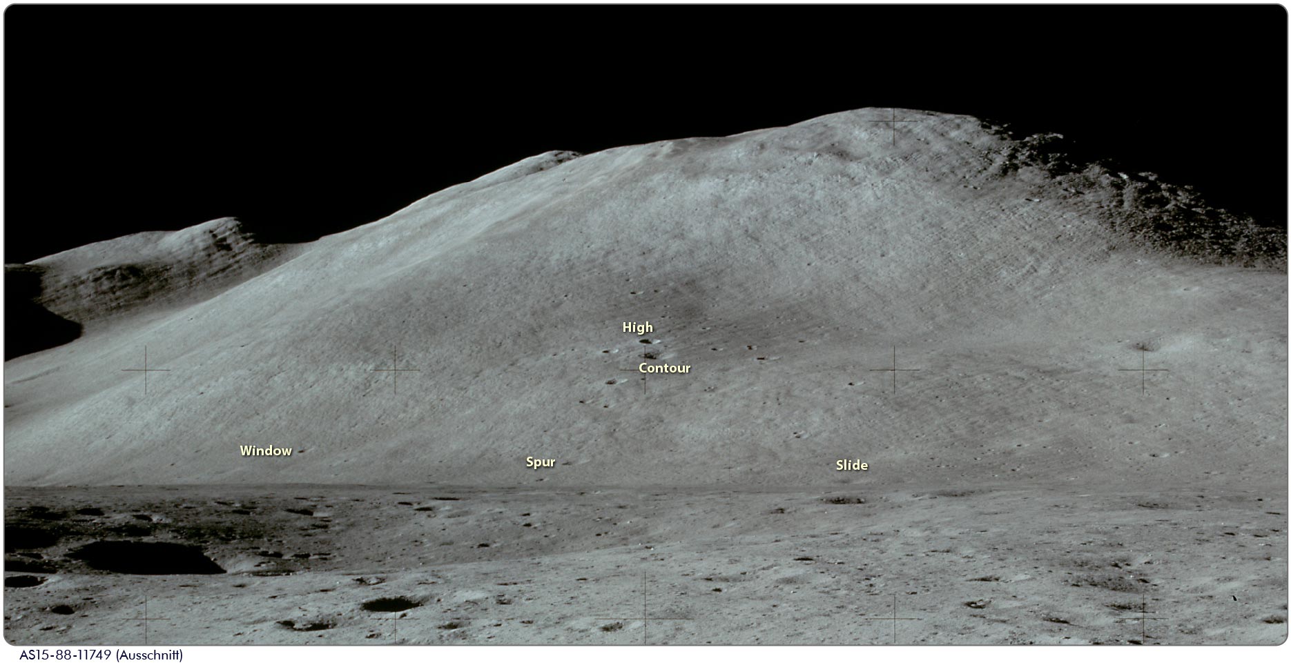EVAExtravehicular Activity. Das Gelände unterschied sich deutlich von unserer Vorstellung davon, die entstanden war, weil keine hochauflösenden Fotos vom Landegebiet existierten. Im Nachhinein muss ich sagen, durch die Kontrastverstärkung wurden auf den Fotos mehr Details sichtbar, als in Wirklichkeit vorhanden waren, was uns etwas in die Irre geführt hat.