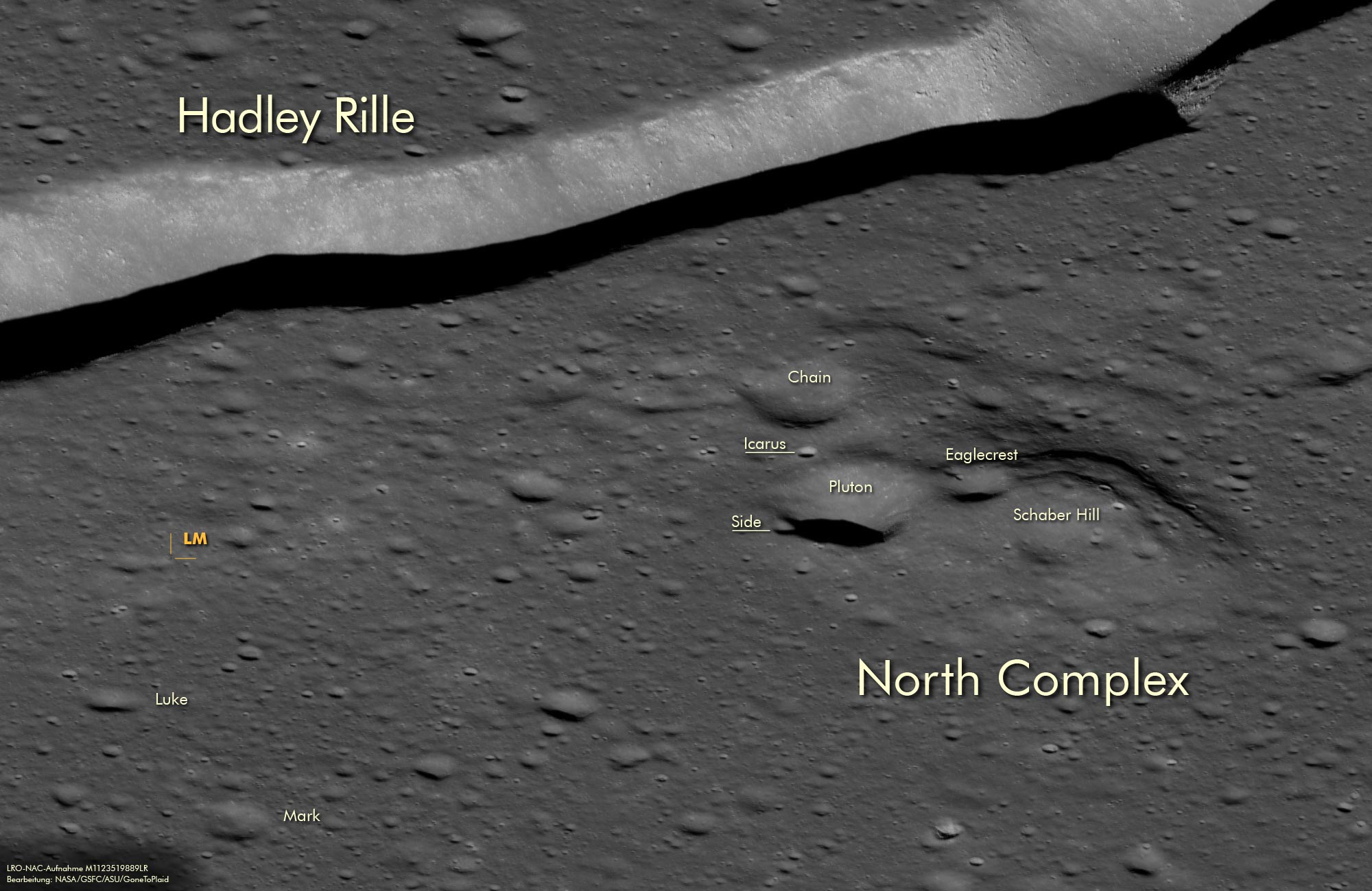 LMLunar Module steht am nordwestlichen Rand von Krater Last. November, ein Krater mit markantem Rand, befindet sich weiter östlich. Die geplante Landestelle liegt außerhalb des Bildausschnitts ca. 200 Meter südlich von Krater Last. Von Stephen Tellier haben wir einen Teil der Aufnahme in höherer Auflösung. Dieser Ausschnitt zeigt die Landefähre und ihre unmittelbare Umgebung.