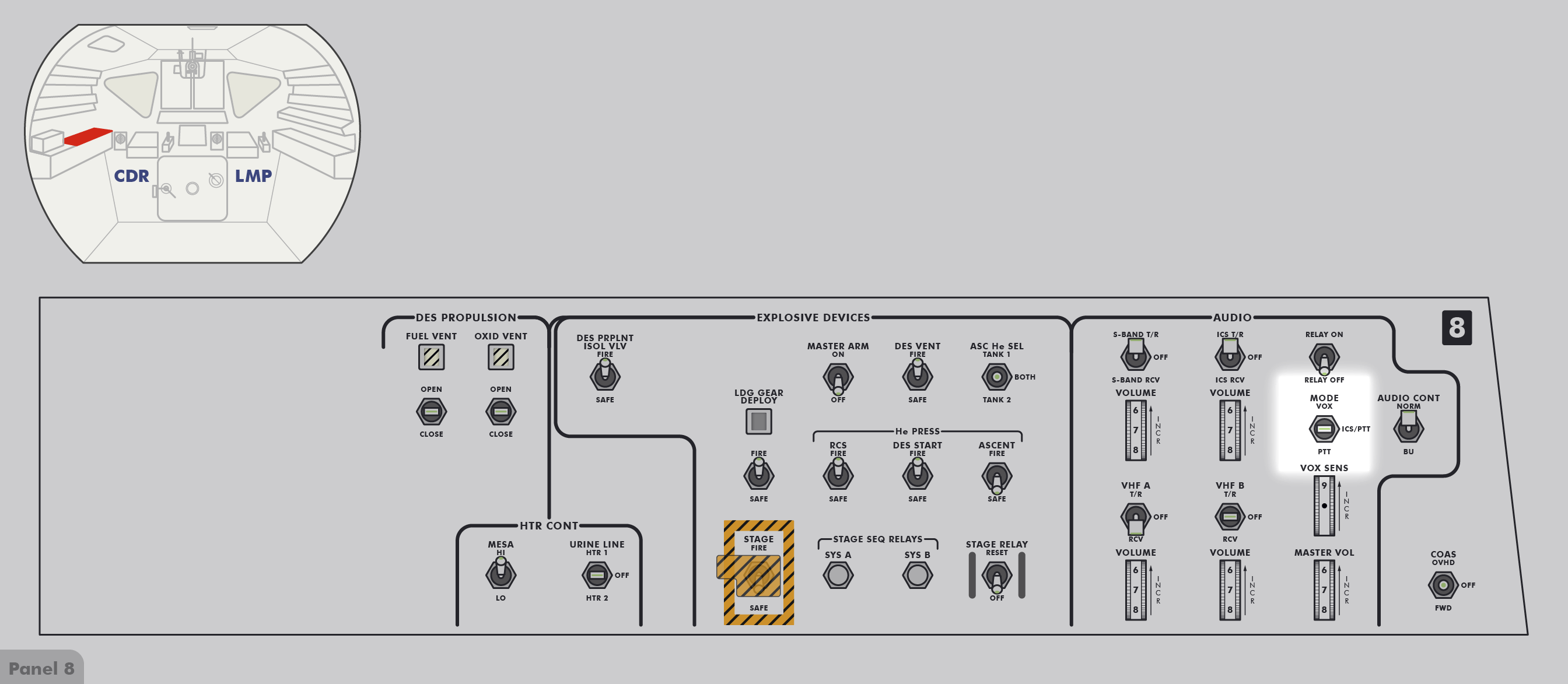 ECSEnvironmental Control System für ihre Schlauchverbindungen zum Anzug unmittelbar vor sich. Er muss eine Vierteldrehung nach links machen, um den Sicherungsschalter auf Paneel 16 neben seiner linken Schulter zu schließen, was durch die vielen Schläuche vor ihm vielleicht nicht so einfach ist.