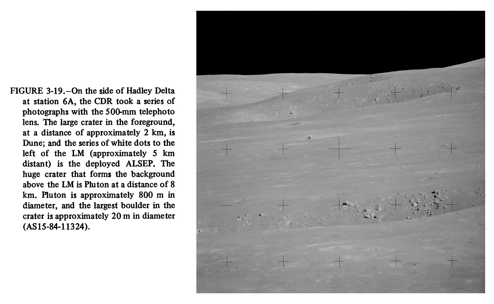 EVAExtravehicular Activity. Das Gelände unterschied sich deutlich von unserer Vorstellung davon, die entstanden war, weil keine hochaufgelösten Fotos vom Landegebiet existierten. Im Nachhinein muss ich sagen, durch die Kontrastverstärkung wurden auf den Fotos mehr Details sichtbar, als in Wirklichkeit vorhanden waren, was uns etwas in die Irre geführt hat.
