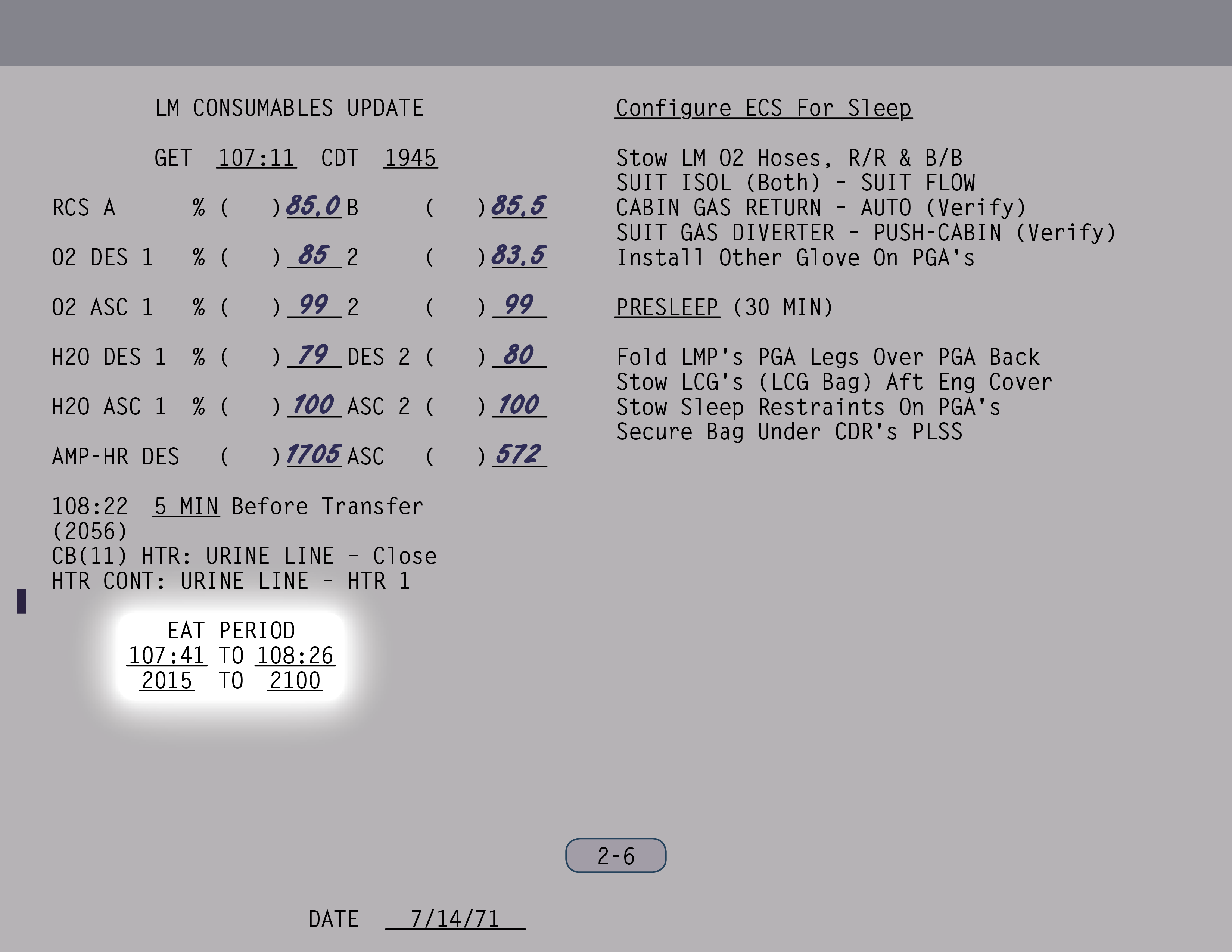 Allen: Verstanden, Jim. Eine Frage, es könnte mit dem kleinen Wasserproblem zu tun haben. Wir würden gerne wissen, ob ihr in einem Krater steht, oder ob die Landefähre geneigt ist, weil möglicherweise das Lurrain eine leichte Steigung hat. Könnt ihr dazu etwas sagen oder habt vielleicht eine Ahnung? Irgendeine Wahrnehmung in der Richtung?