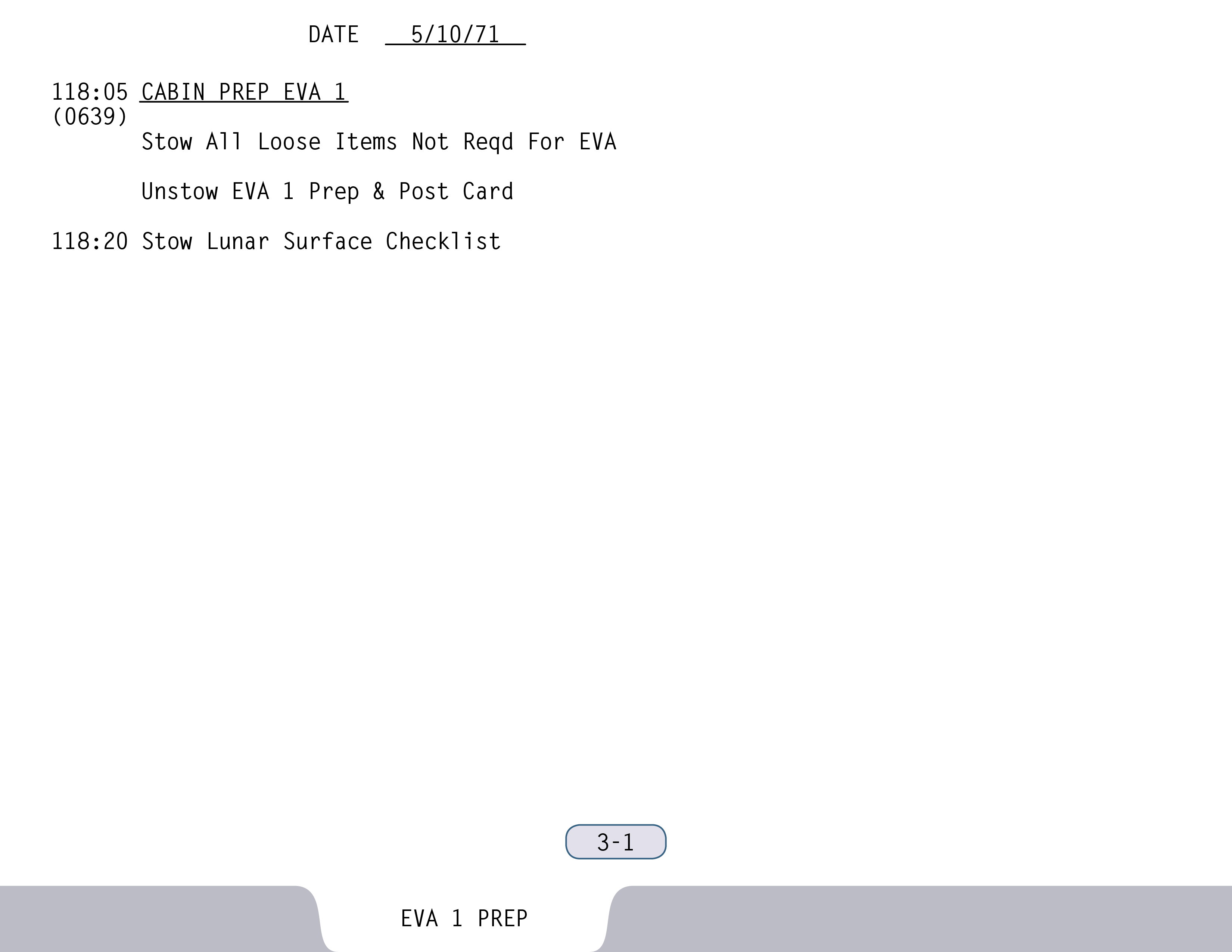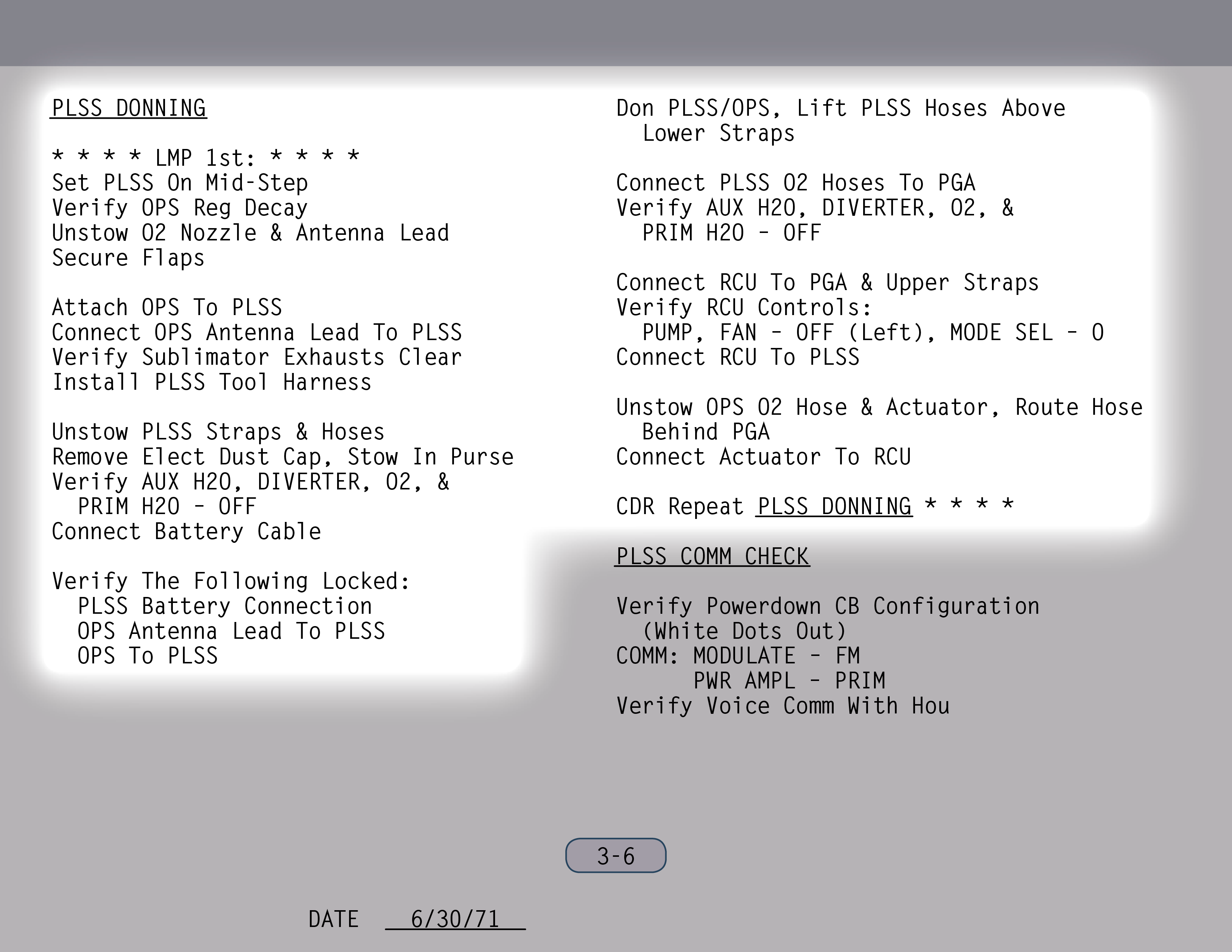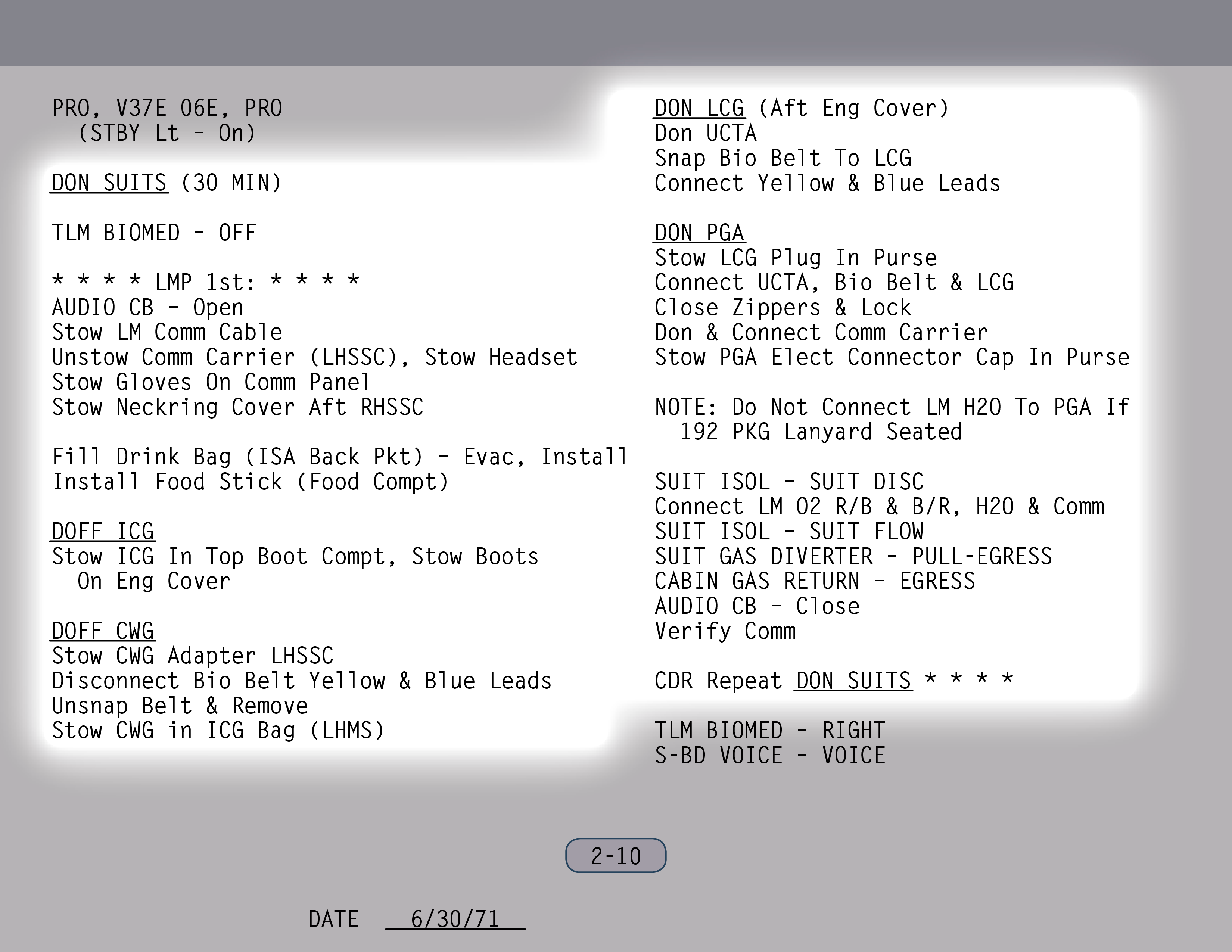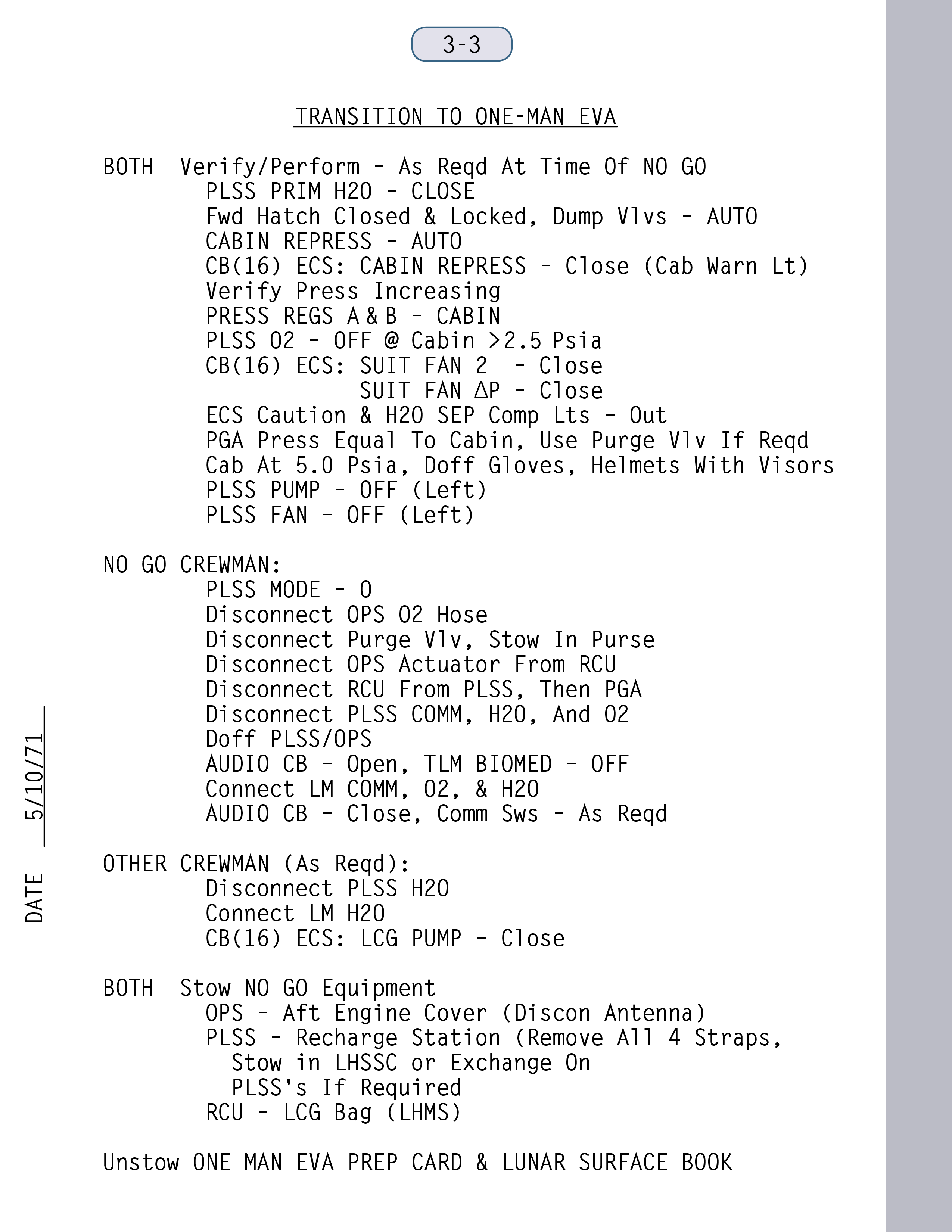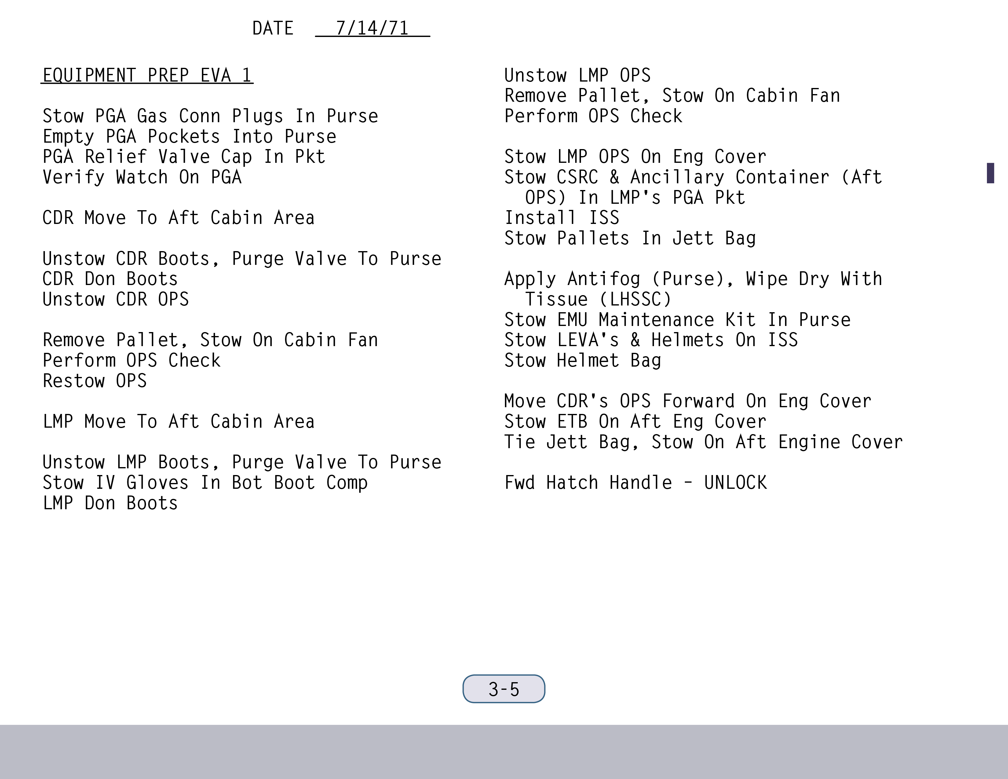EVAExtravehicular Activity. Zwar steht auf der Stichwortkarte nichts anderes als in der Checkliste, doch die Karte können sie vor sich an das Instrumentenpaneel hängen und ablesen, ohne ständig umblättern zu müssen. Die Einträge auf den Seiten SUR 3-2, SUR 3-3 und SUR 3-4 sind für die Vorbereitung irrelevant. Laut SUR 3-5 haben sie ihre Überschuhe für die Mondoberfläche angezogen, jeweils ihr OPS