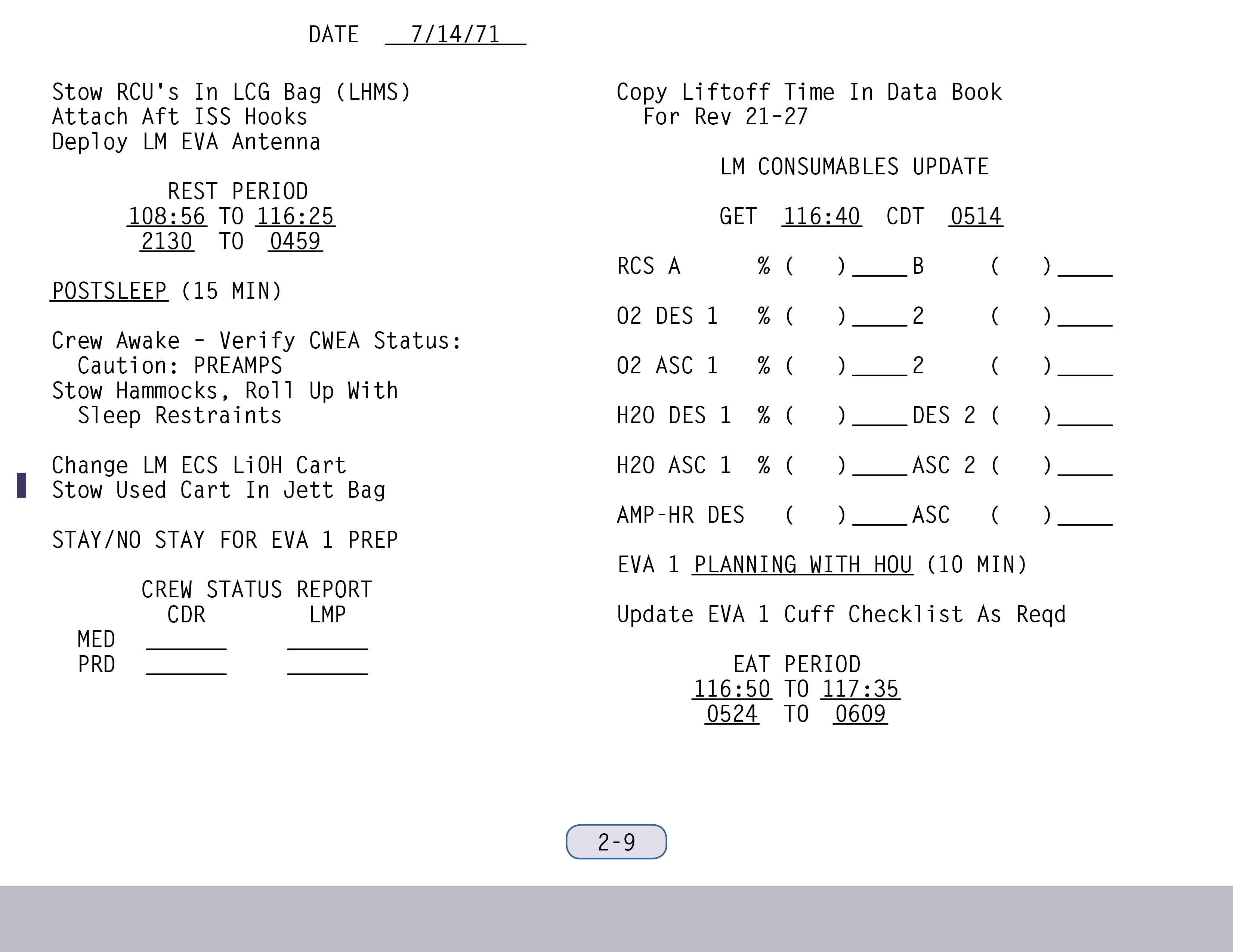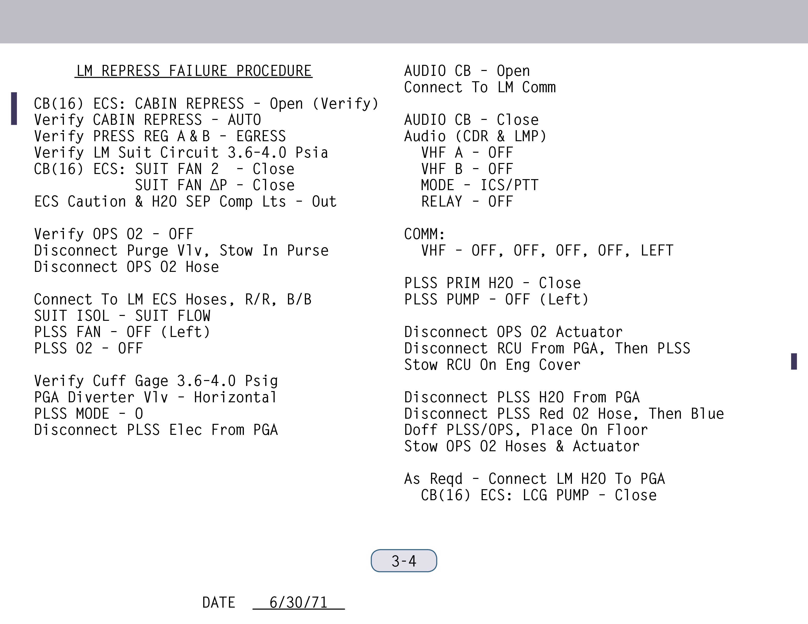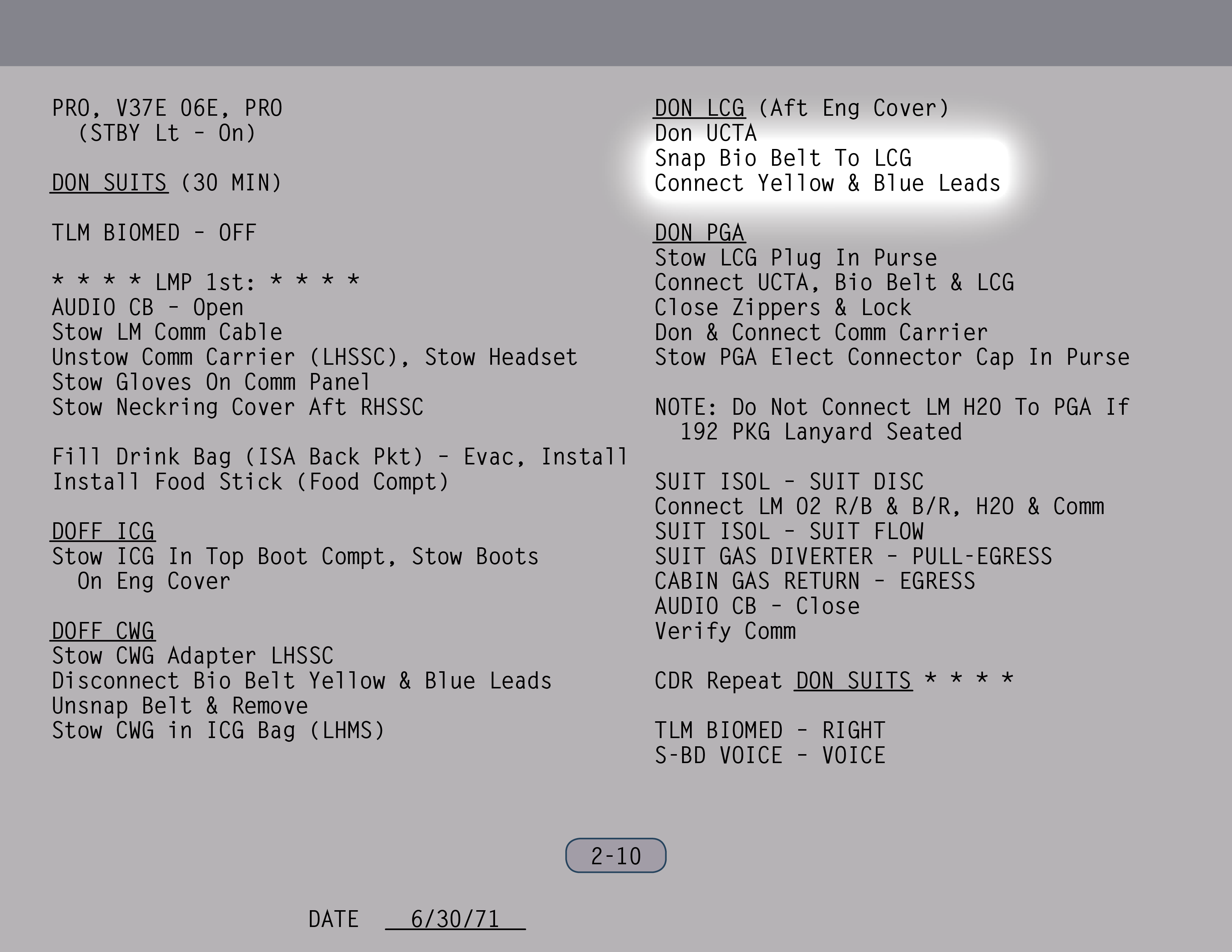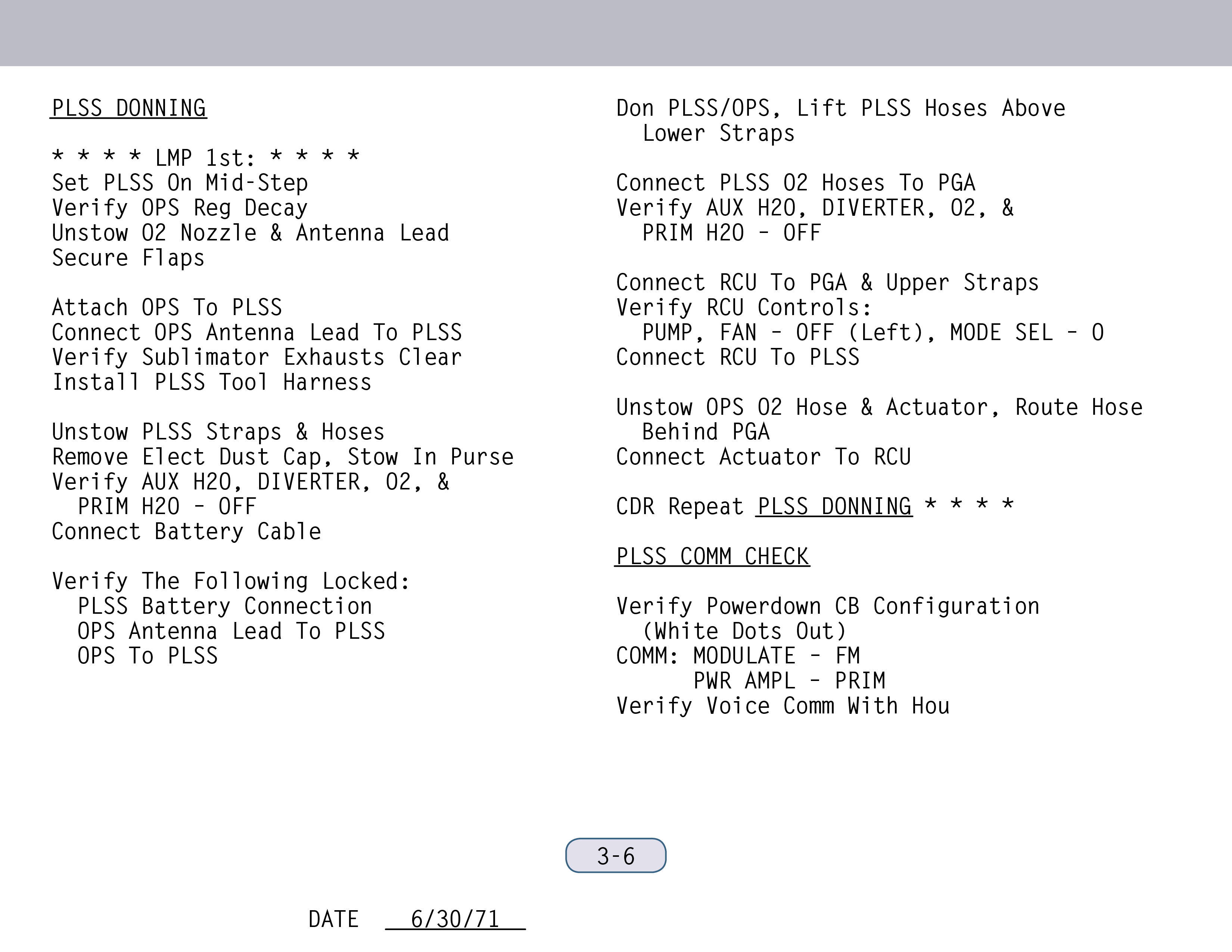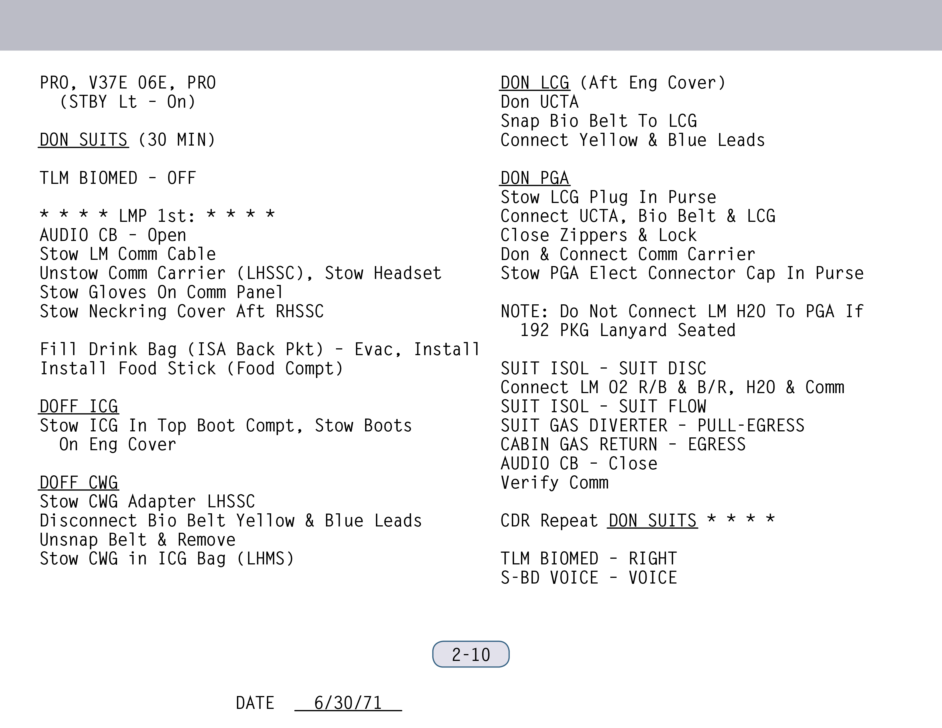 EVAExtravehicular Activity. Zwar steht auf der Stichwortkarte nichts anderes als in der Checkliste, doch die Karte können sie vor sich an das Instrumentenpaneel hängen und ablesen, ohne ständig umblättern zu müssen. Die Einträge auf den Seiten SUR 3-2, SUR 3-3 und SUR 3-4 sind für die Vorbereitung irrelevant. Laut SUR 3-5 haben sie ihre Überschuhe für die Mondoberfläche angezogen, jeweils ihr OPS