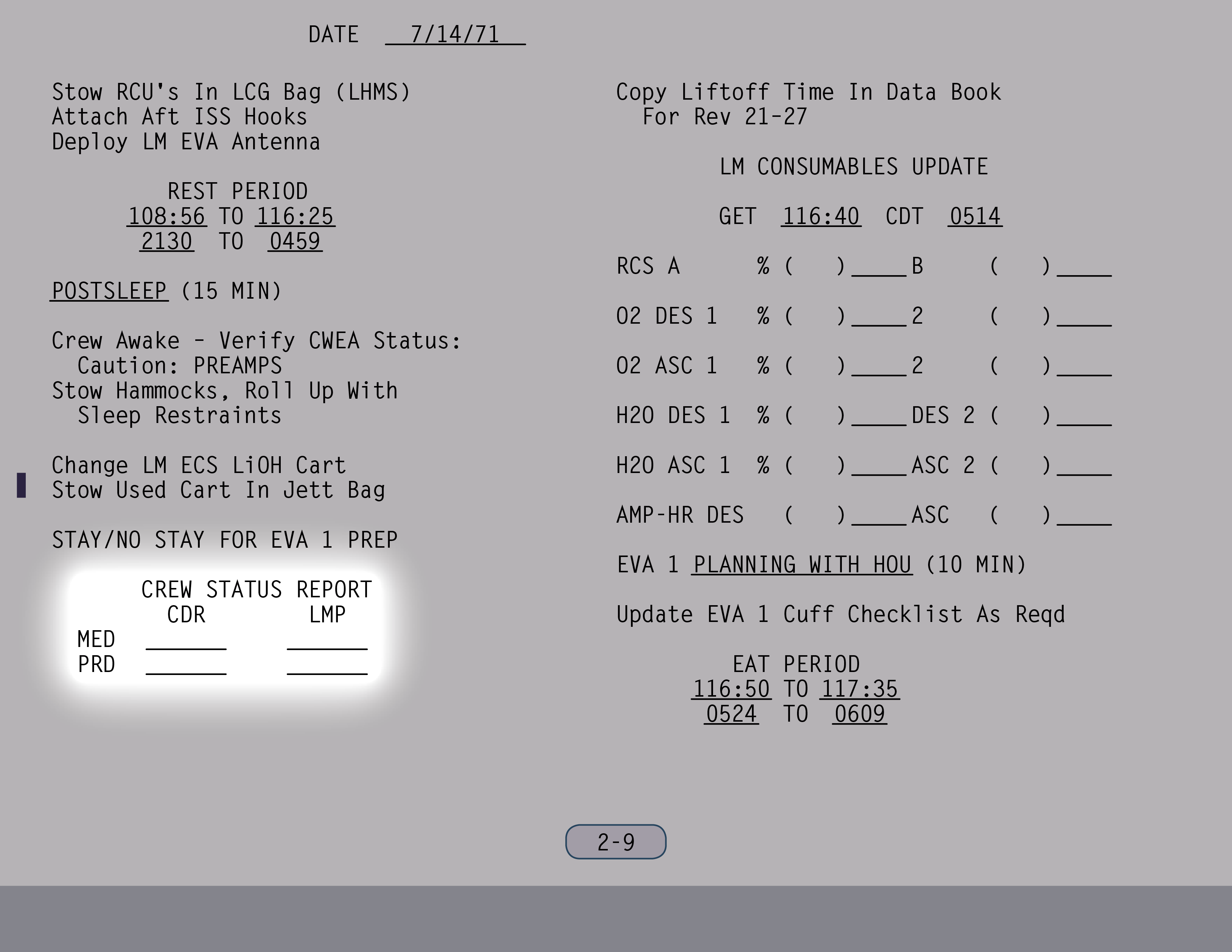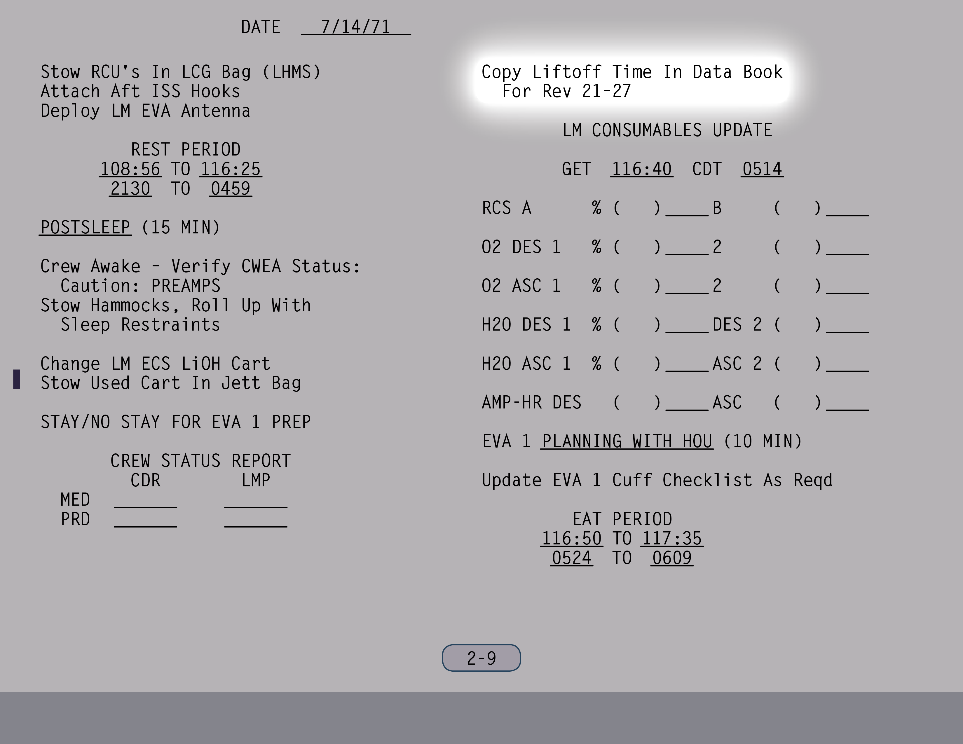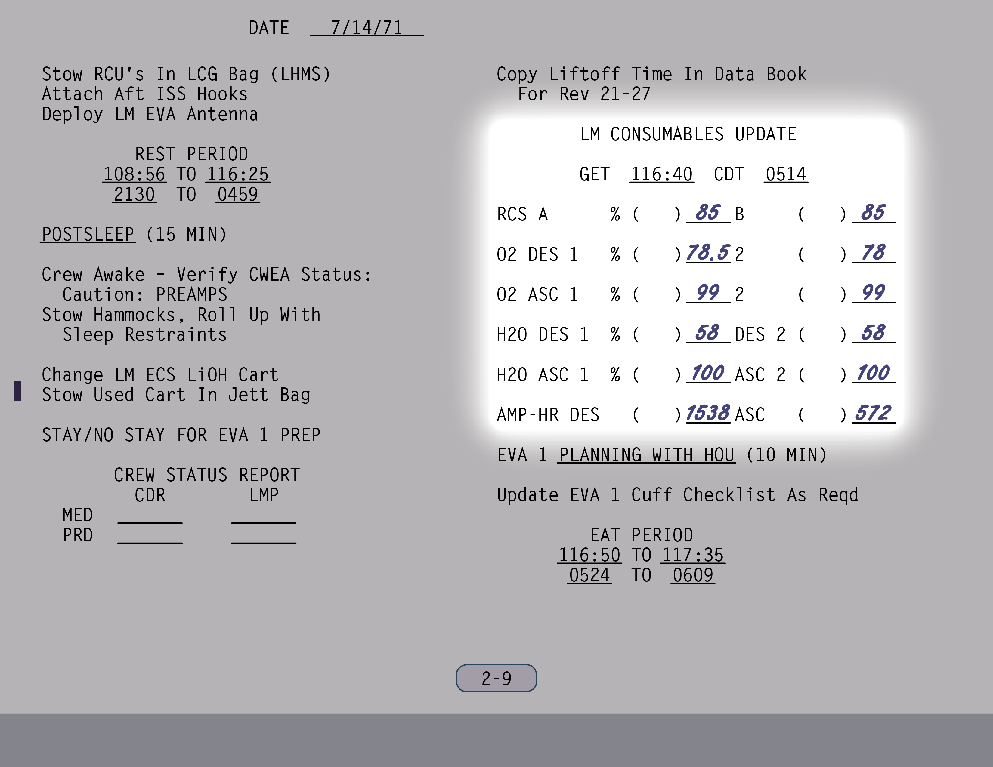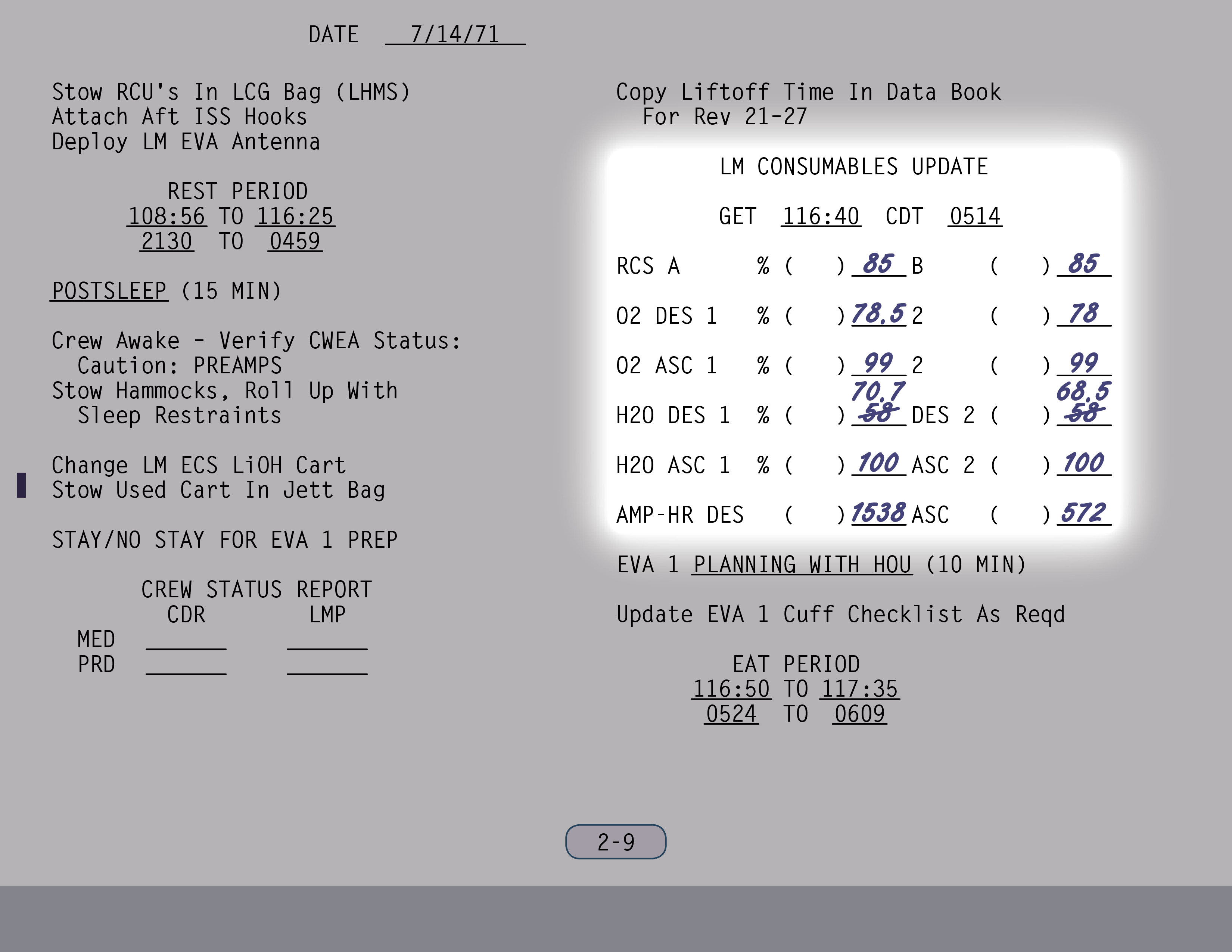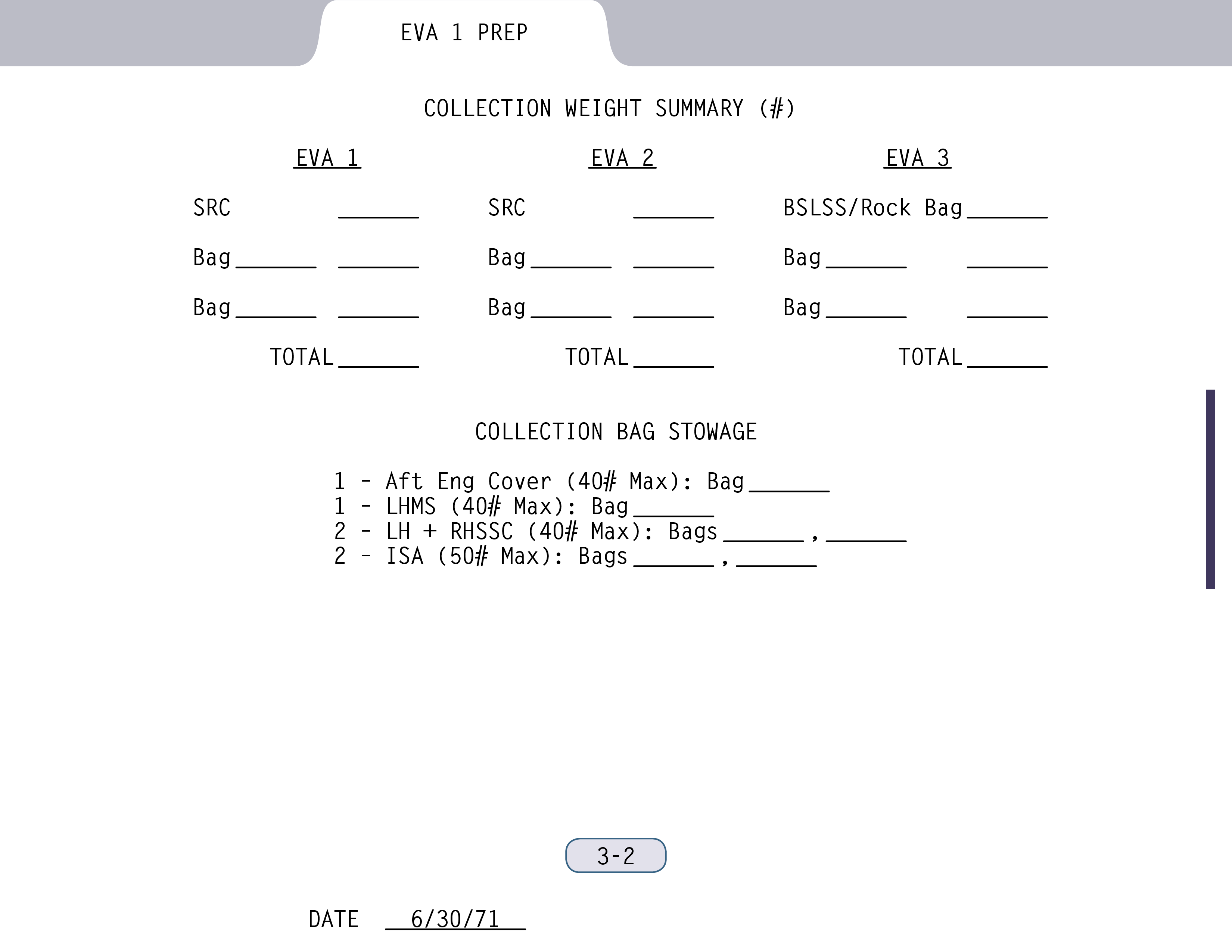 EVAExtravehicular Activity. Zwar steht auf der Stichwortkarte nichts anderes als in der Checkliste, doch die Karte können sie vor sich an das Instrumentenpaneel hängen und ablesen, ohne ständig umblättern zu müssen. Die Einträge auf den Seiten SUR 3-2, SUR 3-3 und SUR 3-4 sind für die Vorbereitung irrelevant. Laut SUR 3-5 haben sie ihre Überschuhe für die Mondoberfläche angezogen, jeweils ihr OPS