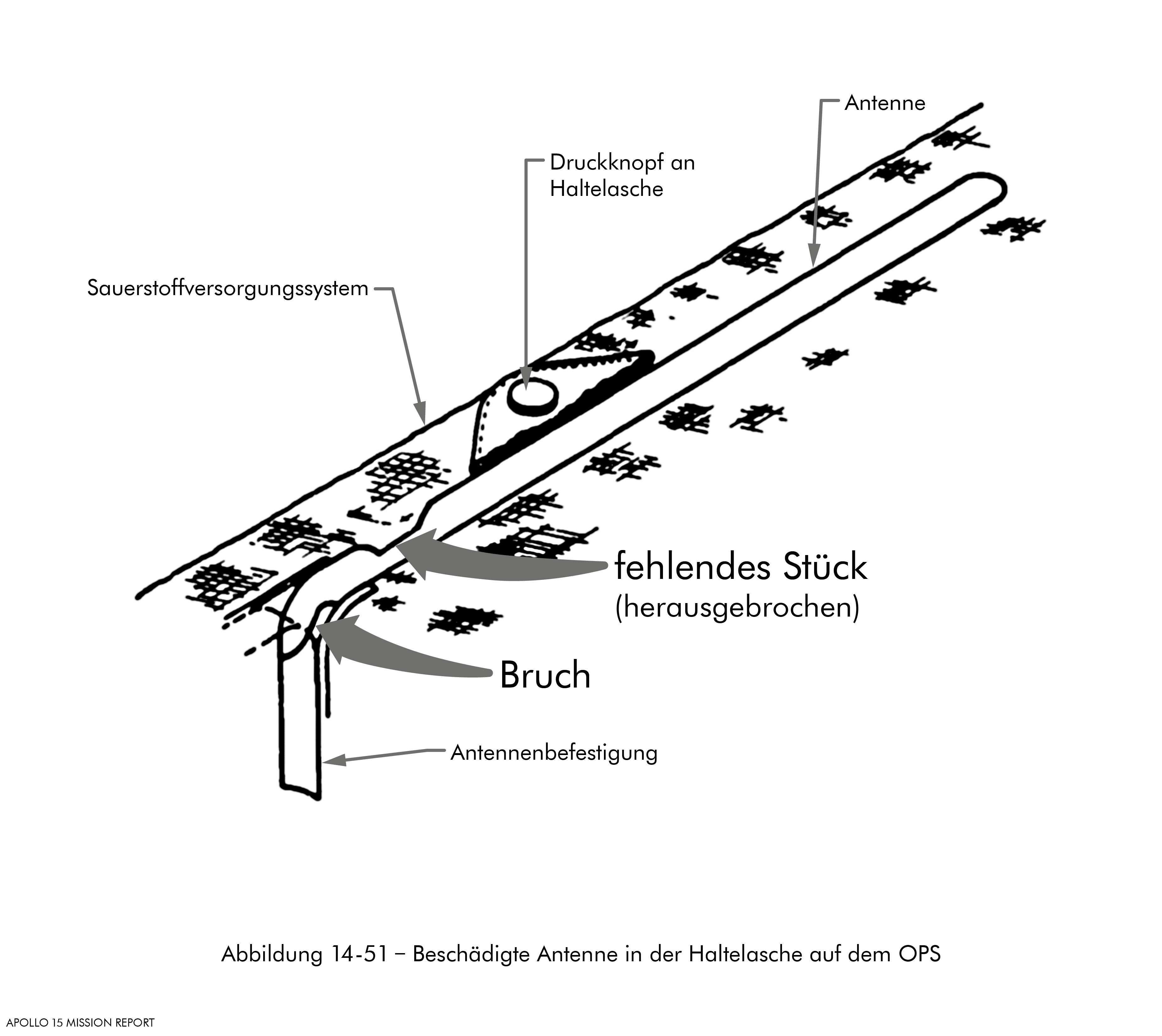 EVAExtravehicular Activity tatsächlich ganz abgebrochen. Glücklicherweise hat sich die Funkverbindung dadurch aber nicht merklich verschlechtert. Abbildung 14-51 des Missionsberichts zu Apollo 15 (Apollo 15 Mission Report) zeigt die Beschädigungen an der Antenne.