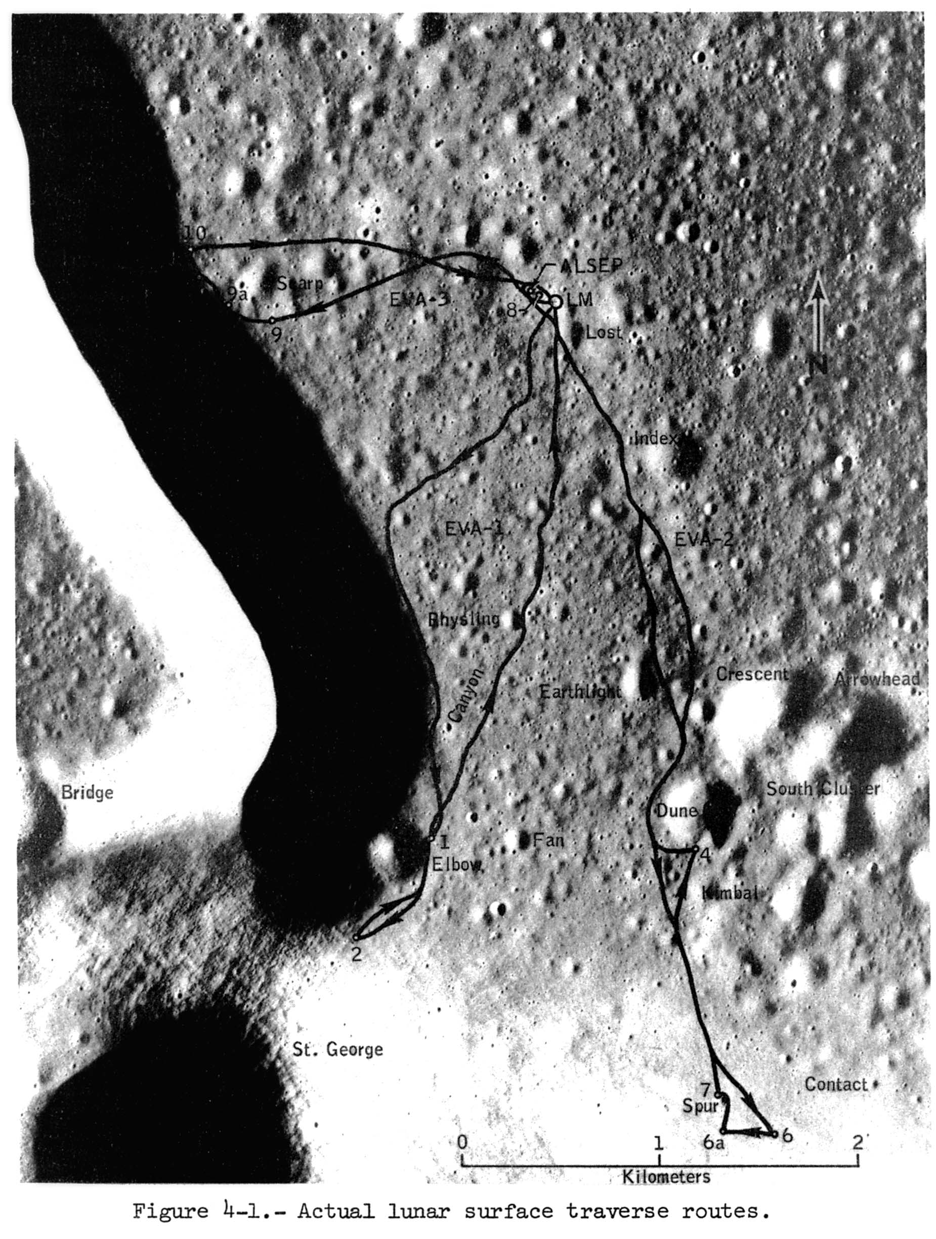 Von Krater November aus, wo man in Houston die Landestelle vermutet (siehe ), würden sie bei Fahrtrichtung 208 mehr oder weniger genau auf Krater Elbow treffen. Von ihrer tatsächlichen Landestelle aus erreichen sie in dieser Richtung südlich von Krater Quadrant den Rand der Rille. Quadrant ist der Krater bei den Koordinaten BN,0/70,2 auf Jims Karte.