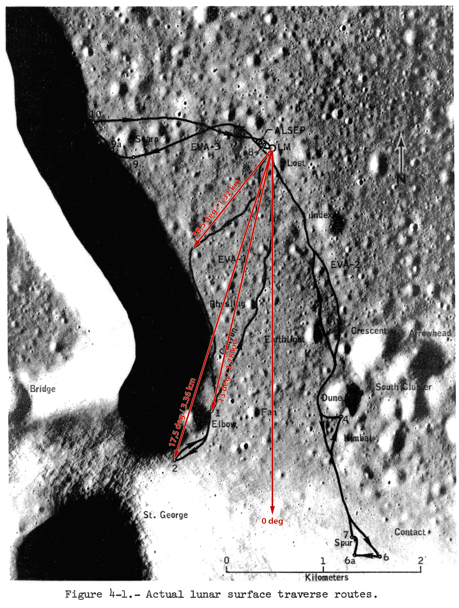 Laut Abbildung 4-1 im Missionsbericht (Apollo 15 Mission Report) ergeben sich für Station 1 folgende Positionsdaten in Bezug auf das LM