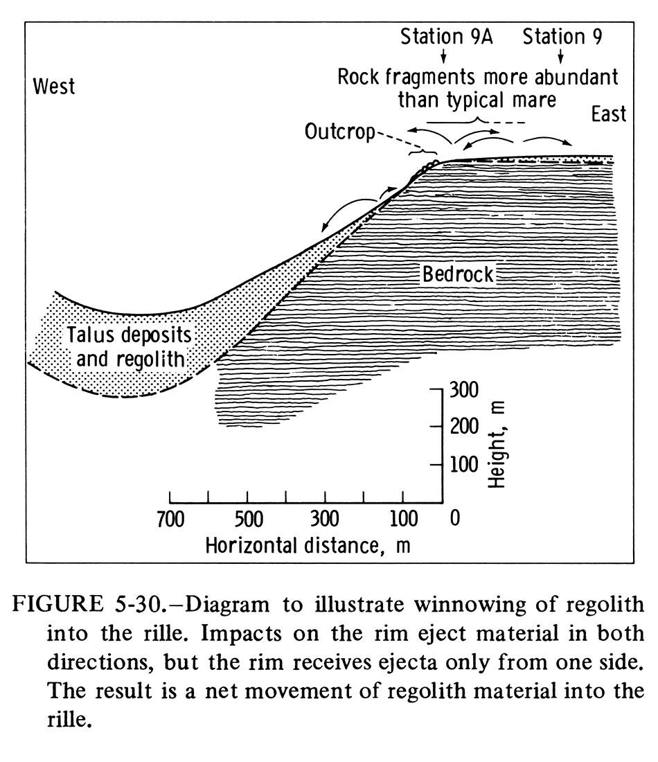 In der Technischen Nachbesprechung am (Apollo 15 Technical Crew Debriefing – ) sagte Jim, dass der östliche Rand von Krater Elbow weitgehend abgetragen