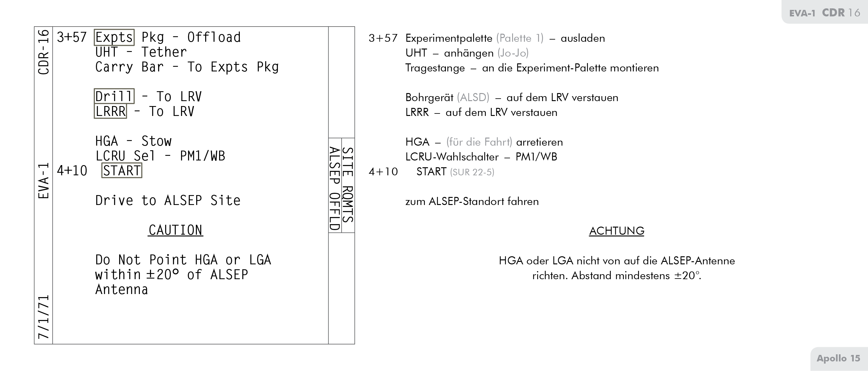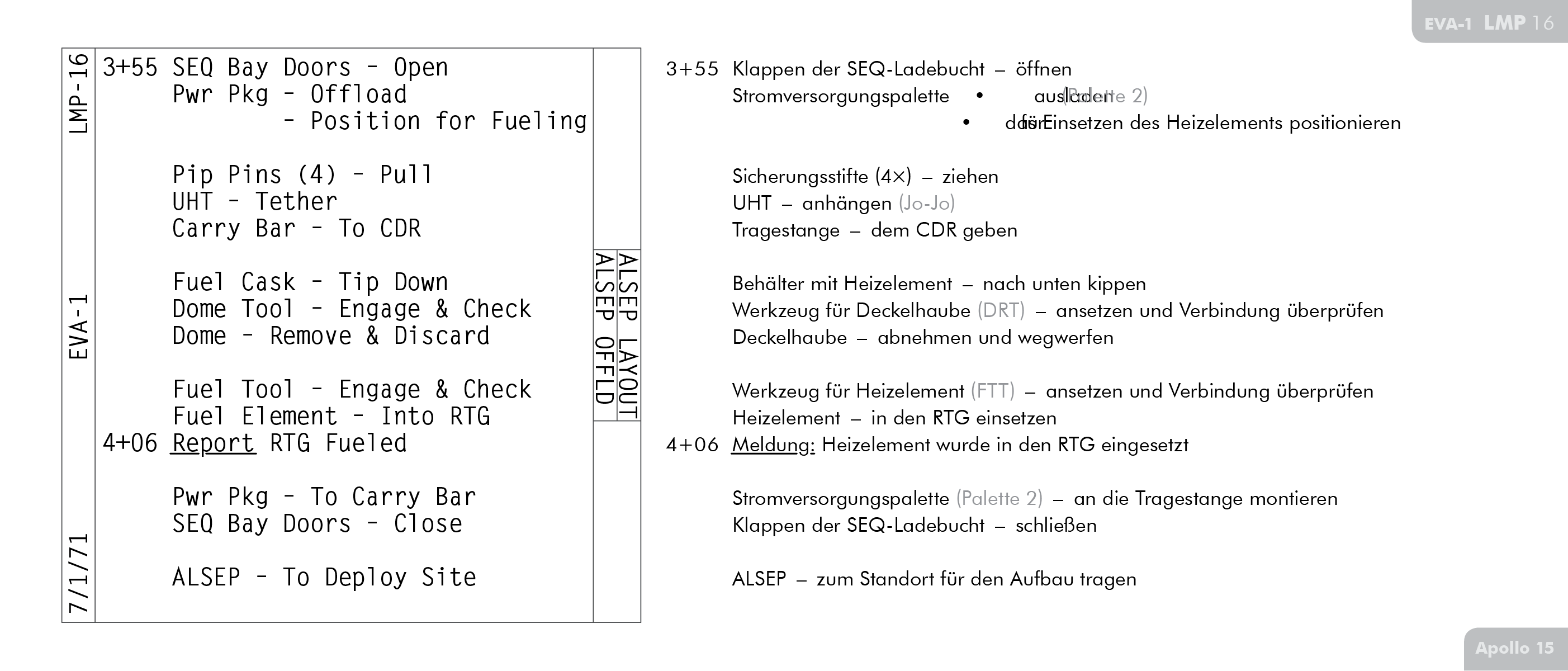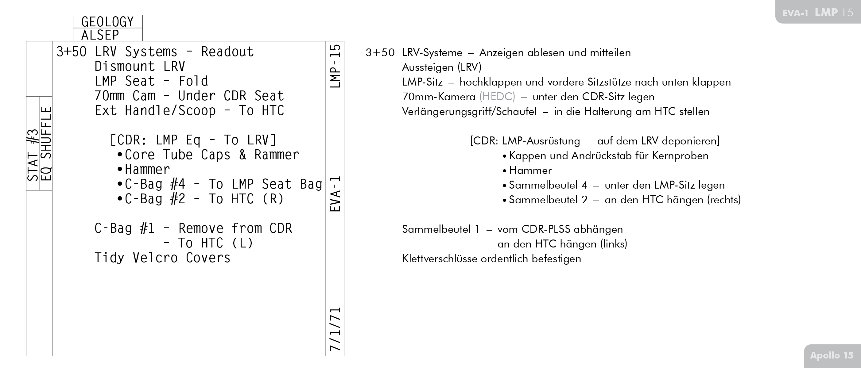 LMLunar Module findet sich auf Seite 71 im Ablaufplan für die Arbeit auf der Mondoberfläche bei Apollo 15 (Apollo 15 Final Lunar Surface Procedures).