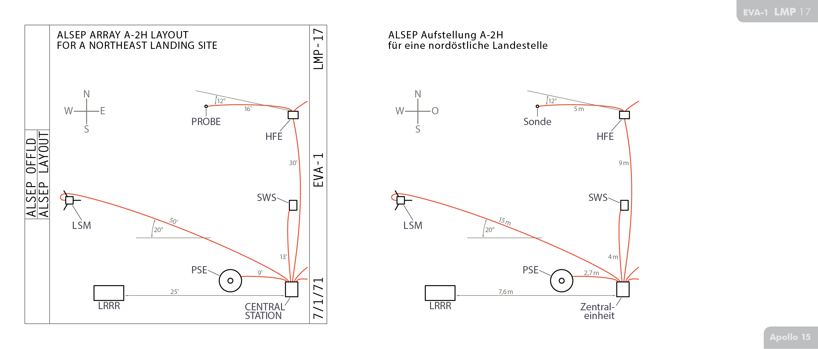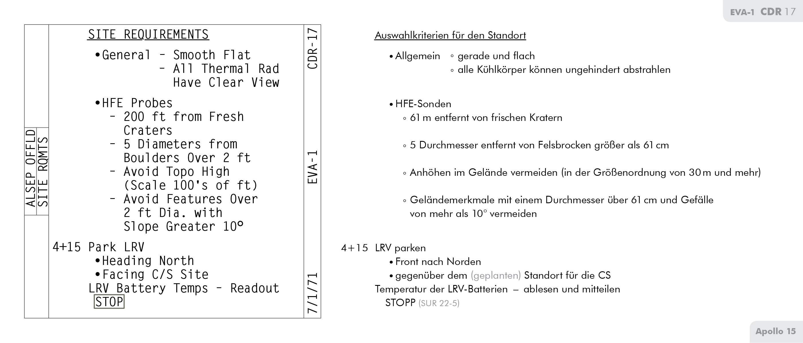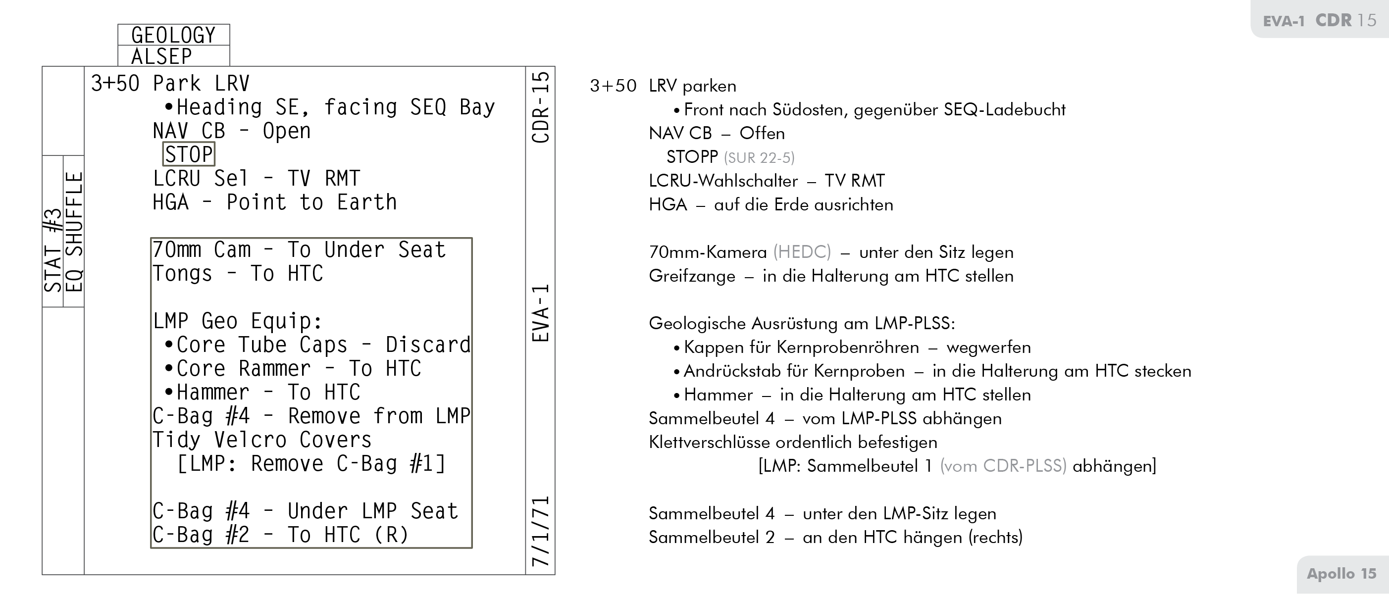 LMLunar Module findet sich auf Seite 71 im Ablaufplan für die Arbeit auf der Mondoberfläche bei Apollo 15 (Apollo 15 Final Lunar Surface Procedures).