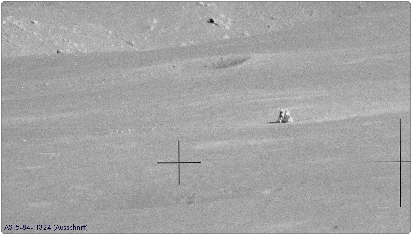 LMLunar Module entfernt bei Azimut 297. Auf AS15-84-11324 (Ausschnitt) ist das ALSEP