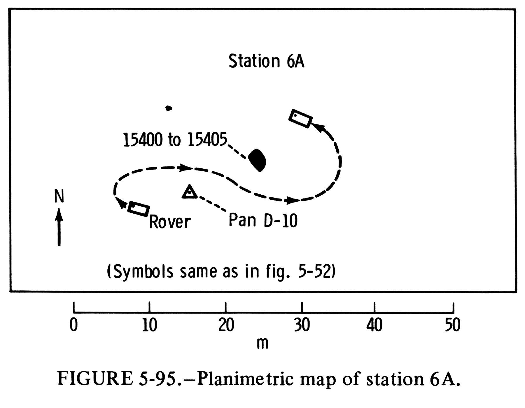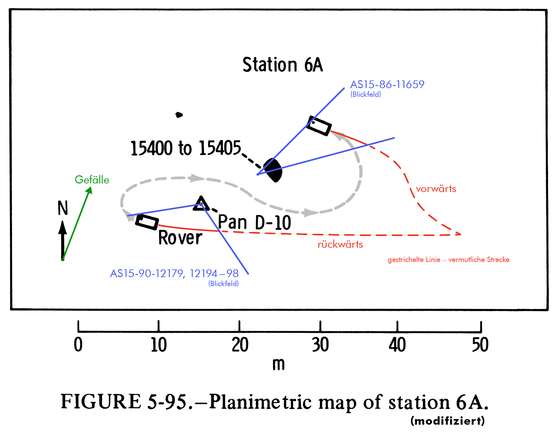 Dave und Jim verließen Station 6A bei und erreichten Krater Spur bei . Die rund 230 Meter Luftlinie wurden demnach in und zurückgelegt, was im Schnitt 4,9 km/h ergibt. Das ist ungefähr die Hälfte des normalen Durchschnittstempos. Auf AS15-90-12214, einem Foto aus Jims Panoramabildserie bei Station 7, sieht man Station 6A bzw. den Felsbrocken rechts oben in Bildfeld D4. Weil auch die Reifenspuren größtenteils zu erkennen sind, lässt sich beinah der gesamte Streckenverlauf nachverfolgen. An der Stelle, wo die Spuren den rechten Bildrand fast berühren, ist Jim vielleicht eingestiegen.