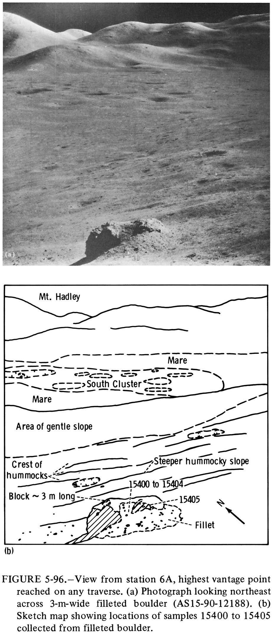 Auf AS15-86-11661 sieht man Daves Greifzange in der Anschüttung stecken, die sich an der Südwestseite des Steins gebildet hat. Das Lockermaterial (Proben 15400–15404) stammt vom oberen Teil der Anschüttung, die Gesteinsprobe (Probe 15405) von der rechten Seite des Felsbrockens, wie ein Vergleich der Aufnahmen AS15-86-11659 und AS15-86-11660 bzw. AS15-86-11658 und AS15-86-11661 zeigt.