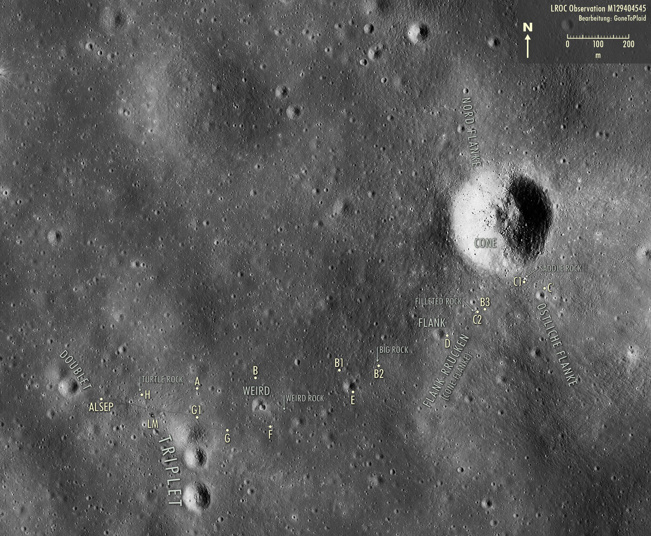verzichten musste. Das kleine hügelige Areal sich überlappender Krater und Ejektadecken nördlich der geplanten Landestelle bekam von mir die Bezeichnung Nord-Gruppe, als ich Monate vor der Mission eine detaillierte geologische Karte des Landgebiets im Maßstab 1:12.500 erarbeitete. Beim USGS
