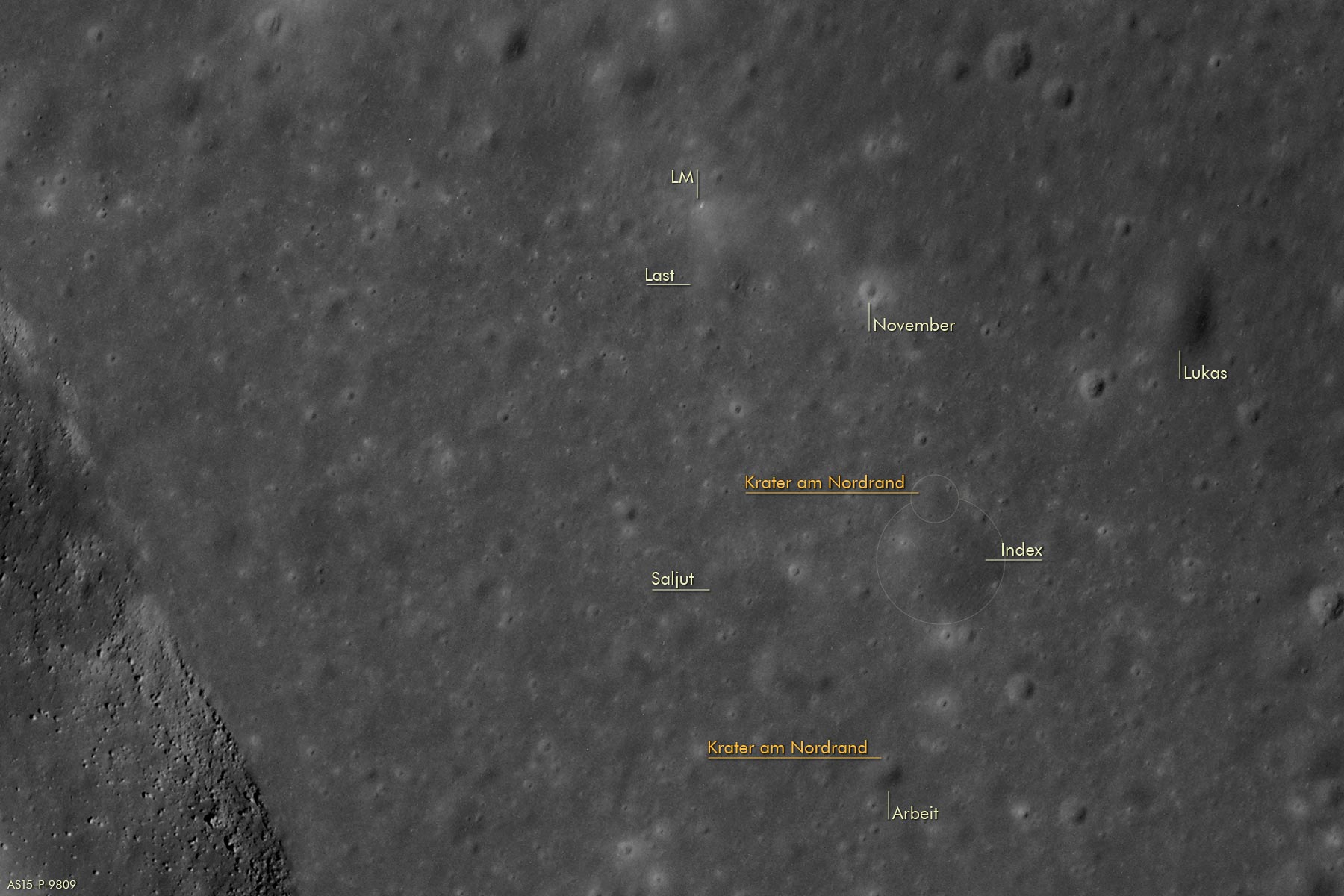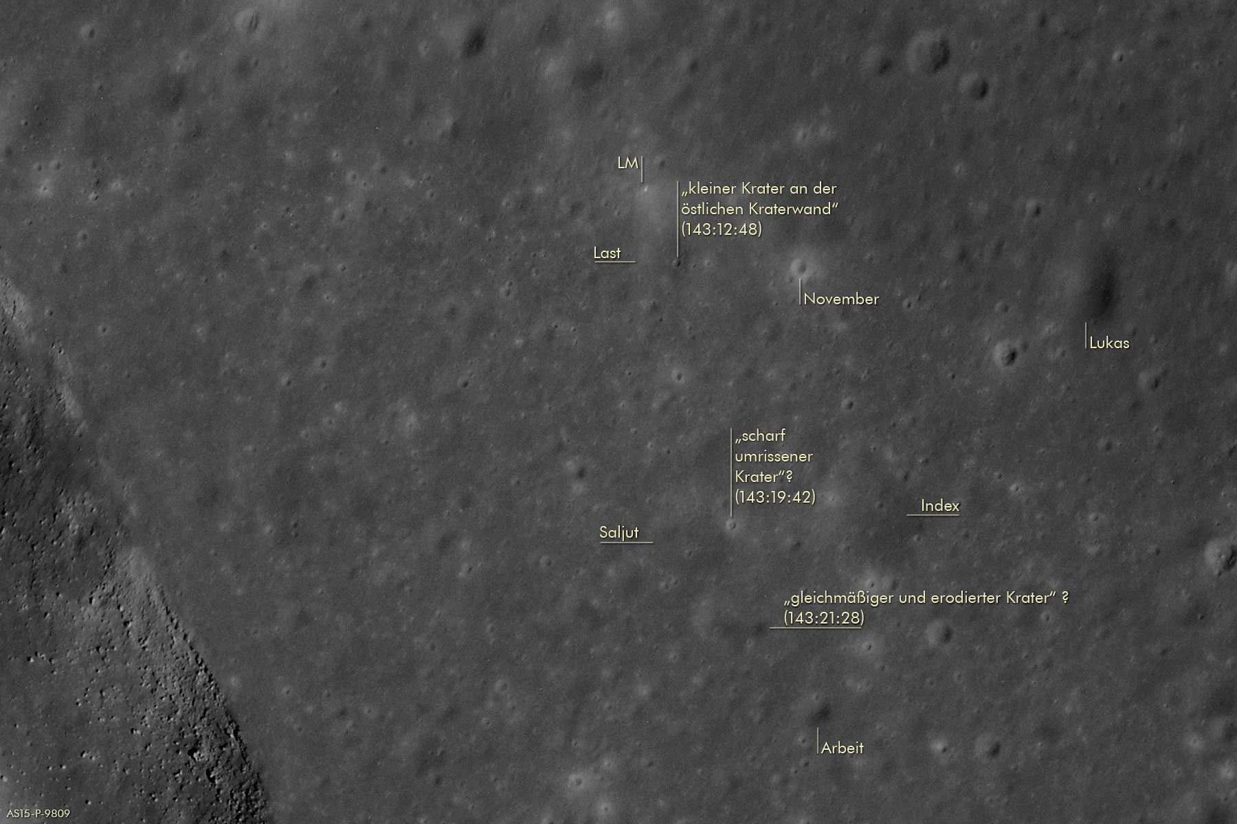 USGSUnited States Geological Survey in Flagstaff hatte ich die Verantwortung für die Herstellung des Kartenmaterials, das bei Apollo 15 auf dem Mond verwendet werden sollte. Diese Hügel eigneten sich hervorragend als Bezugspunkt in größerer Entfernung und wir empfahlen den Astronauten, während des Landeanflugs darauf zu achten. Deshalb wurde die Nord-Gruppe im Geologischen Kartenwerk für die Mondoberfläche deutlich gekennzeichnet.