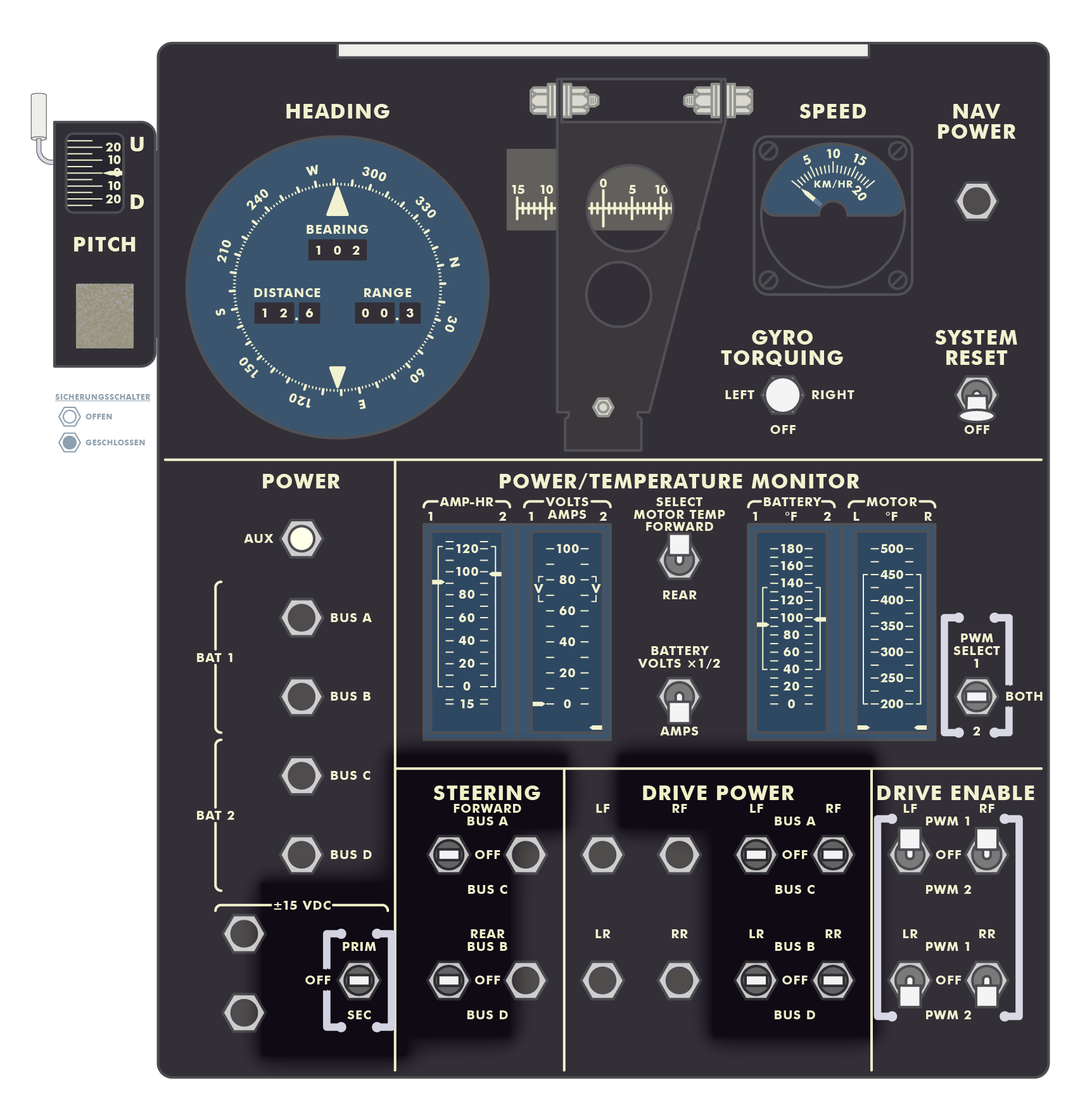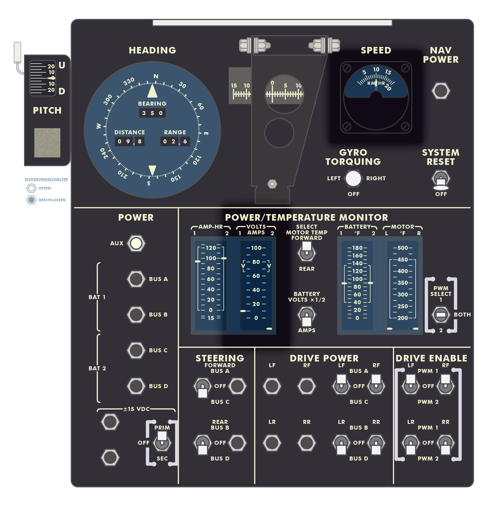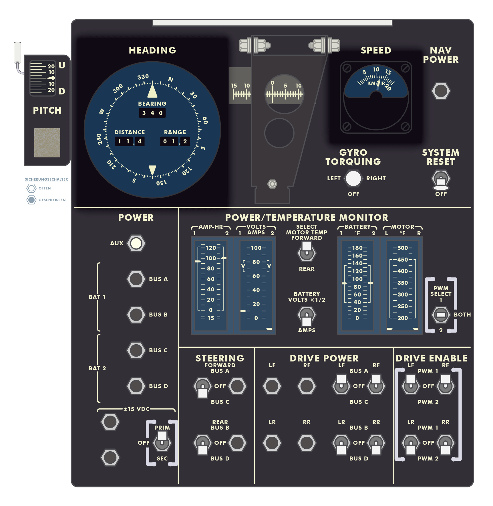 Scott: Bremse ist angezogen, (Motor-)Stromversorgung ist ausgeschaltet. (LRV-Paneel, SUR 22-5)