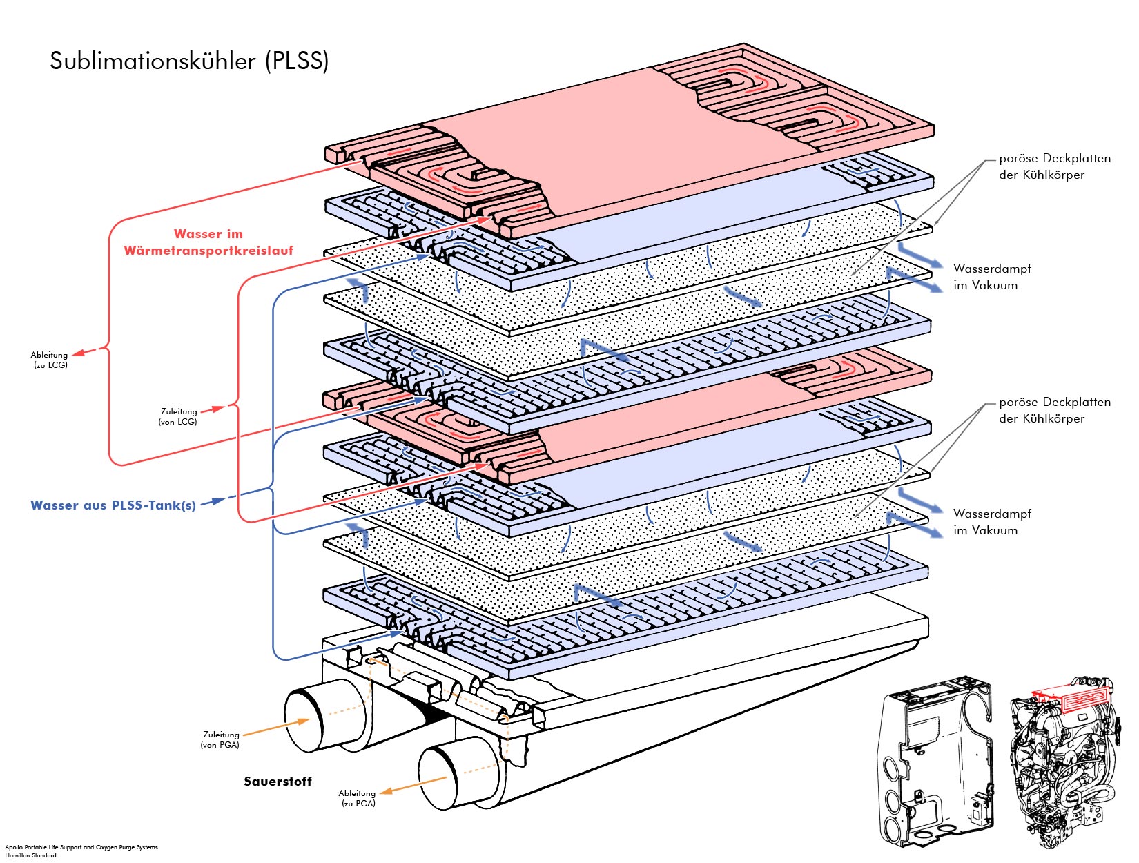 PLSSPortable Life Support System eine geringe Menge Wasser durch den Sublimationskühler ausgelaufen ist, weil das Wasserversorgungsventil nicht vollständig geschlossen war, als der Kabinendruck wiederhergestellt wurde. Mit Helmkanal