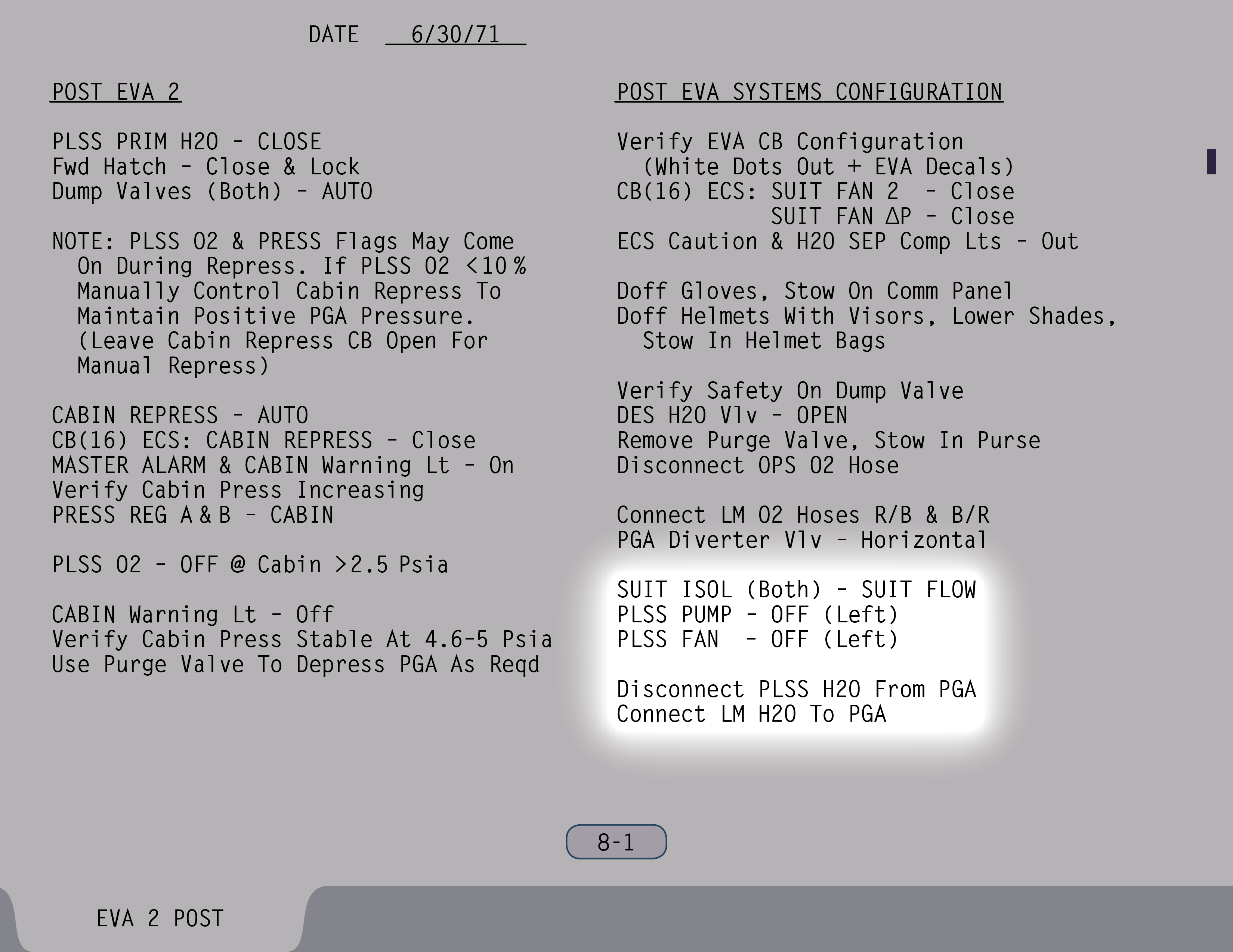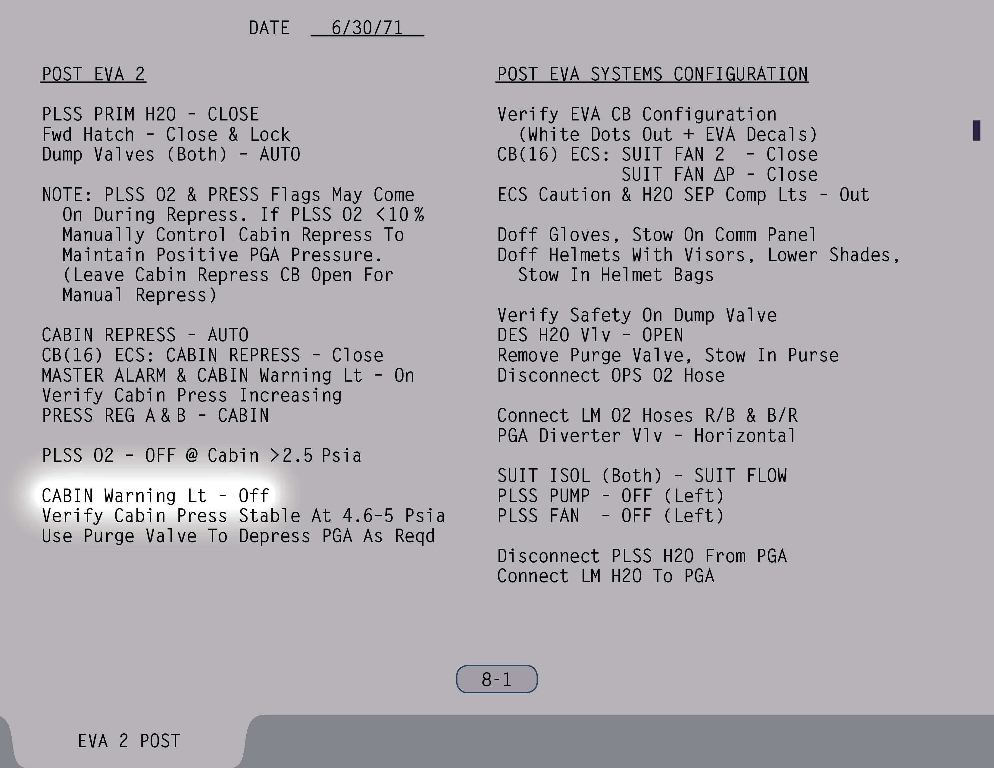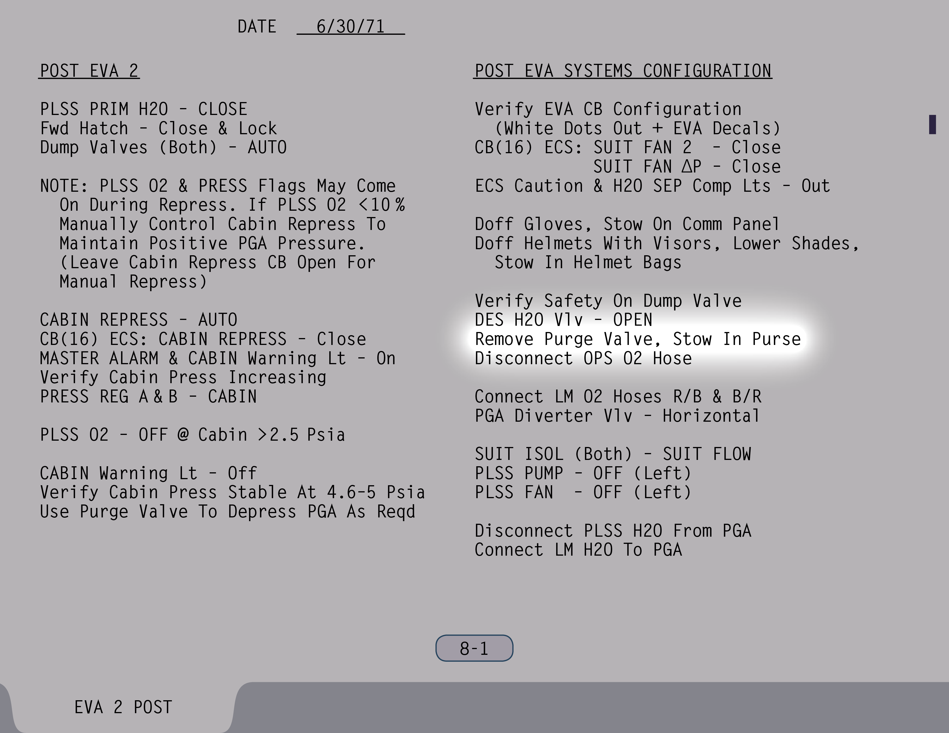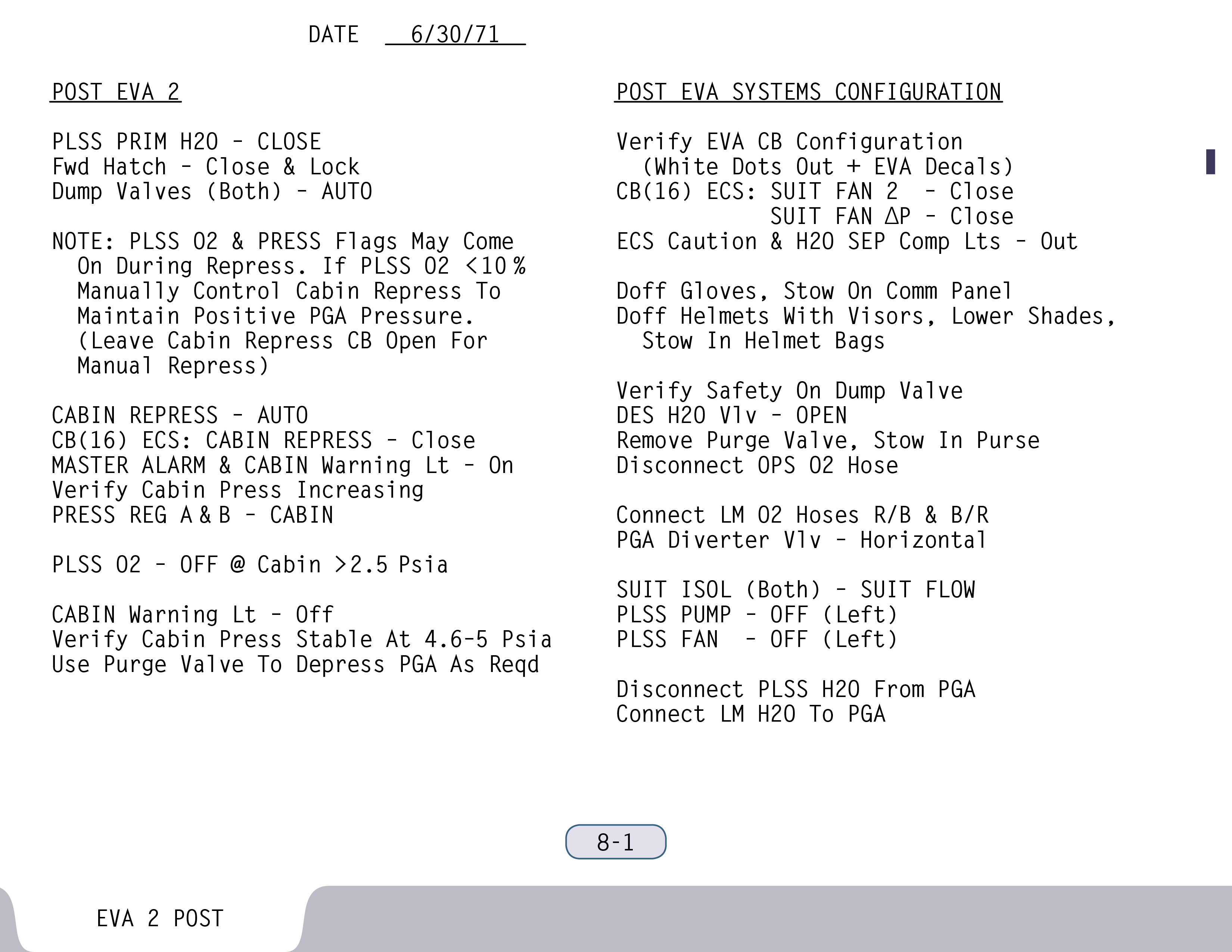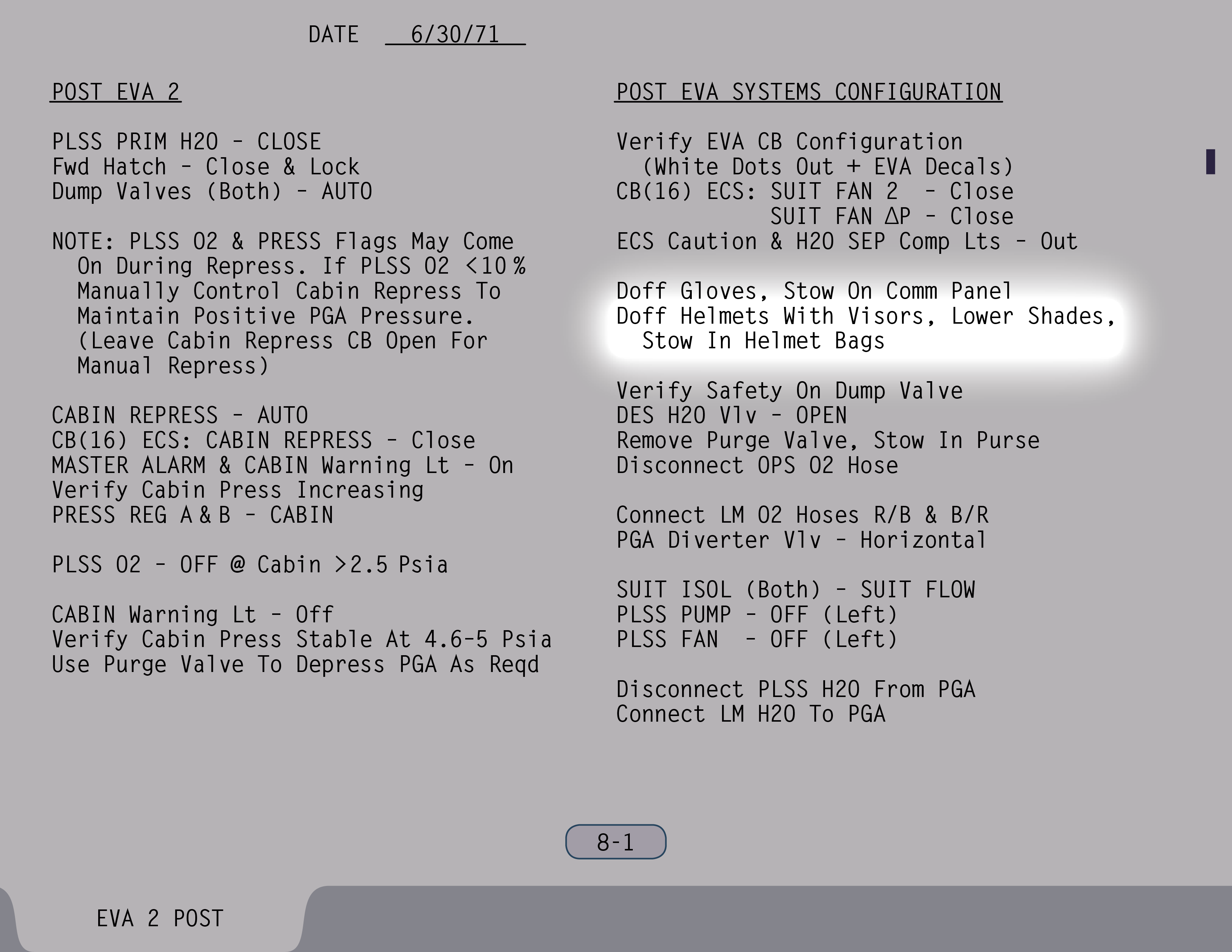 Damit ist Seite SUR 8-1 der Checkliste für den Aufenthalt auf der Mondoberfläche bei Apollo 15 (Apollo 15 LM Lunar Surface Checklist) abgearbeitet.